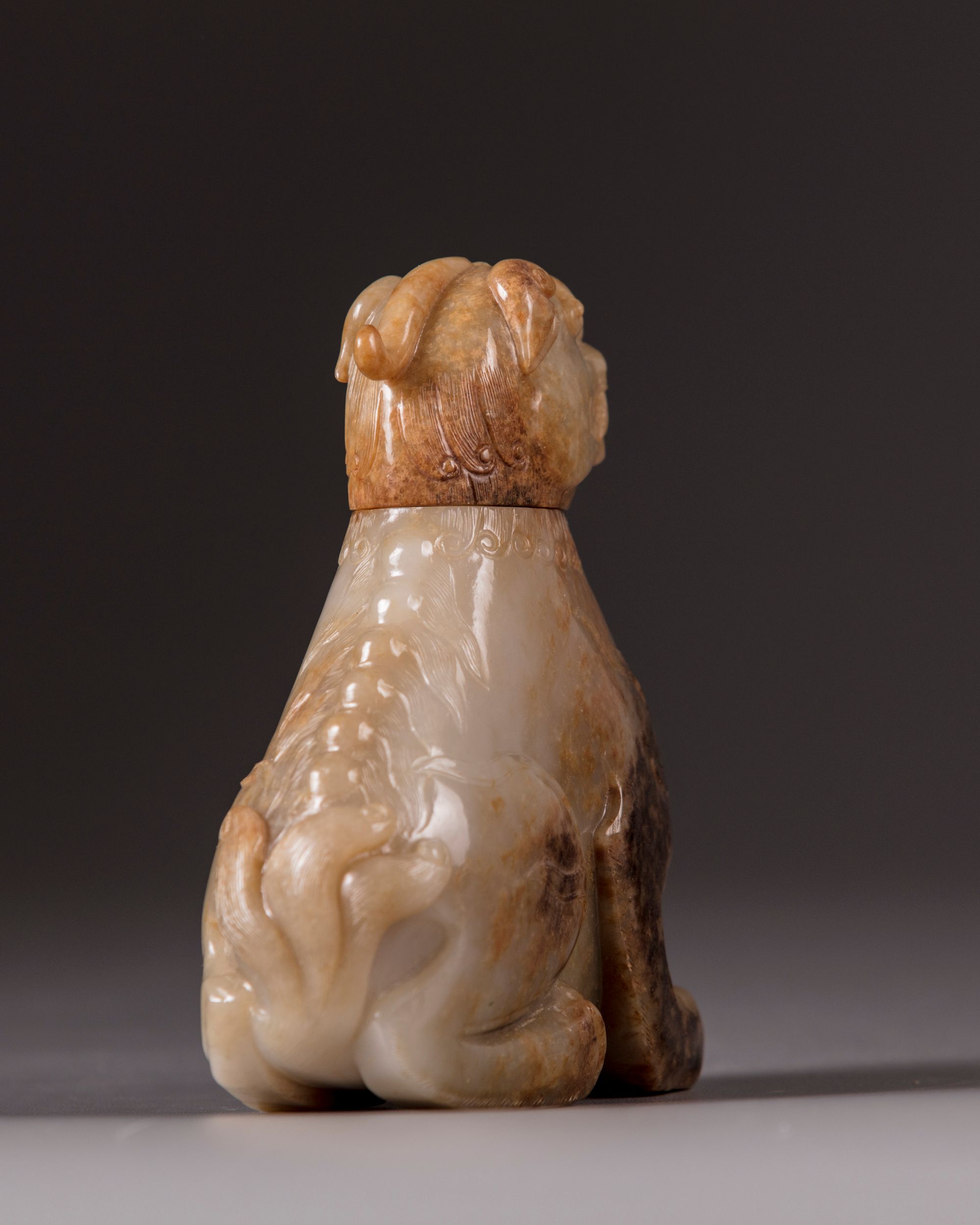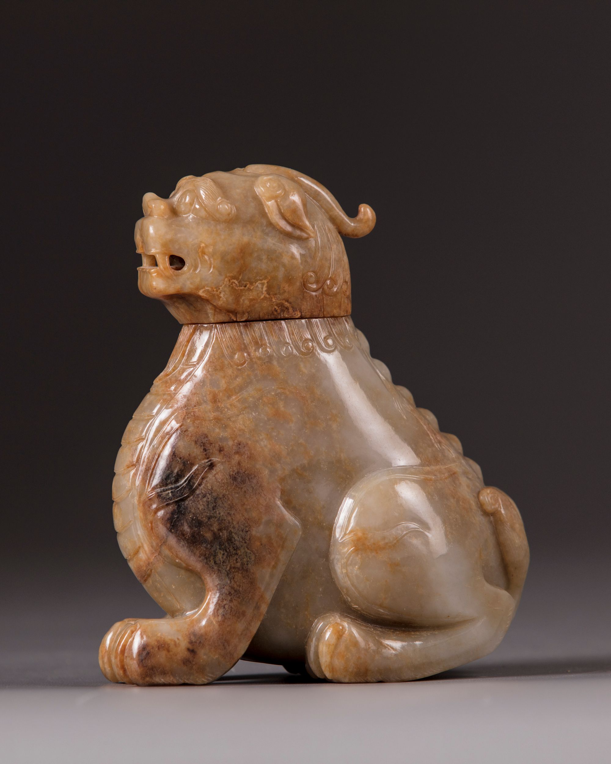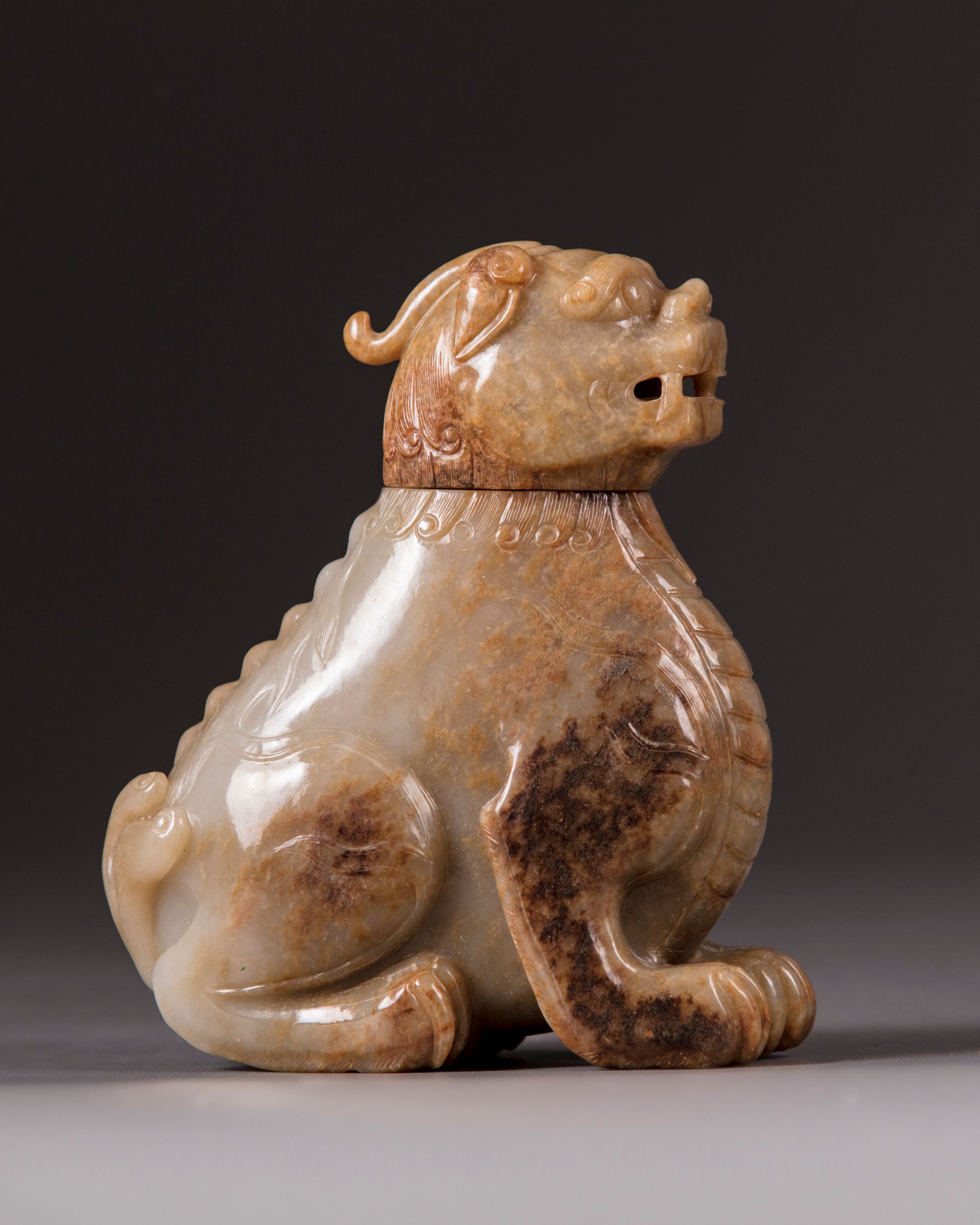 The mythical beast is carved seated on its haunches, the details of the trifucated tail, backbone, and flame scrolls are finely incised. Its head forms the cover. The stone is of a pale celadon tone with mottled russet inclusions. Provenance: From the collection of mr. J.E. Vaandrager