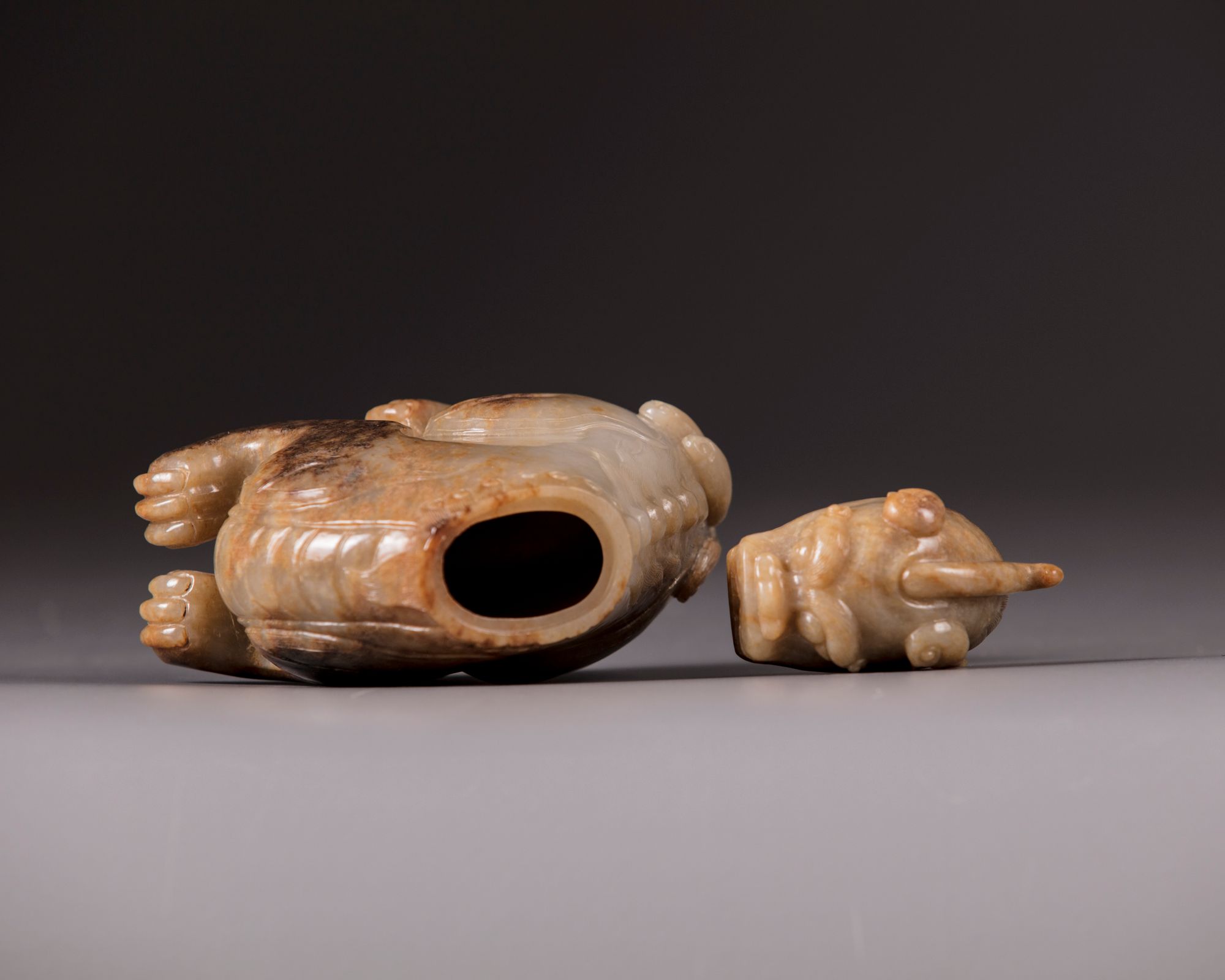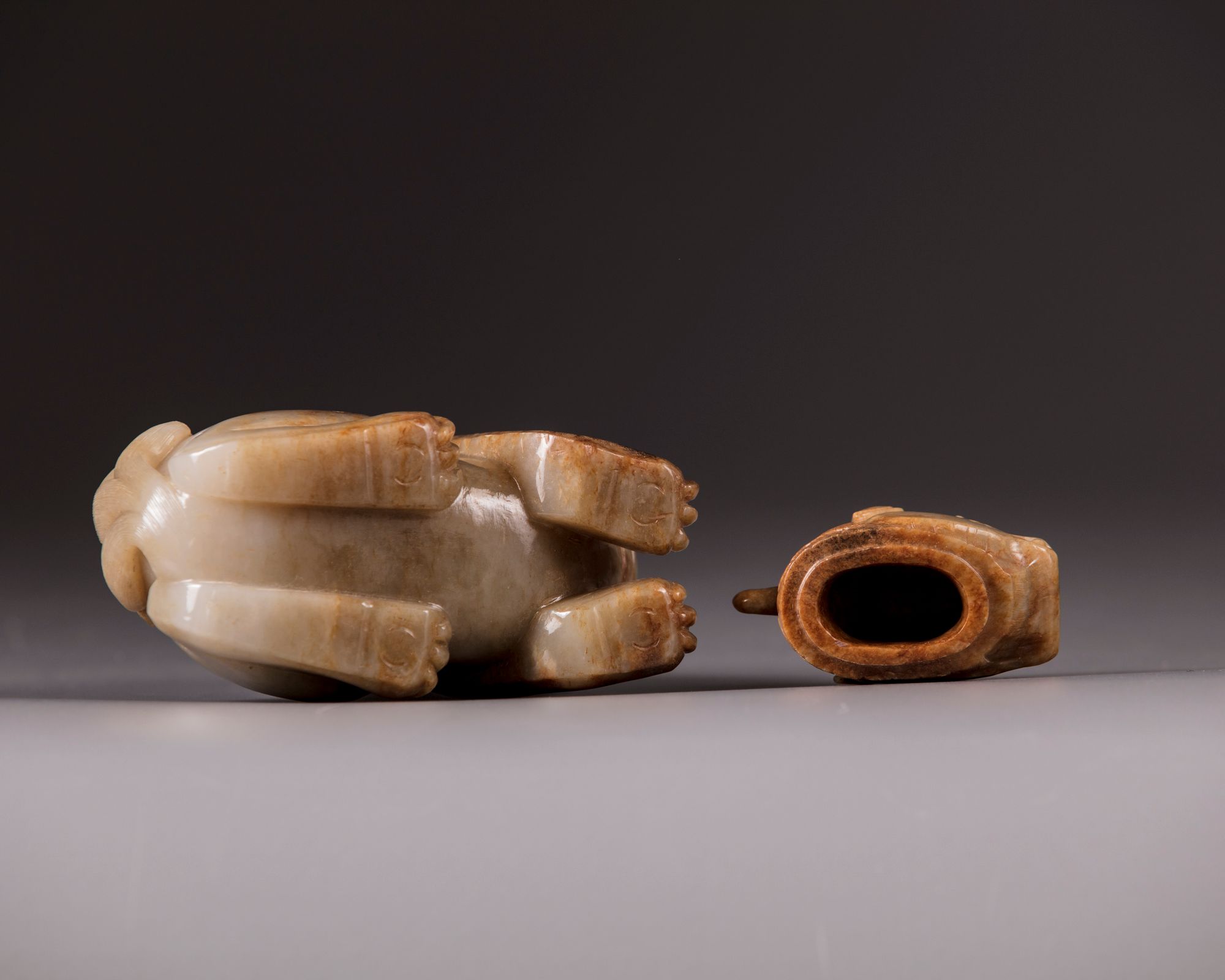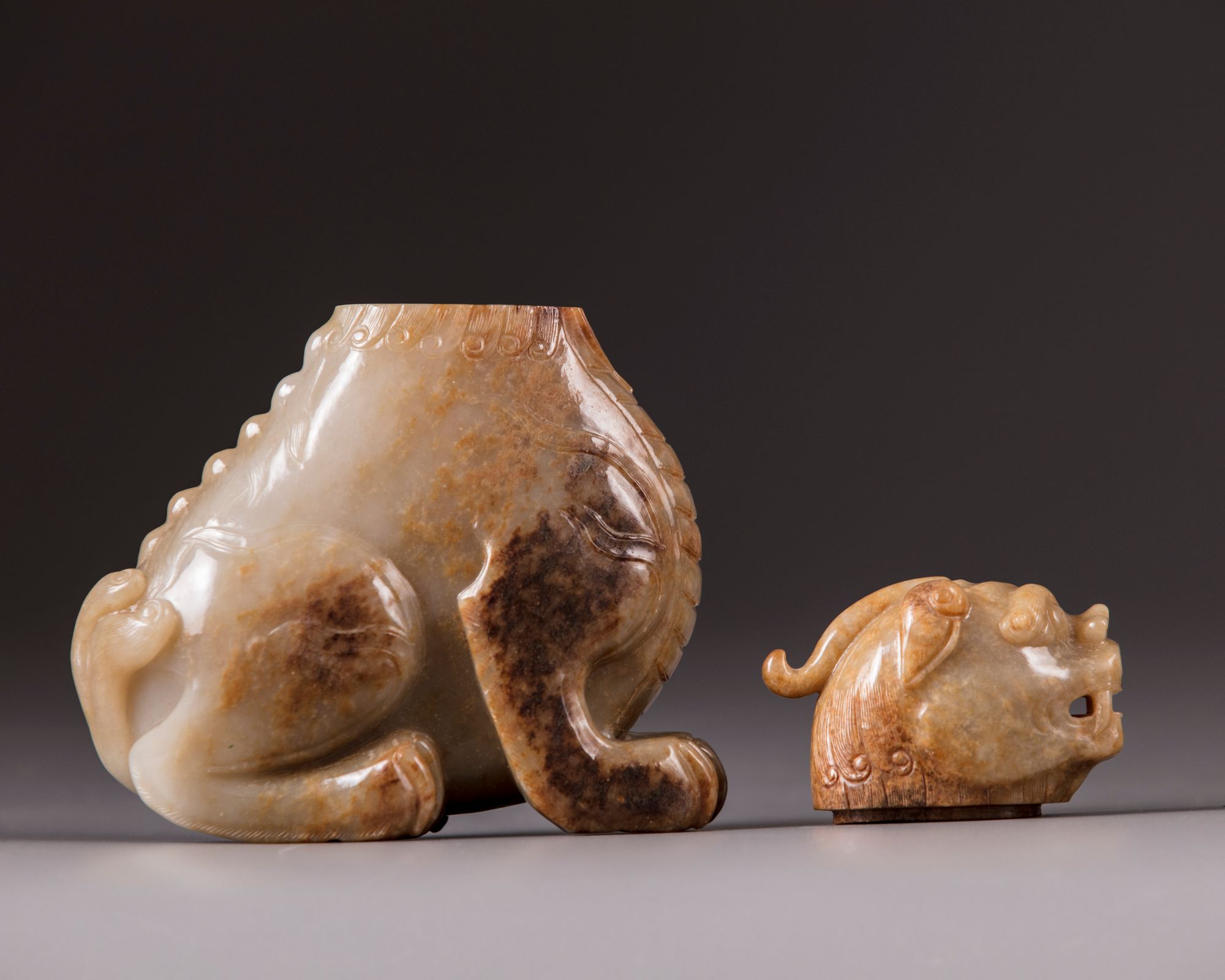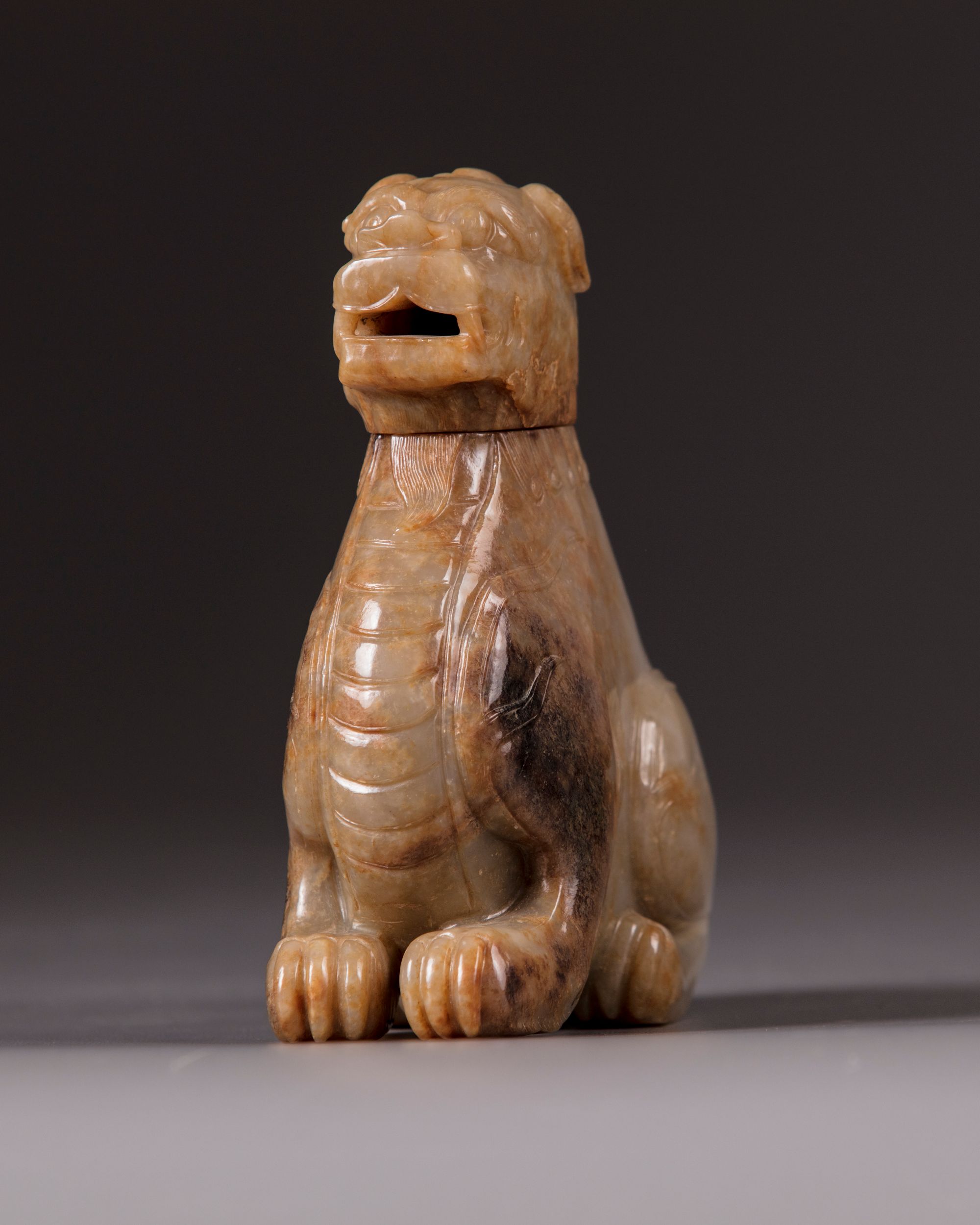 The mythical beast is carved seated on its haunches, the details of the trifucated tail, backbone, and flame scrolls are finely incised. Its head forms the cover. The stone is of a pale celadon tone with mottled russet inclusions. Provenance: From the collection of mr. J.E. Vaandrager