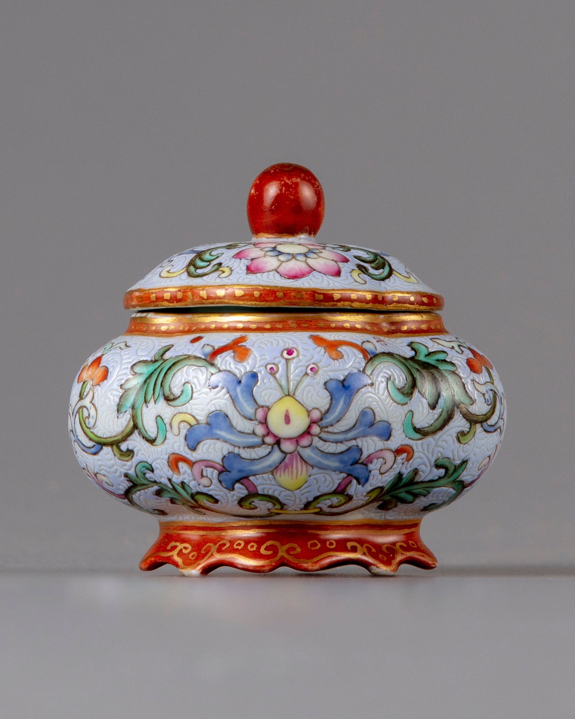 The quatrefoil body and the domed cover are decorated with lotus and C-scrolls on a light sky blue, The gilt base with a Qianlong seal mark