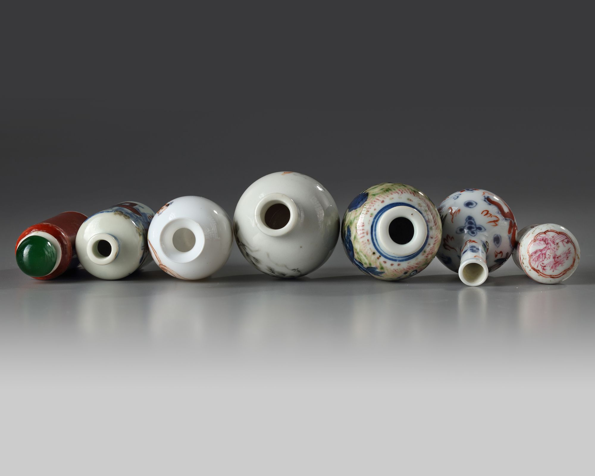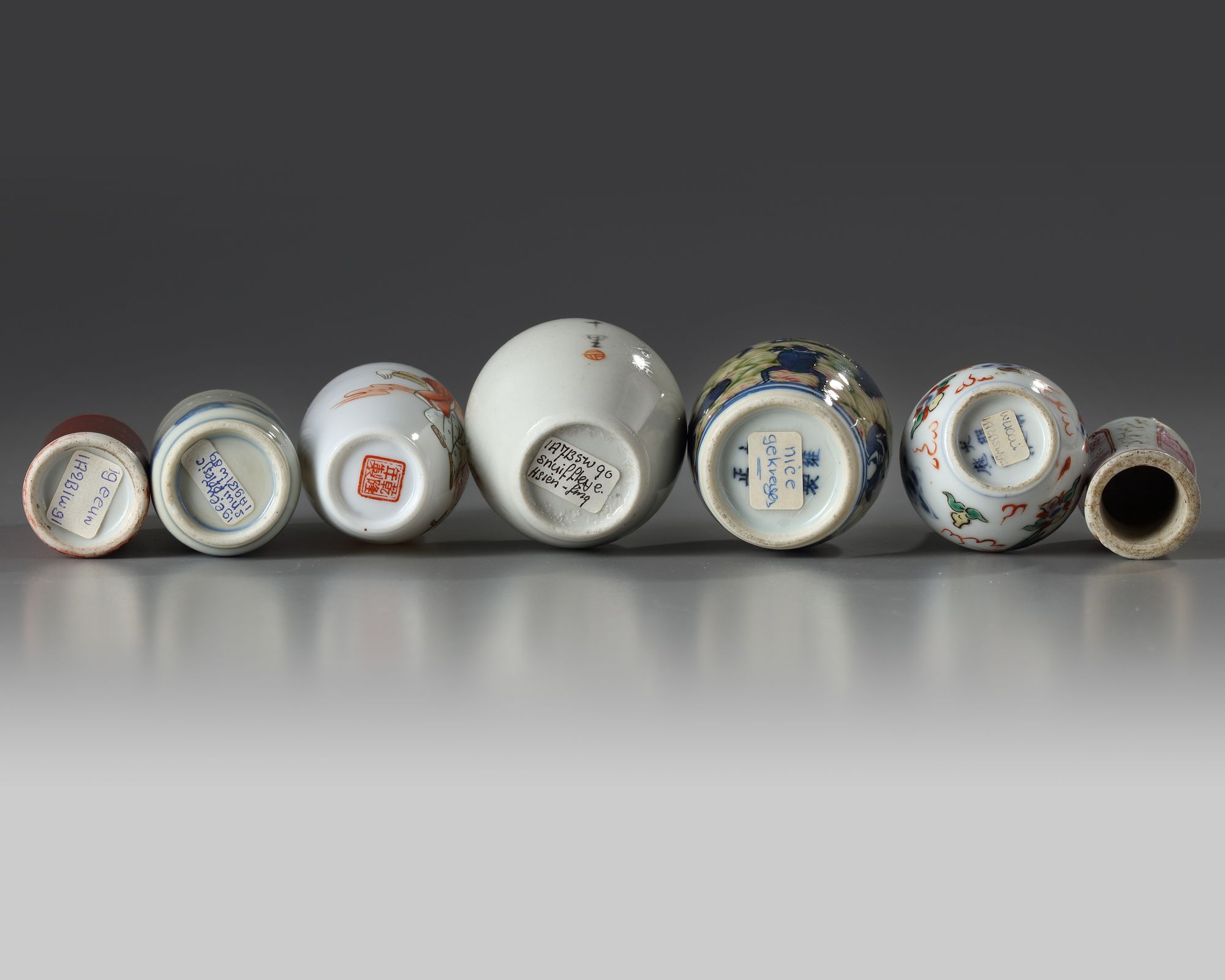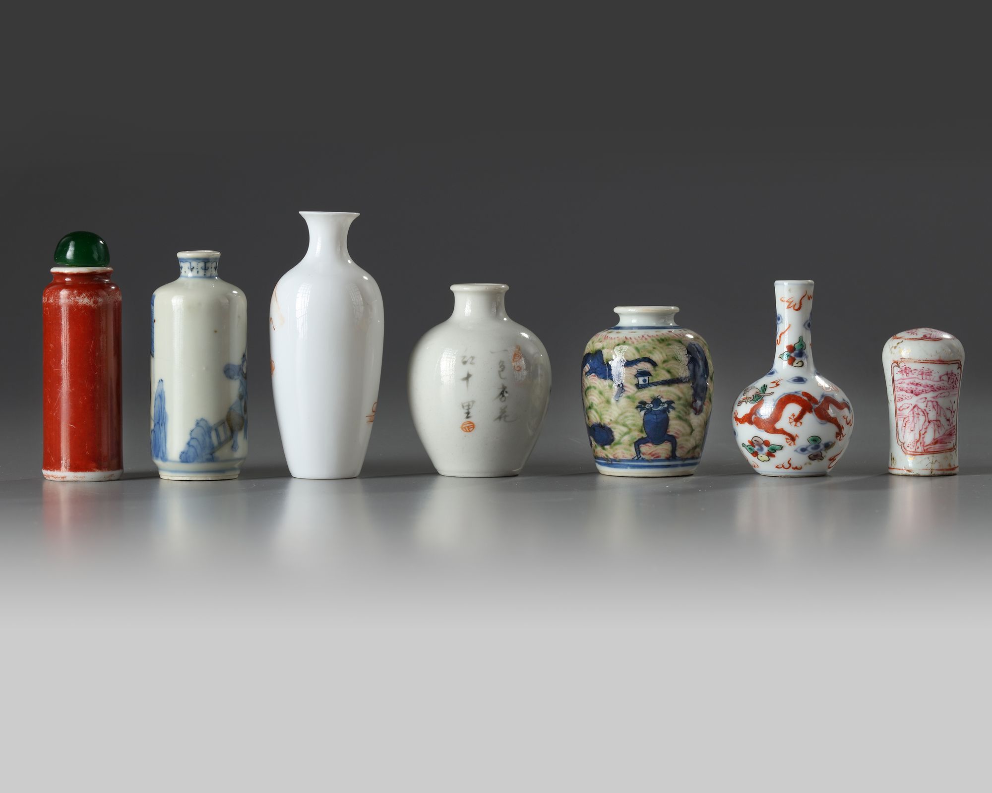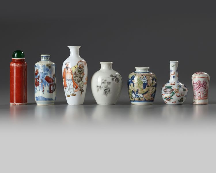 Comprising: a puce and gilt-decorated handle; an underglaze copper-red decorated blue and white ‘figural’ snuff bottle; an iron-red decorated cylindrical snuff bottle; an underglaze copper red and blue and white ‘narrative’ jarlet; a grisaille-decorated ‘floral’ jarlet inscribed with a poem about prunus and an artemisia leaf and a small seal in iron red; a wucai ‘dragon and phoenix’ bottle vase, the base with an apocryphal mark; and an eggshell porcelain vase decorated with Li Tieguai and Zhongli Quan, the base with an apocryphal Qianlong mark.