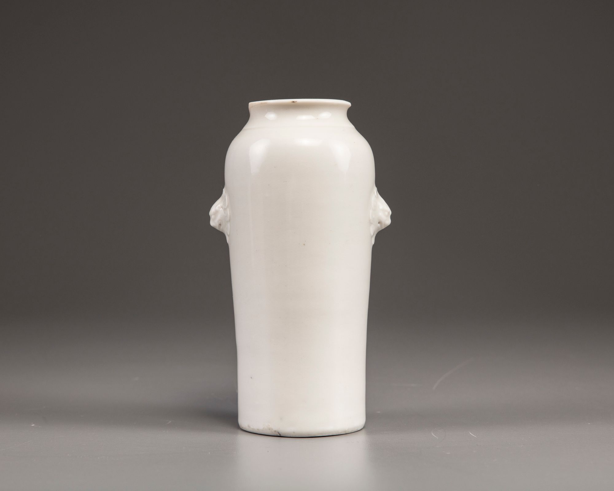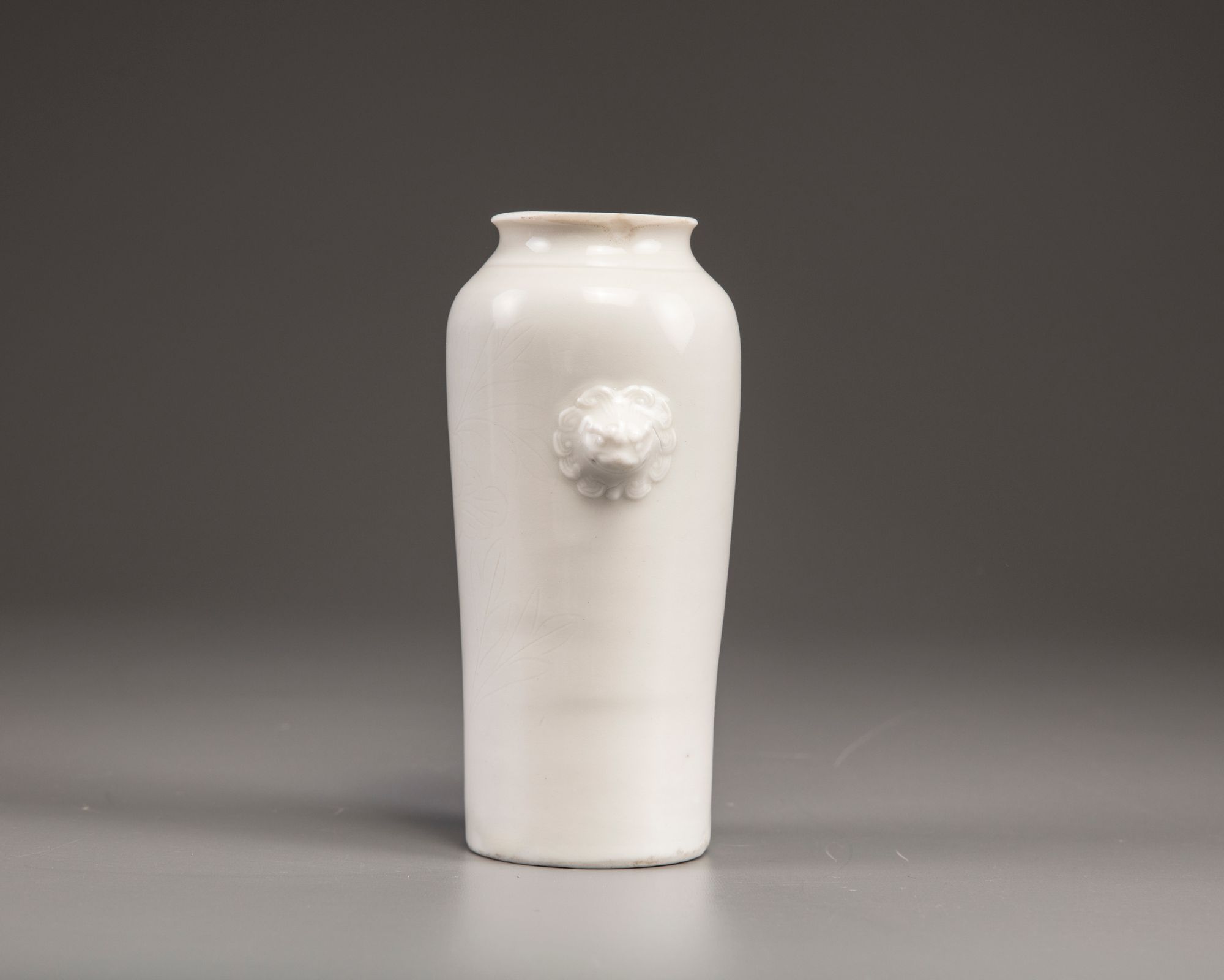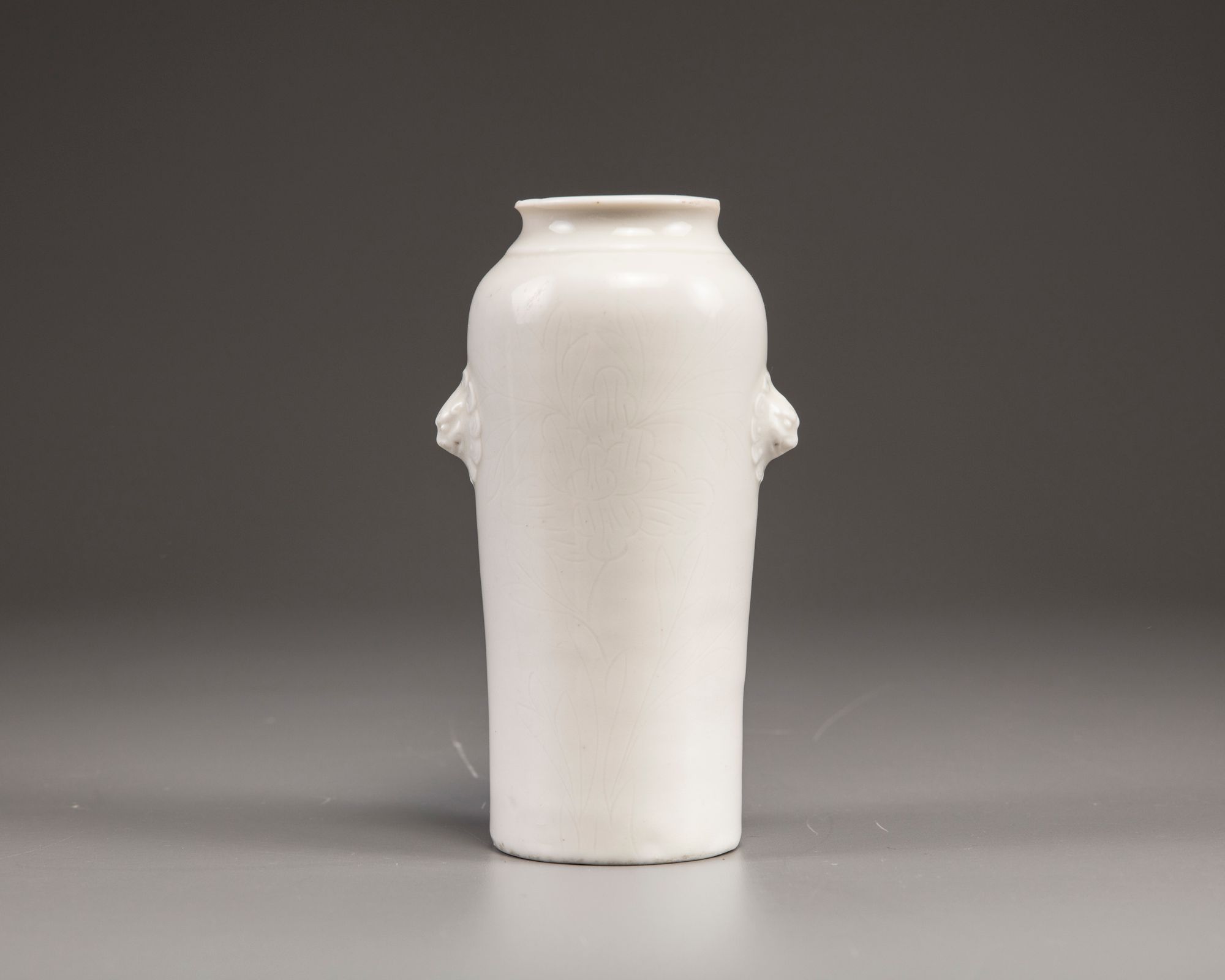 The slightly tapering vase with a flaring rim is applied with two moulded lion-head handles to the shoulders. The body is decorated to one side with a freely carved anhua peony blossom.
