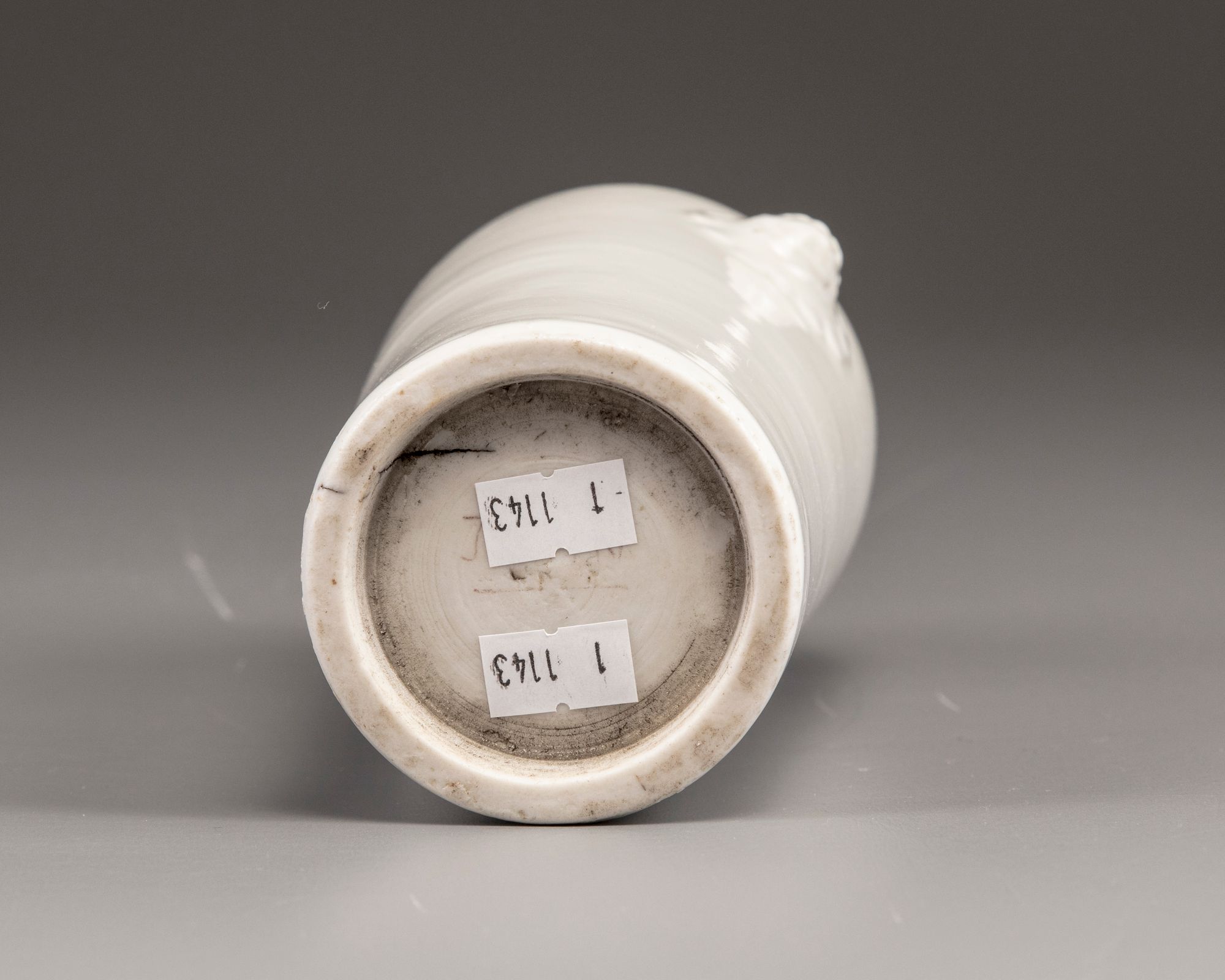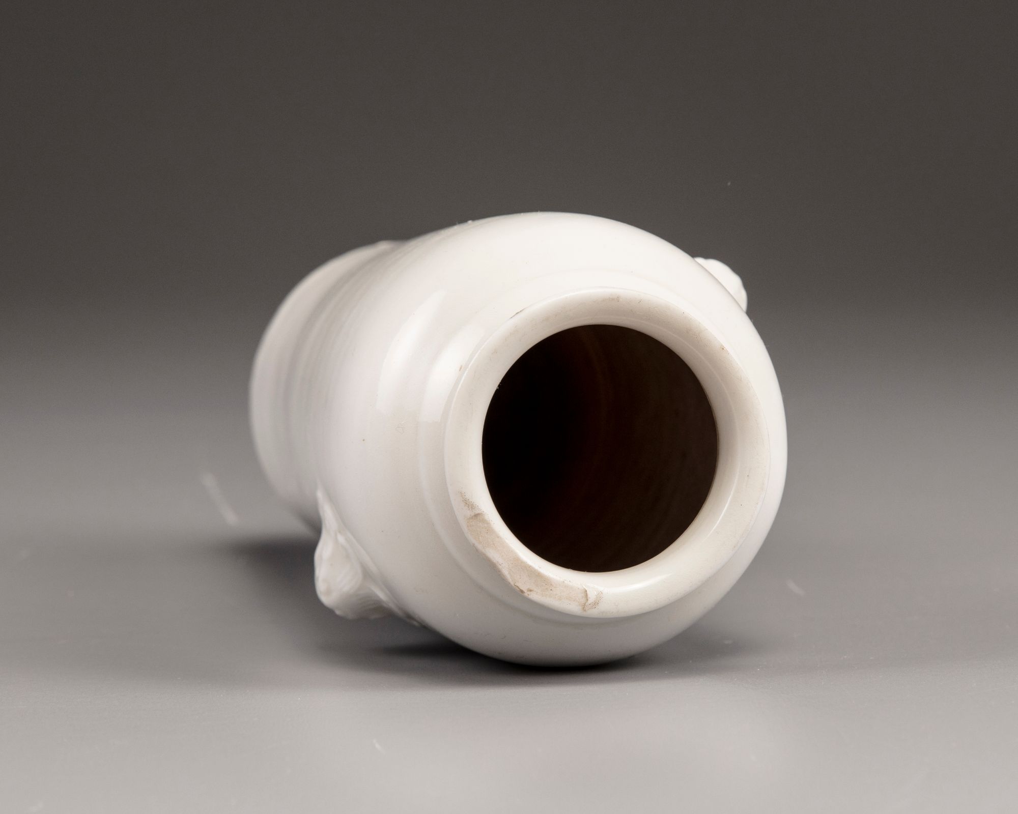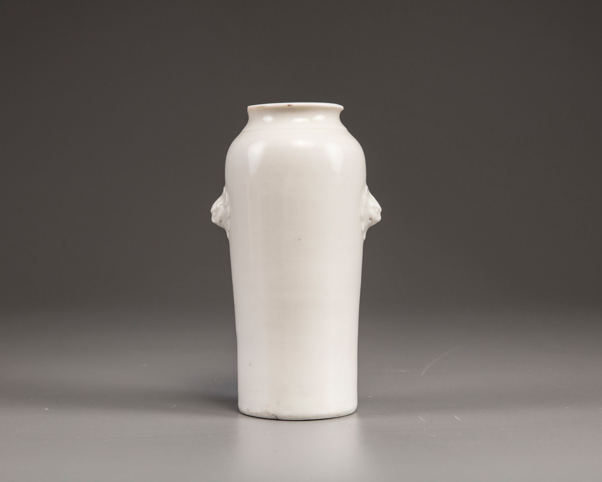 The slightly tapering vase with a flaring rim is applied with two moulded lion-head handles to the shoulders. The body is decorated to one side with a freely carved anhua peony blossom.