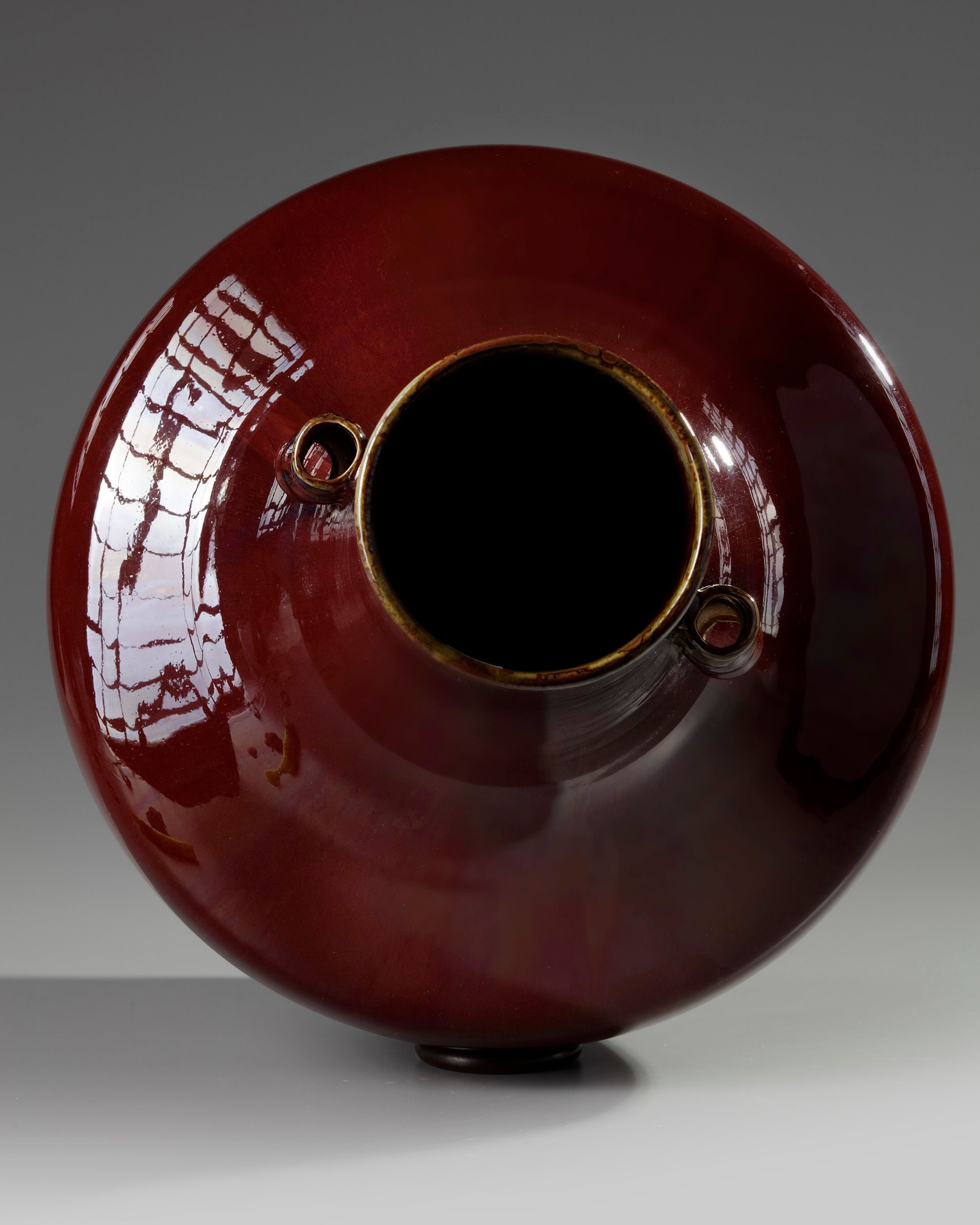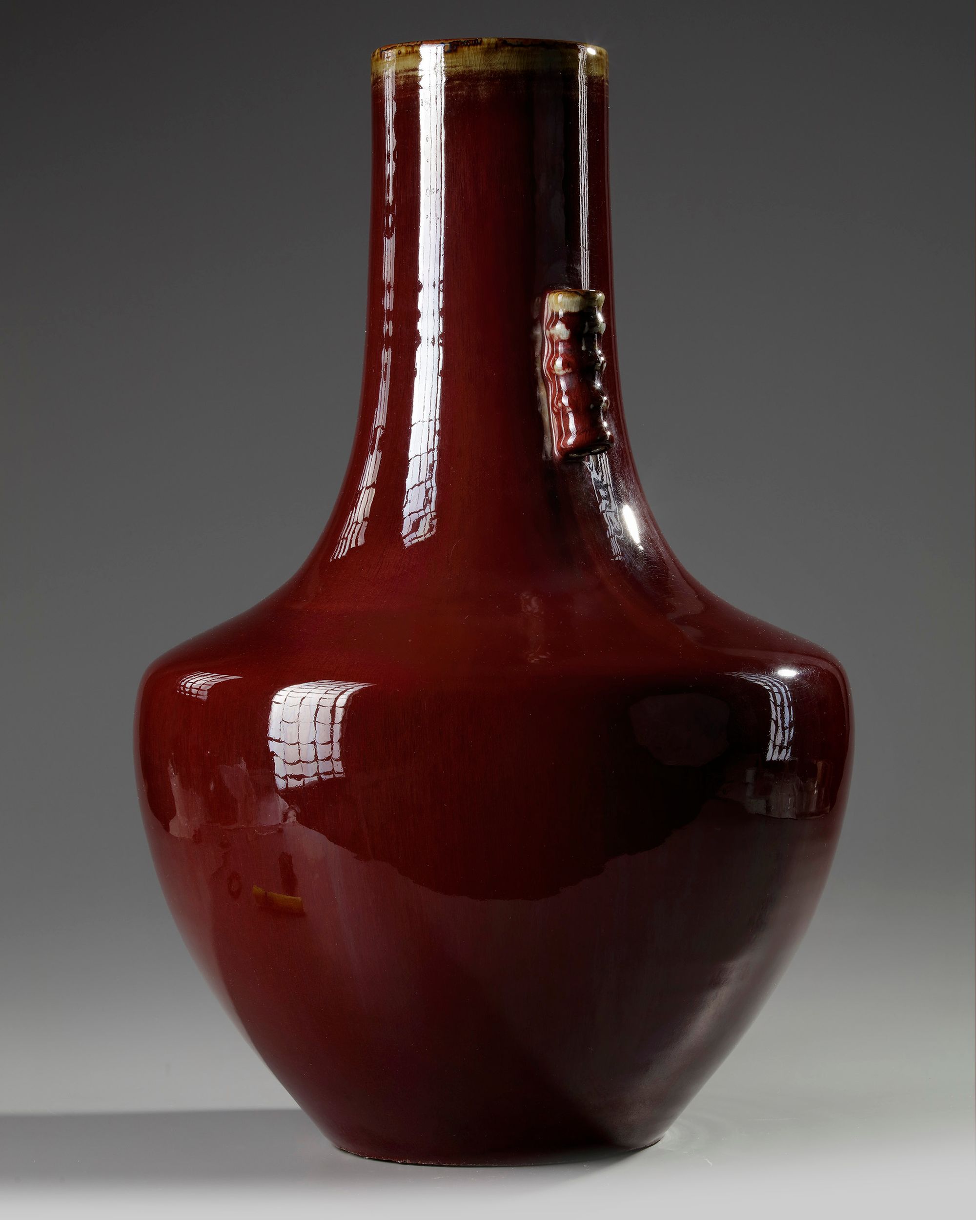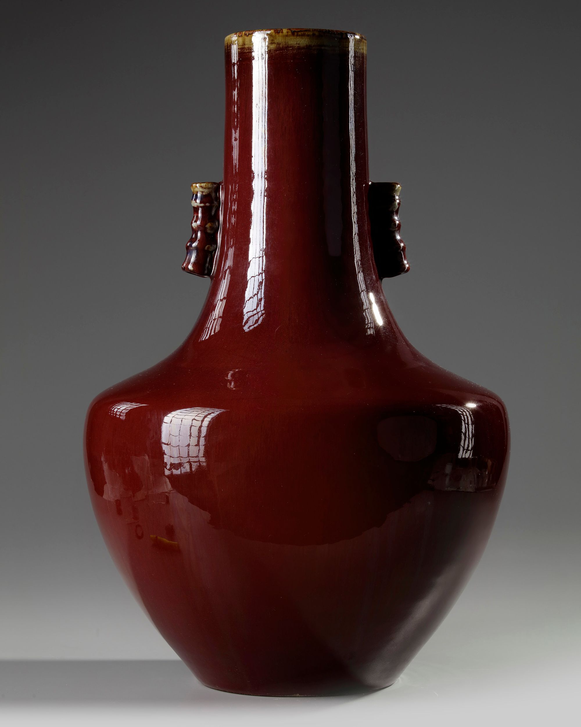 The vase is fashioned with two tubular bamboo-form handles to the neck, it is covered with a thick, slightly streaked strawberry glaze which thins just below the mouth rim and at the raised areas of the handles. The base is covered in a mottled cafe-au-lait glaze with an apocryphal Yongzheng seal mark.