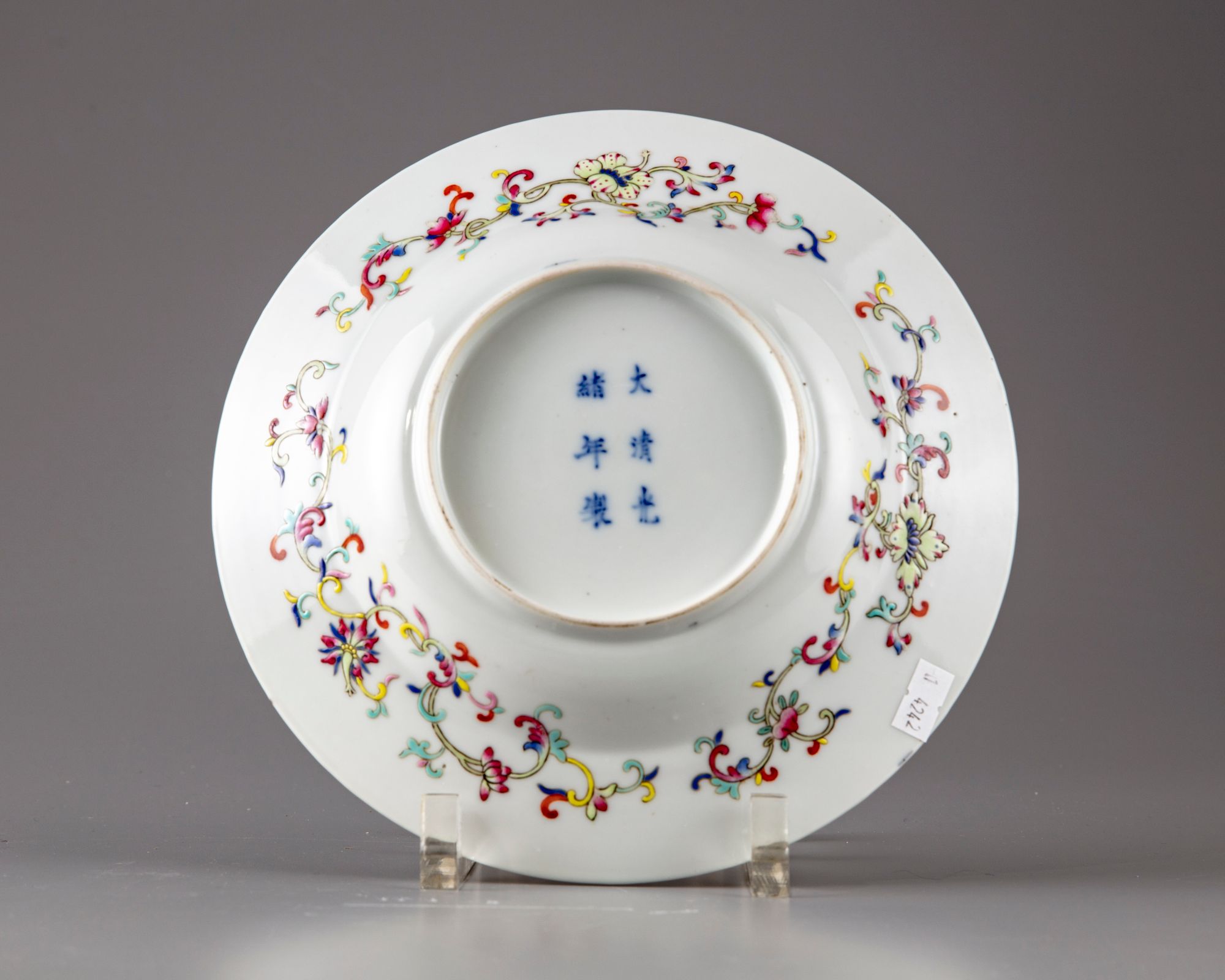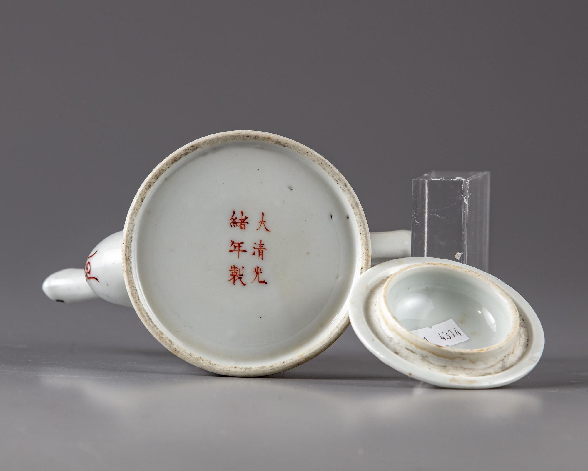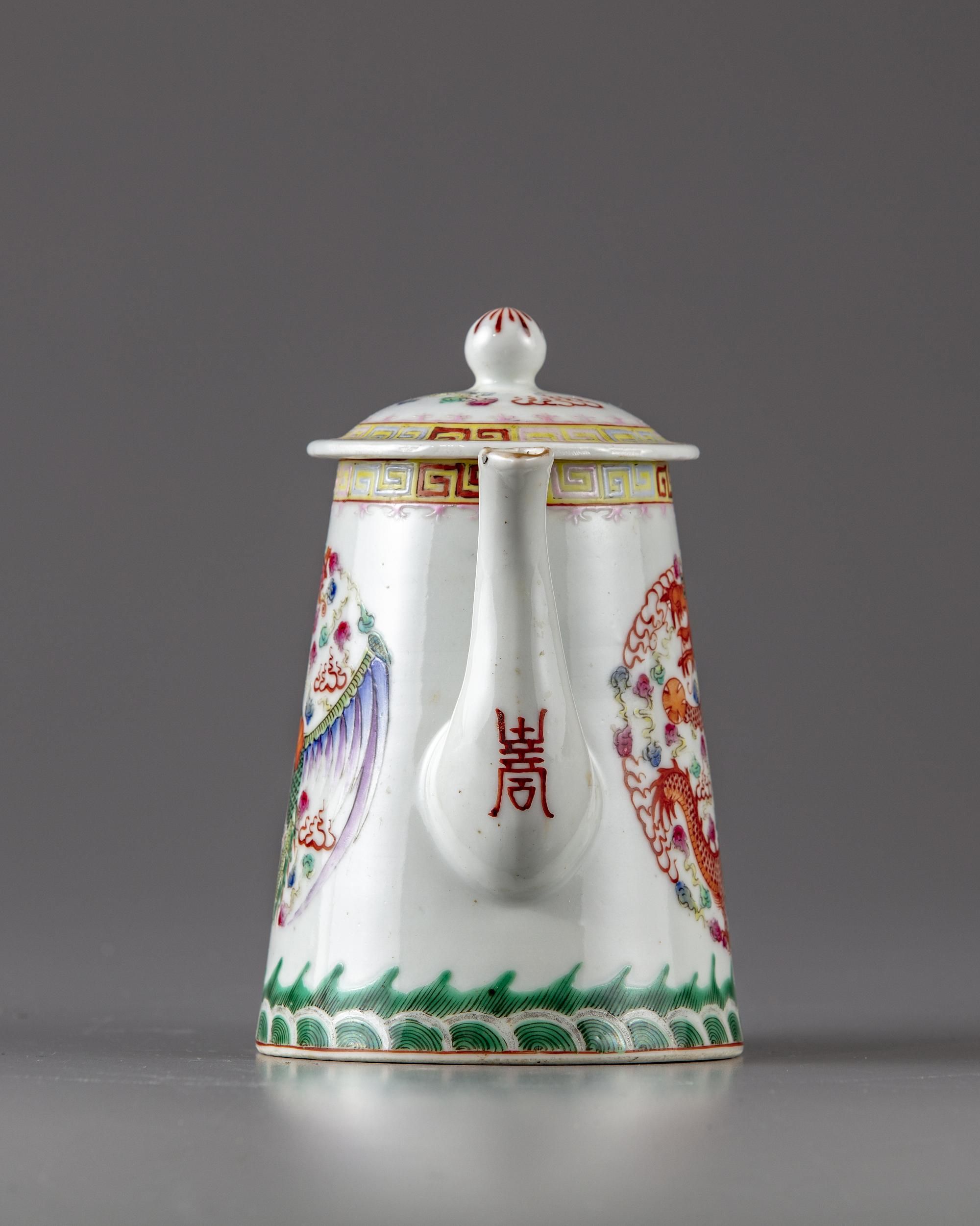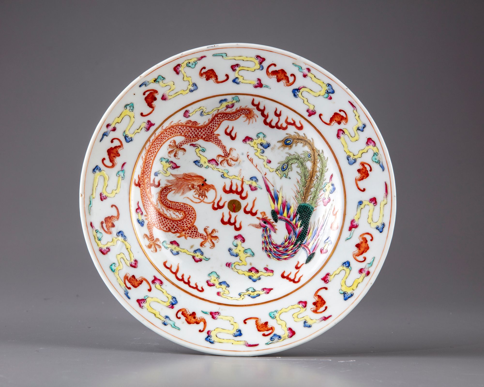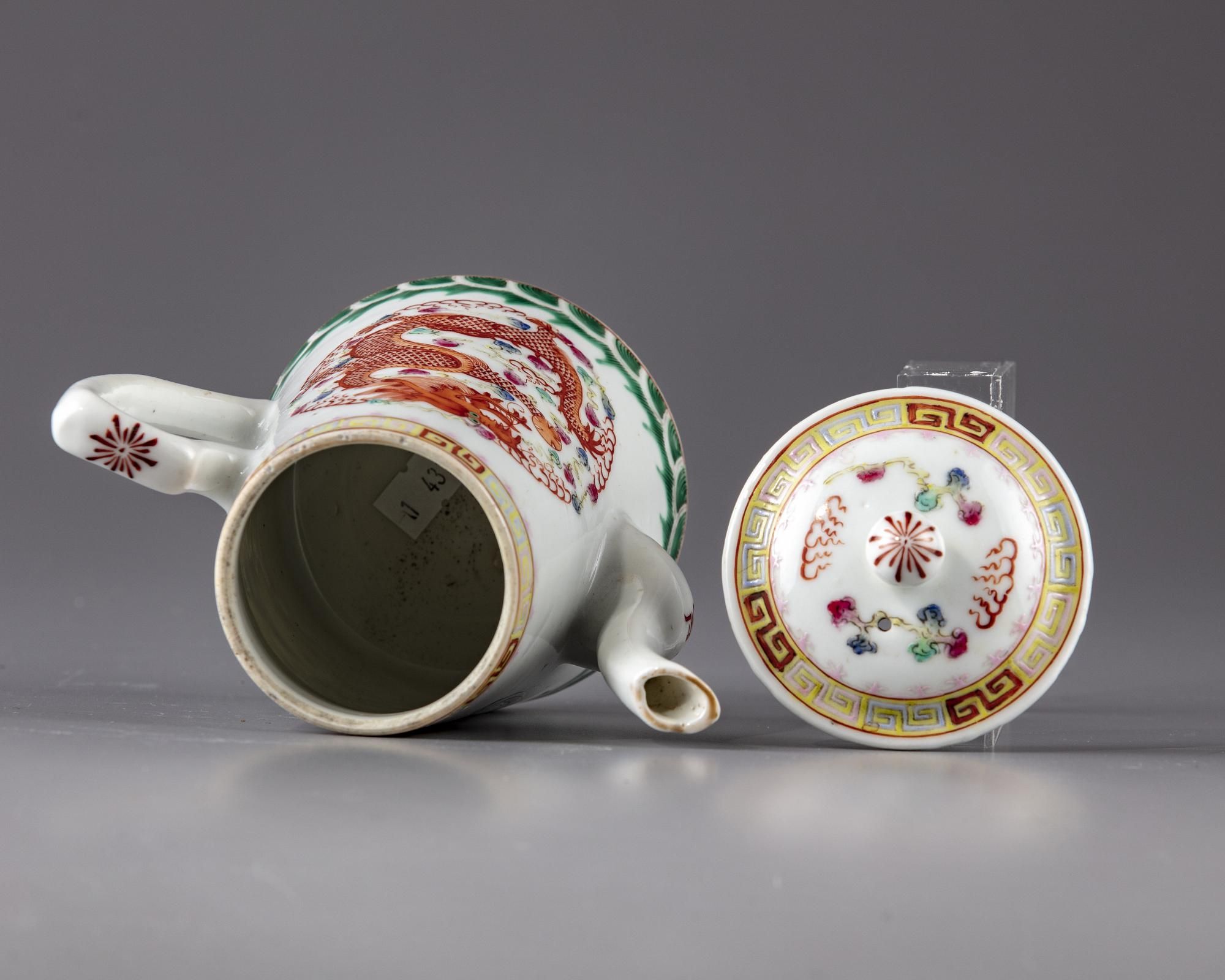 The dish is decorated to the centre with a dragon and a phoenix chasing a gilt flaming pearl amongst clouds.The sides with fu bats and clouds. The exterior with flower scrolls and a Chinese six character Guangxu mark. The teapot is decorated with two roundels of dragon and a phoenix with flowers ,above seawaves.The cover with clouds and a key fret chain.The base is with a Chinese six character Guangxu mark.