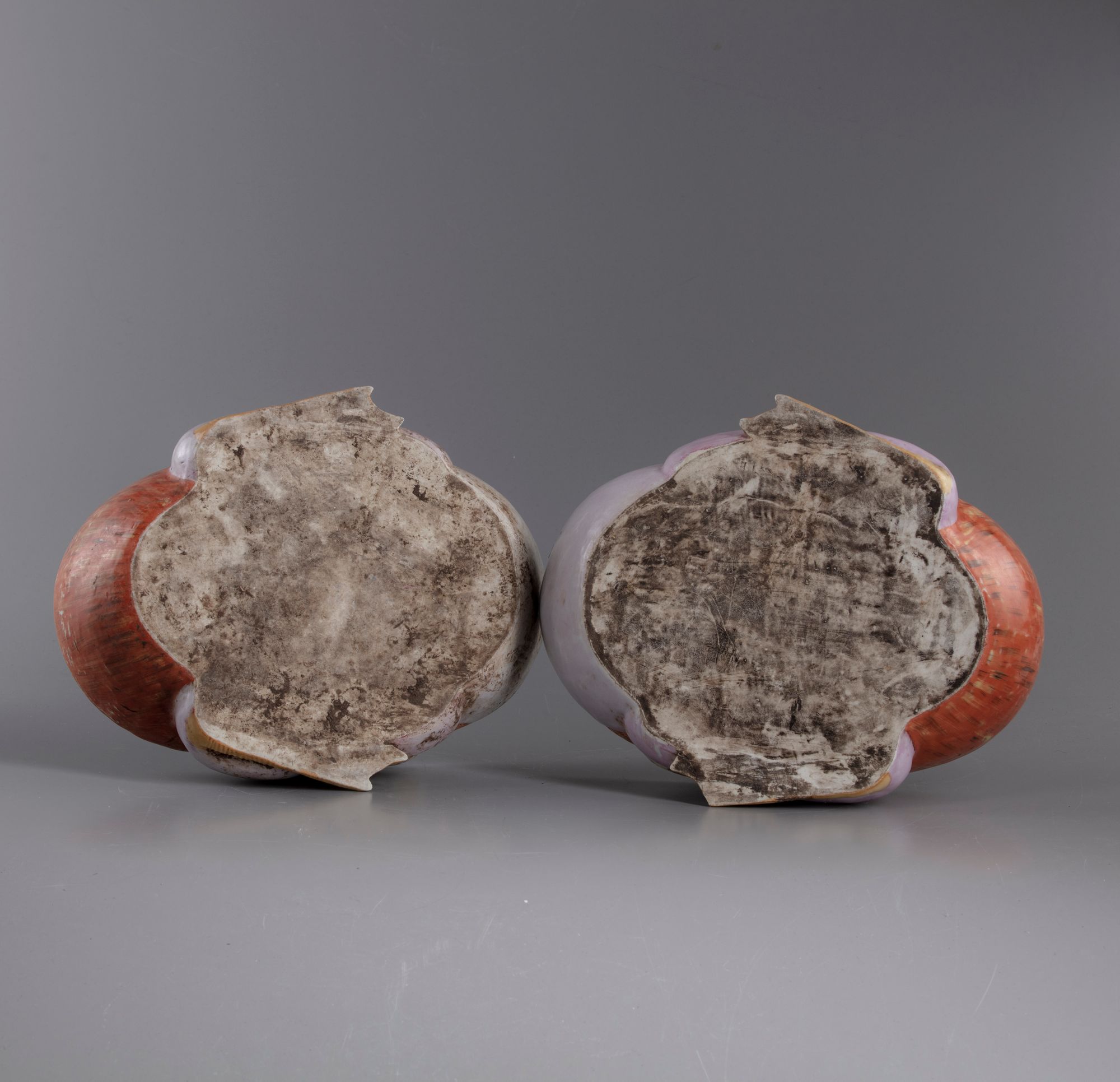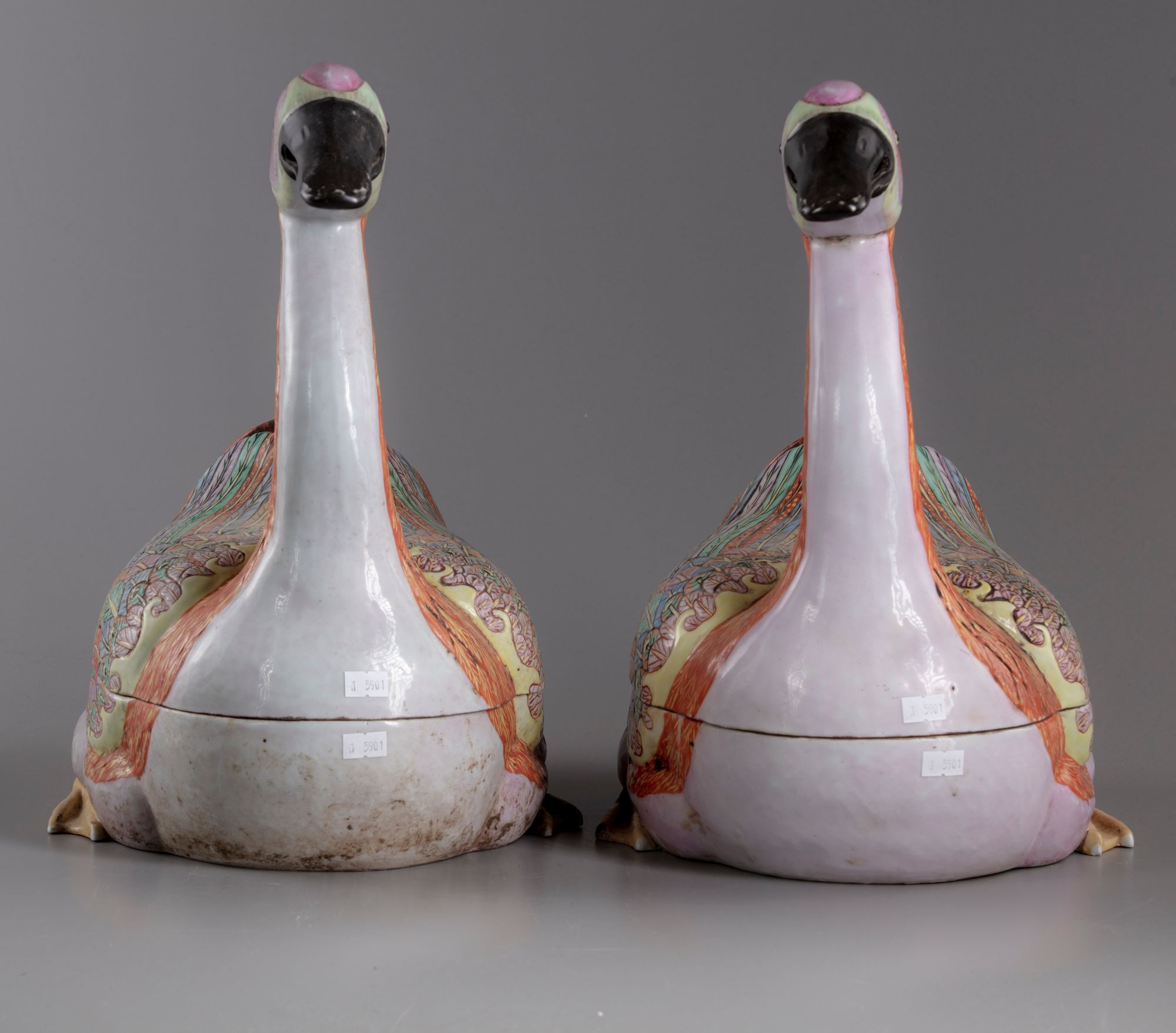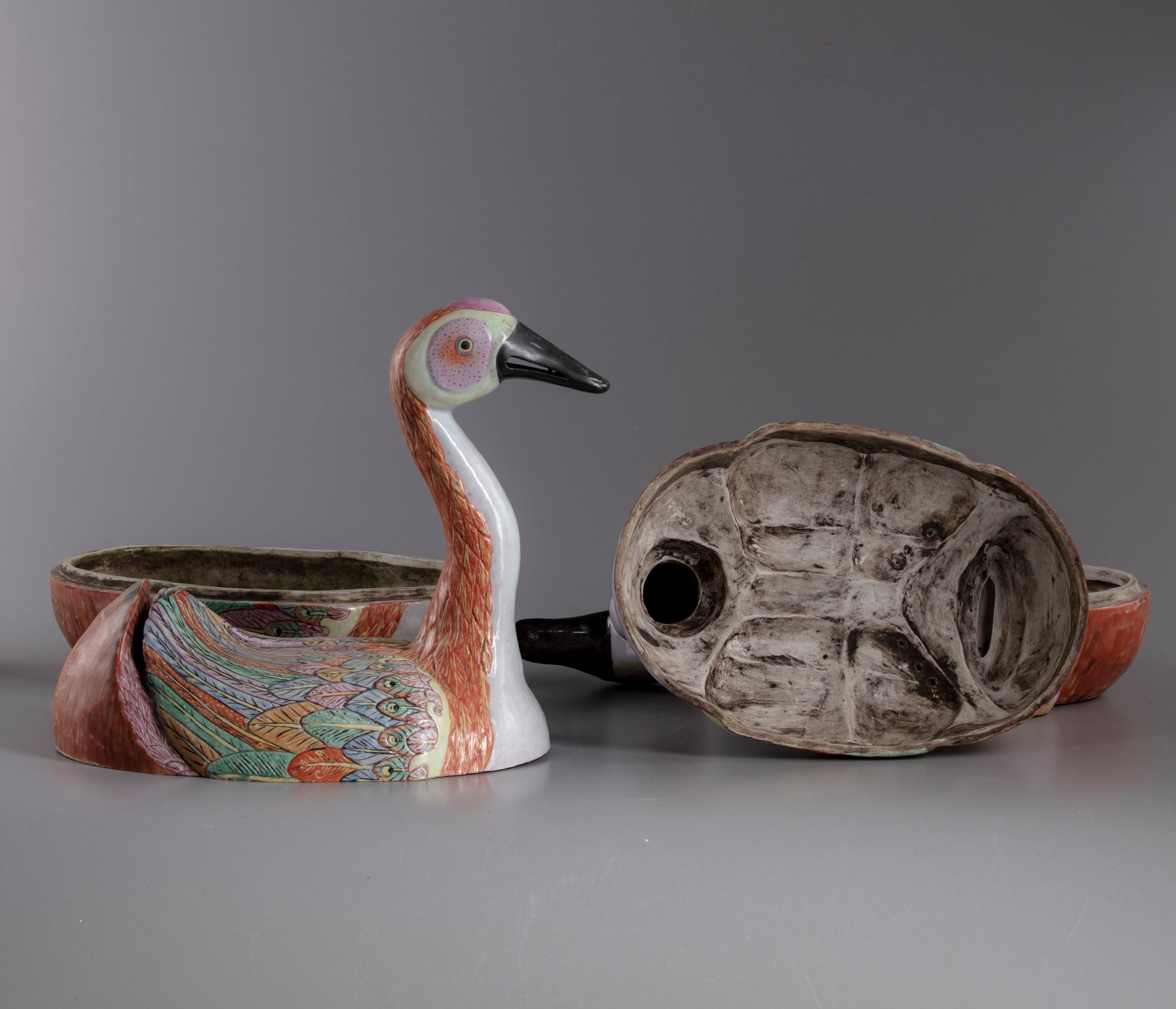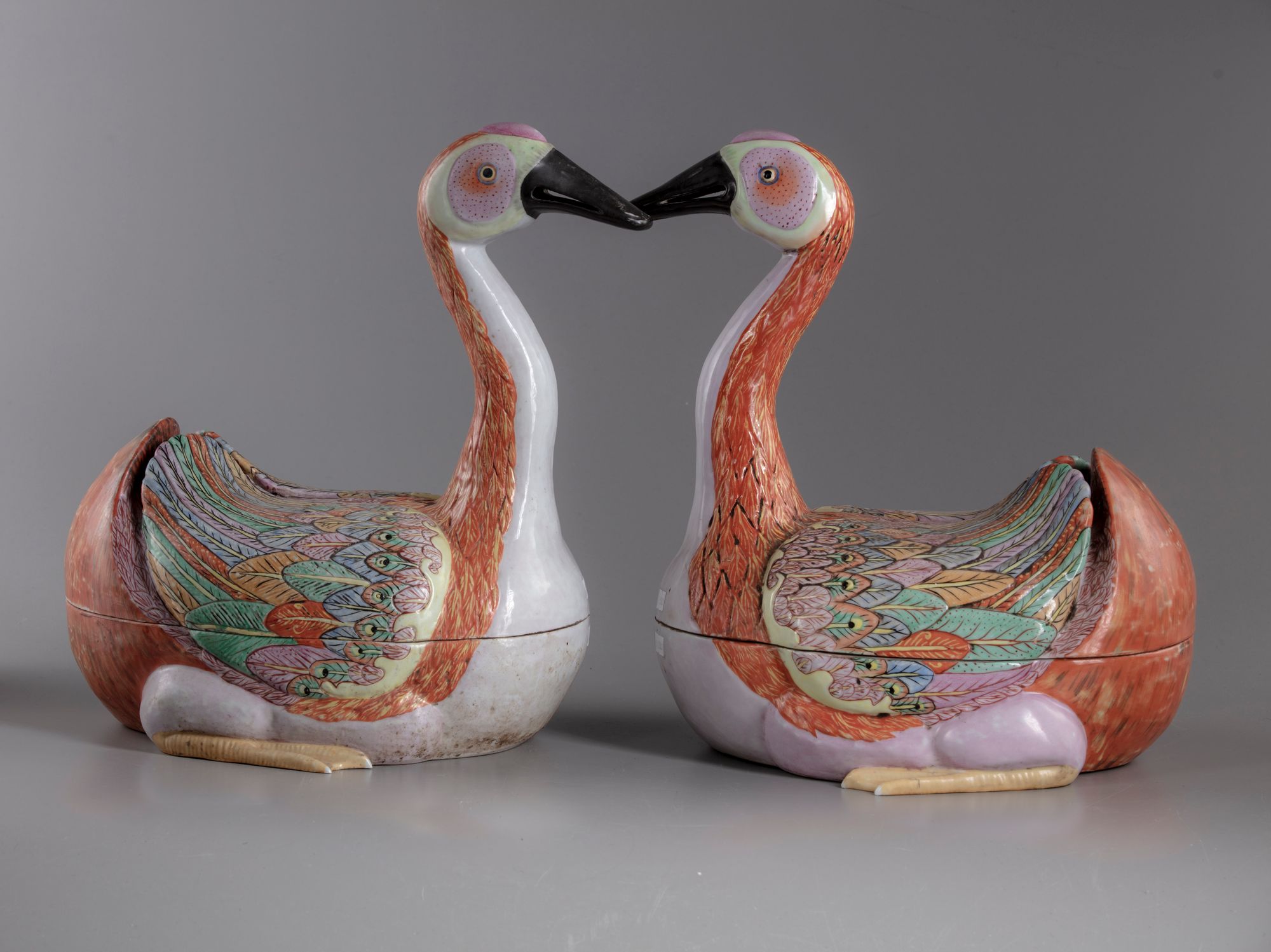 Naturalistically modelled with long, curving neck and two partially-visible feet at either side of the nesting body, the finely modeled head with alert eyes within vivid enameling in the famille rose palette, his plumage lightly molded with brightly colored wing feathers heightened with gilt detailing and folded over its back, almost meeting in front of the upturned tails.