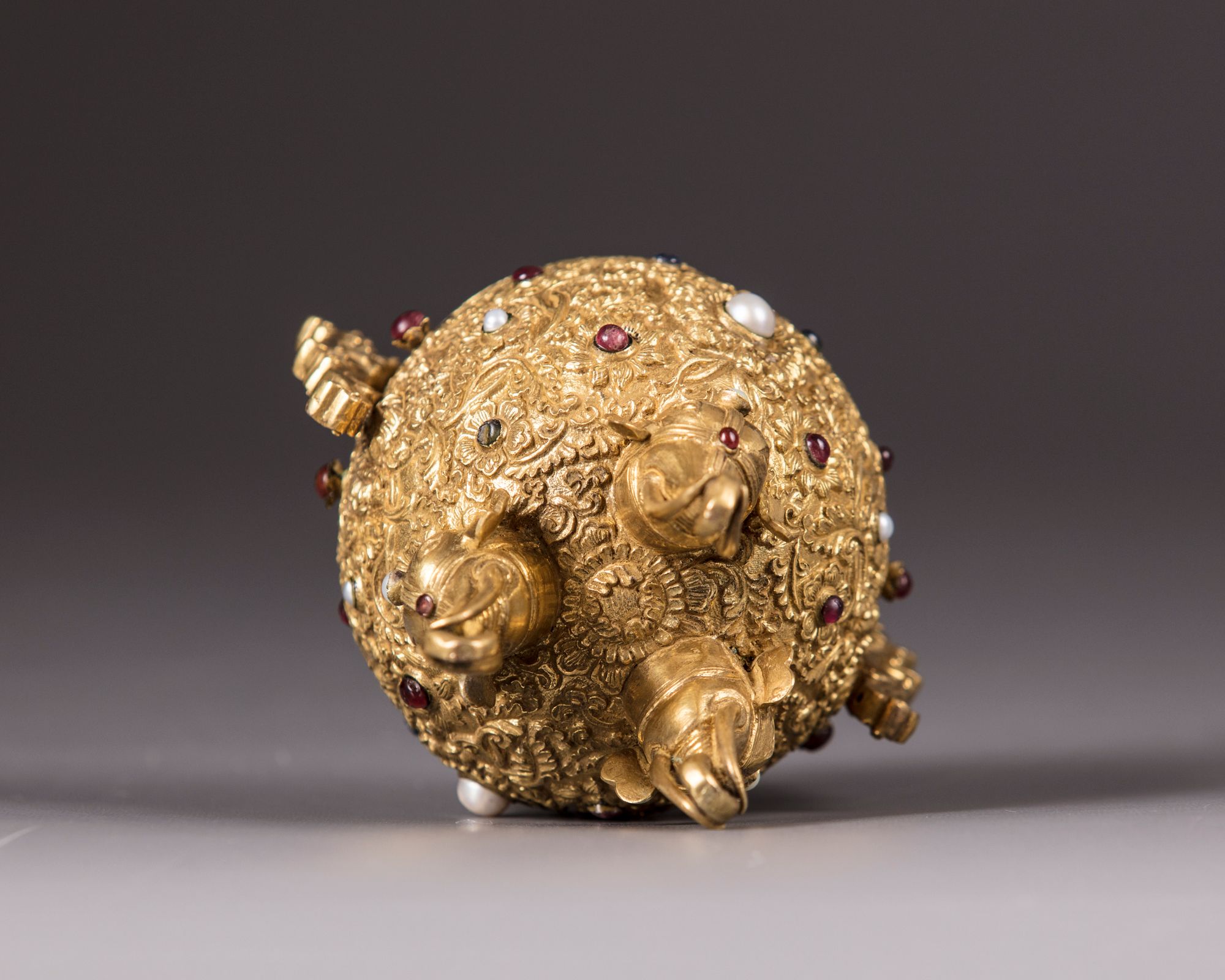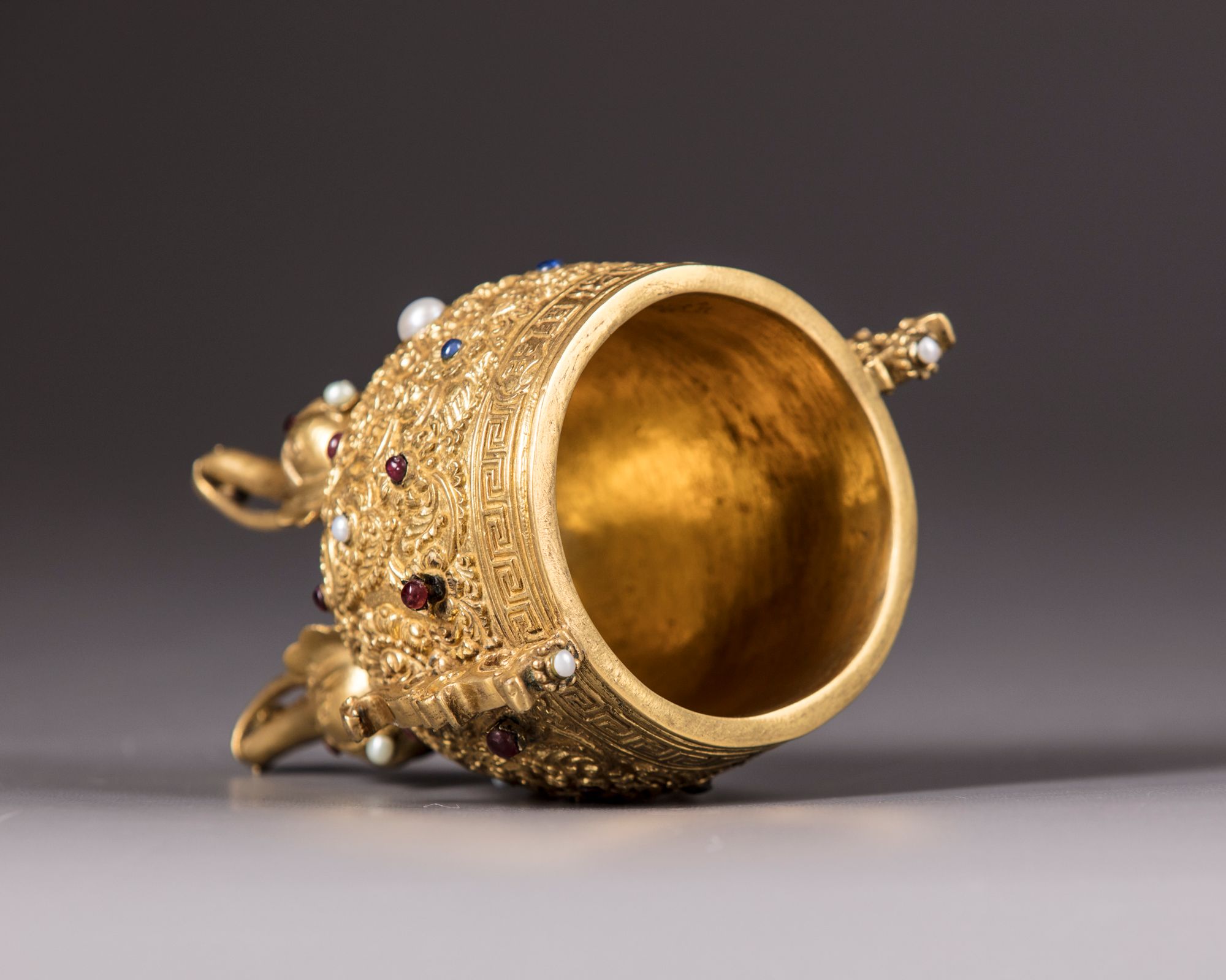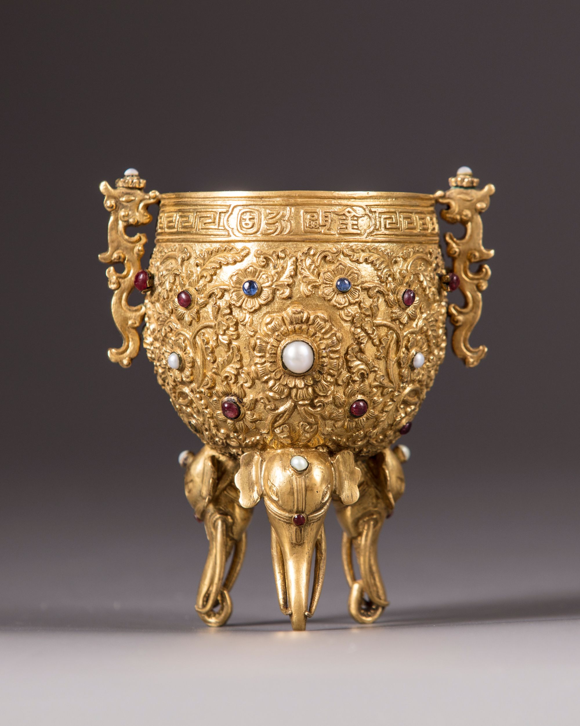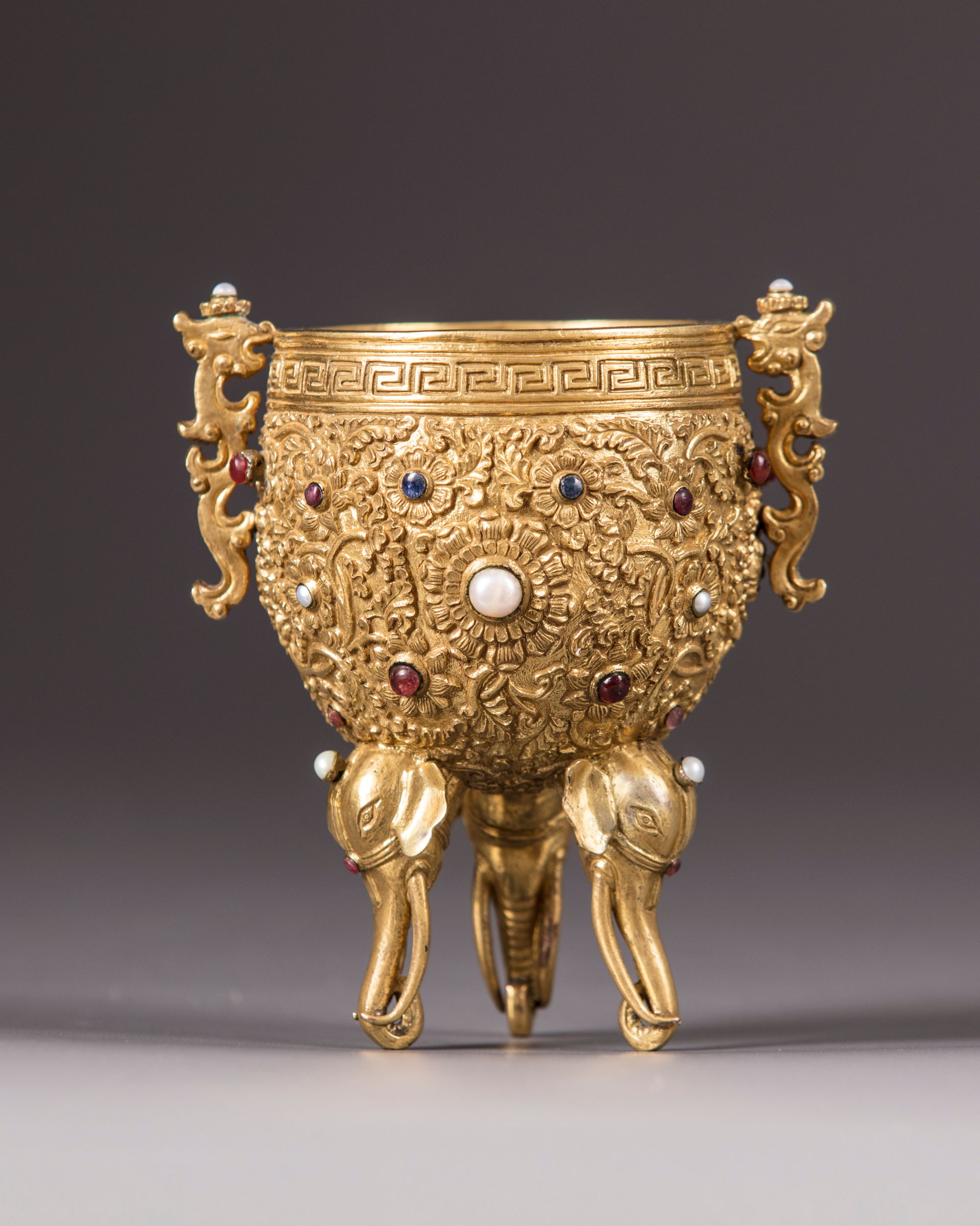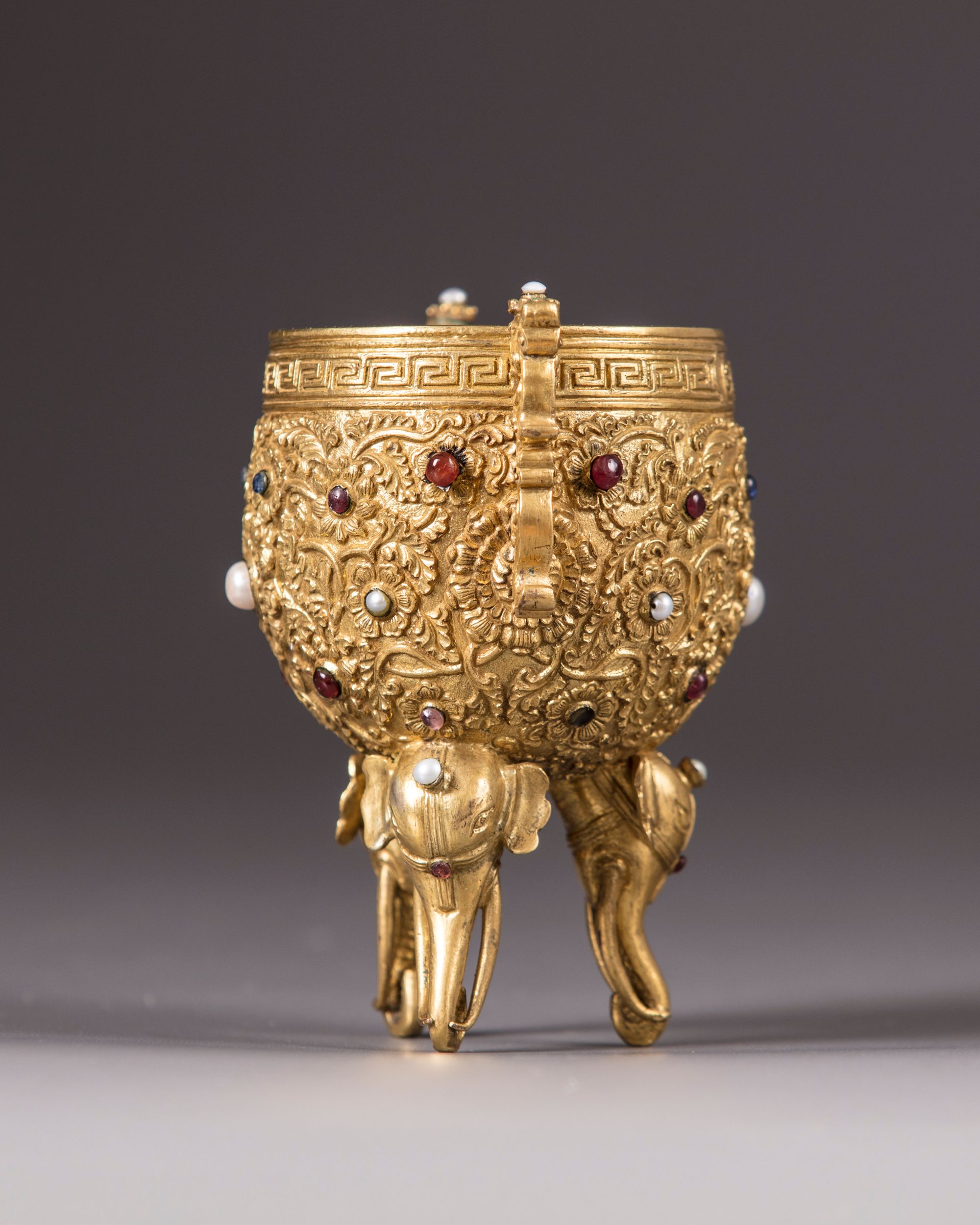 The tapered barrel-form censer is decorated with two kui-dragon handles and stands on three elephant-form feet. The body is cast in low relief with scrolling flowers and lotus below a squared scroll band to the mouth rim. The rim is marked with four characters in seal script reading 'jin'ou yonggu' which is an expression for the wish to strengthen the hold on the national territory. The body with various inlays.