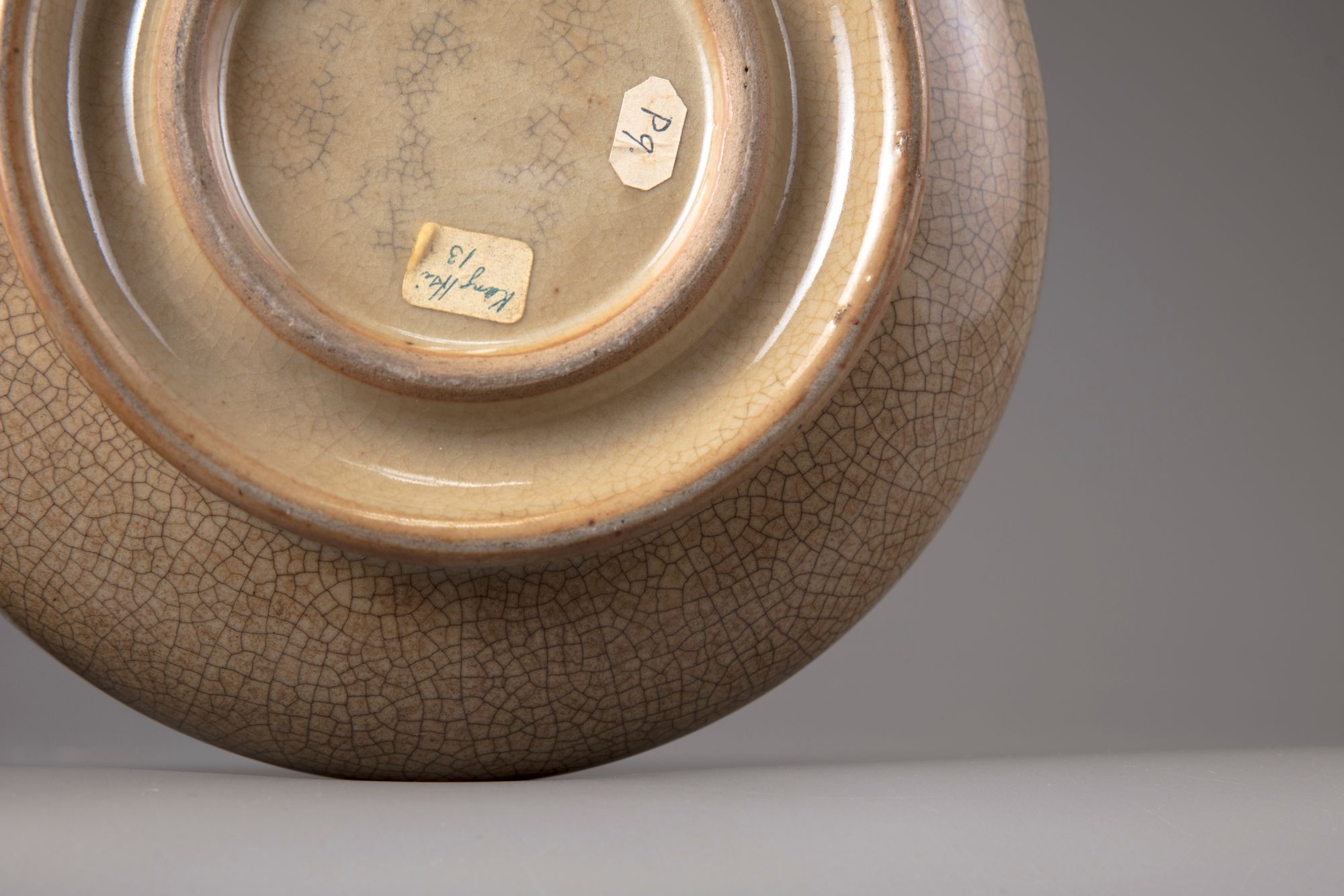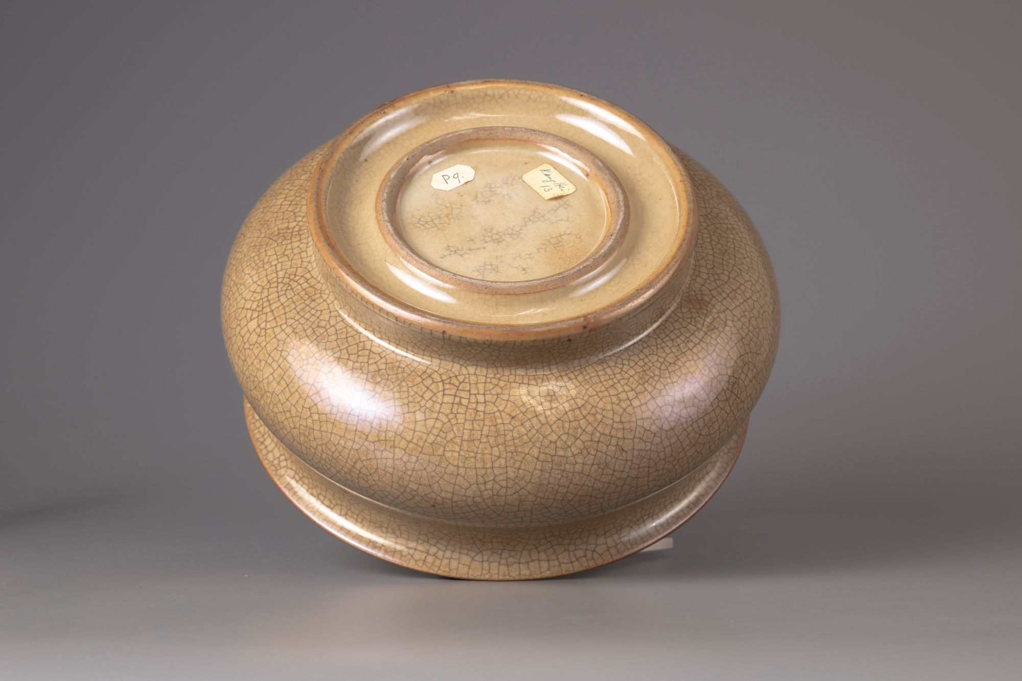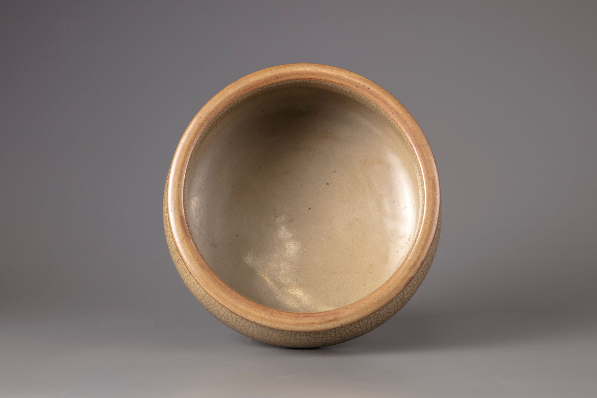 The censer is of bombé form, covered overall with a café-au-lait glaze suffused with deep grey crackles in imitation of Ge wares. The base with a double-ring foot.