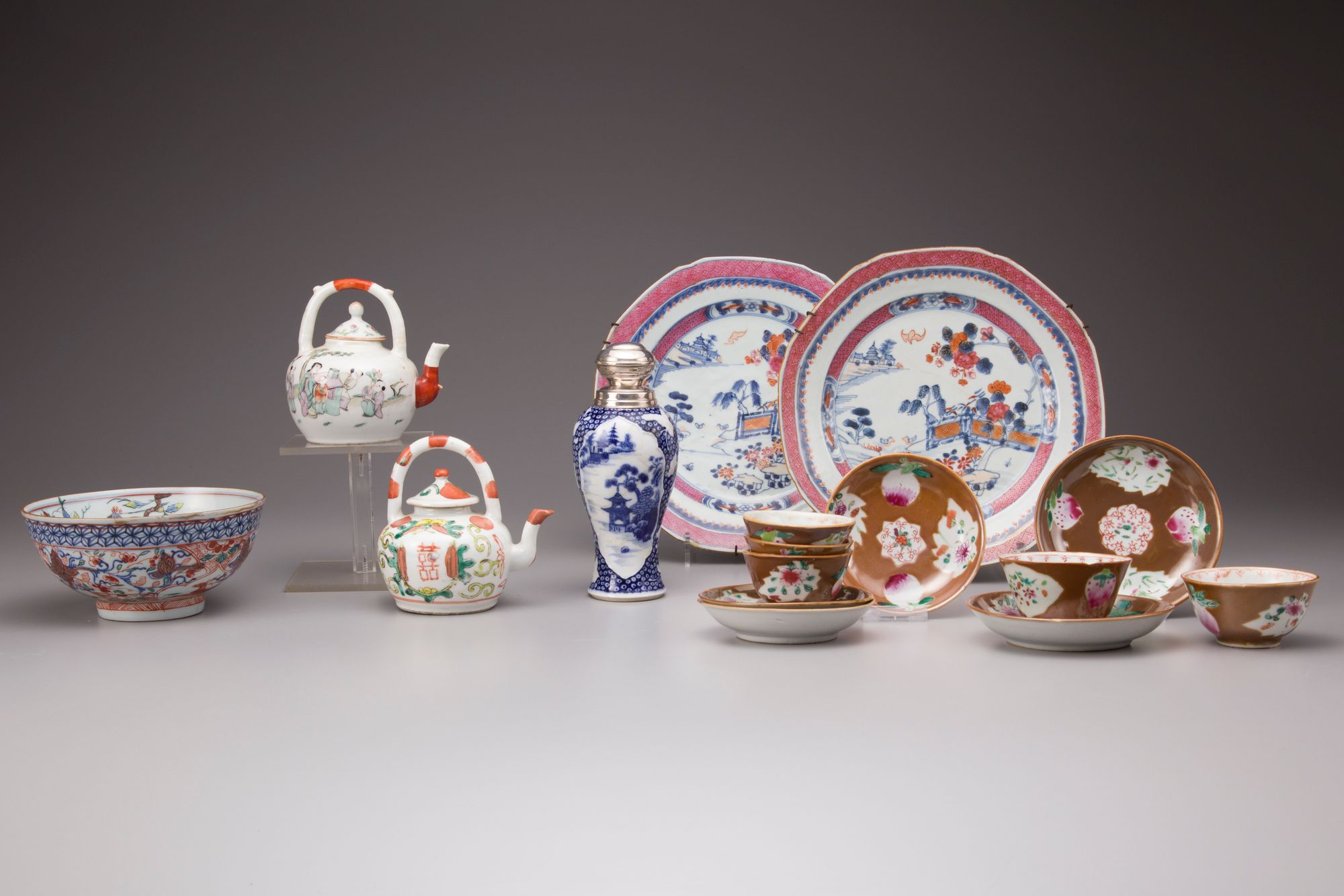 Consisting of two plates, five cups and saucers, one vase, one bowl and two teapots. Diameter 23 cm. and smaller