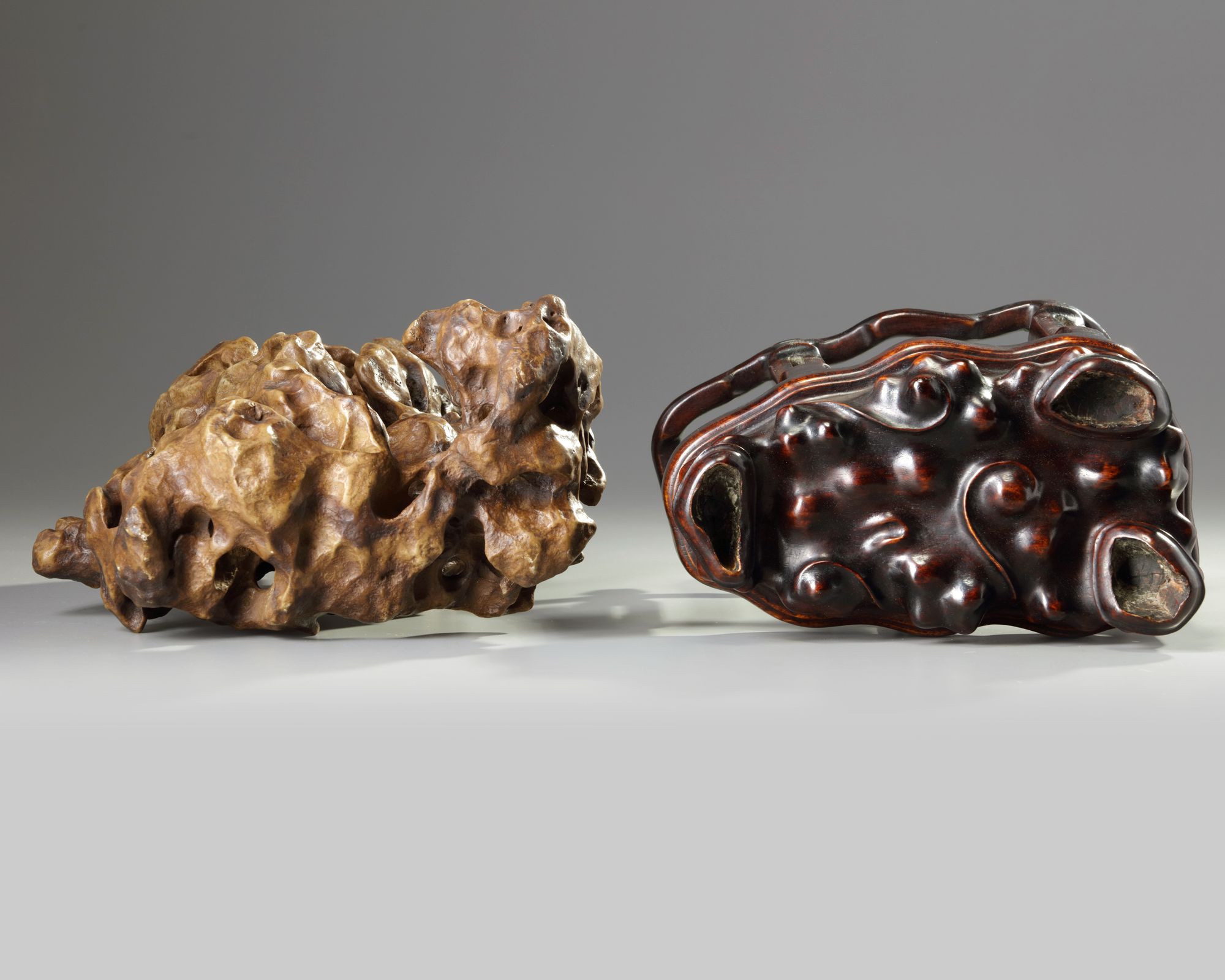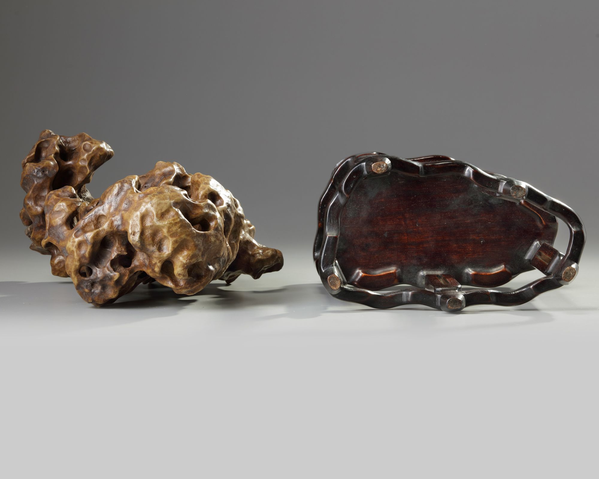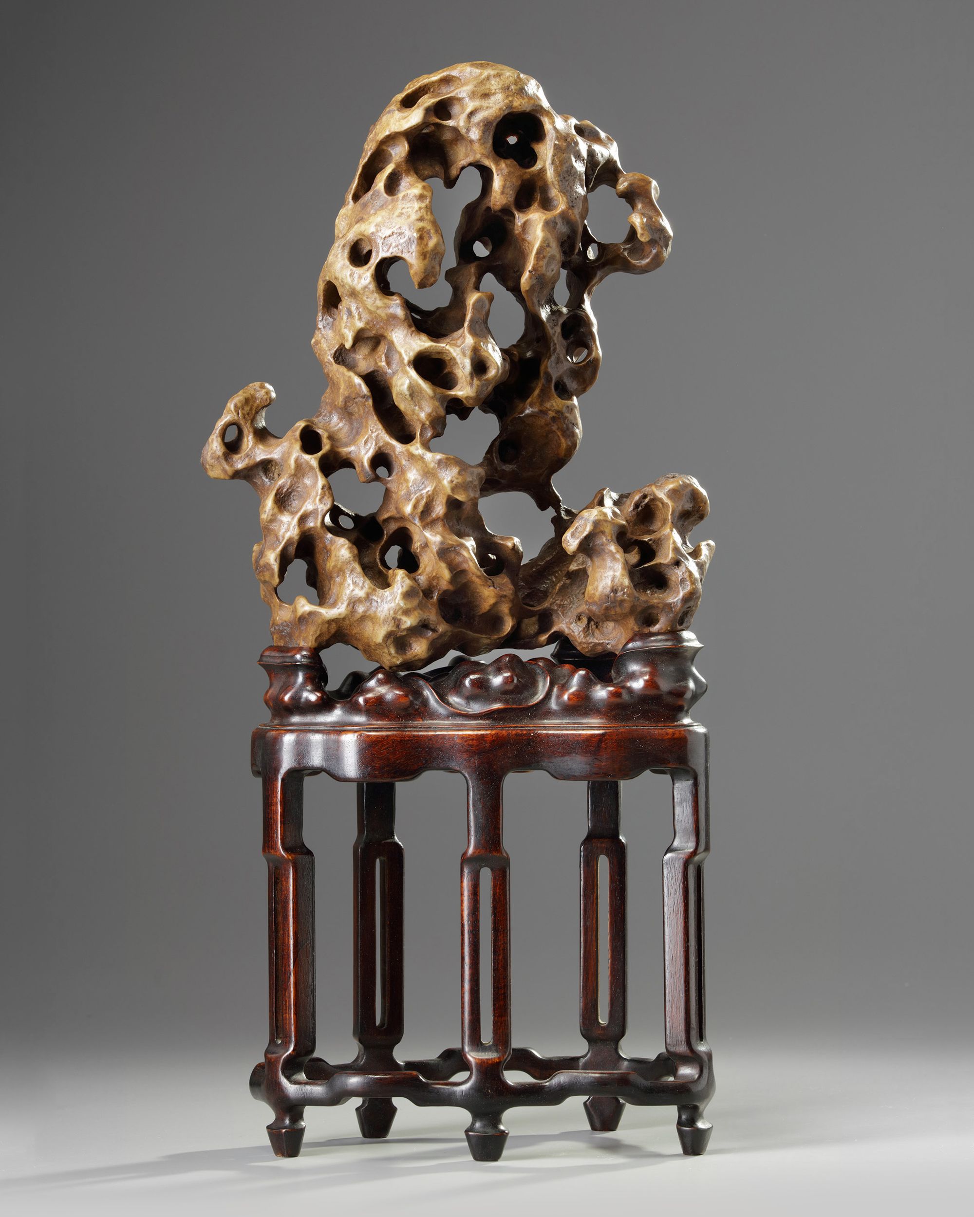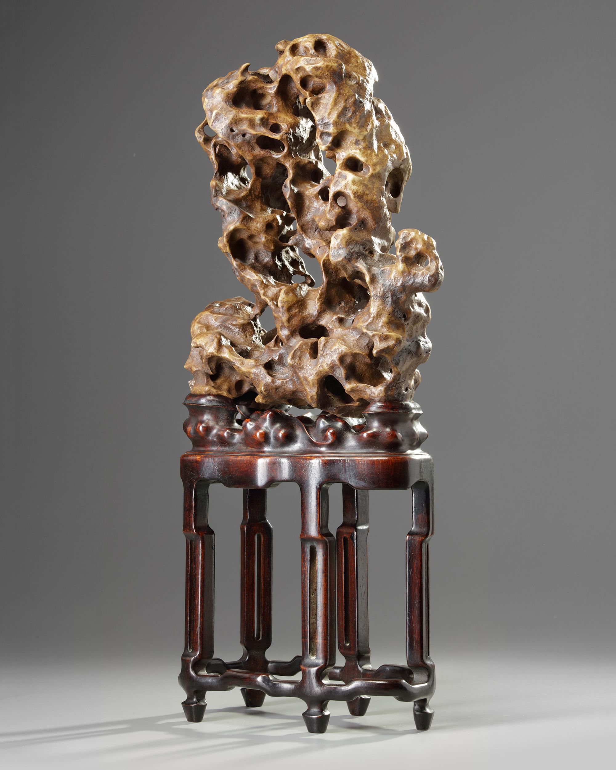 The creamy-brown coloured stone is realistically carved with an undulating surface and pierced with various apertures. The surface of the stone is both smooth and varying. The stand is carved with a naturalistic rolling surface and is supported on five angular legs. The stand 24 cm. wide, 28 cm. tall The stone 32 cm high, 26 cm wide Overall: 59 cm. high