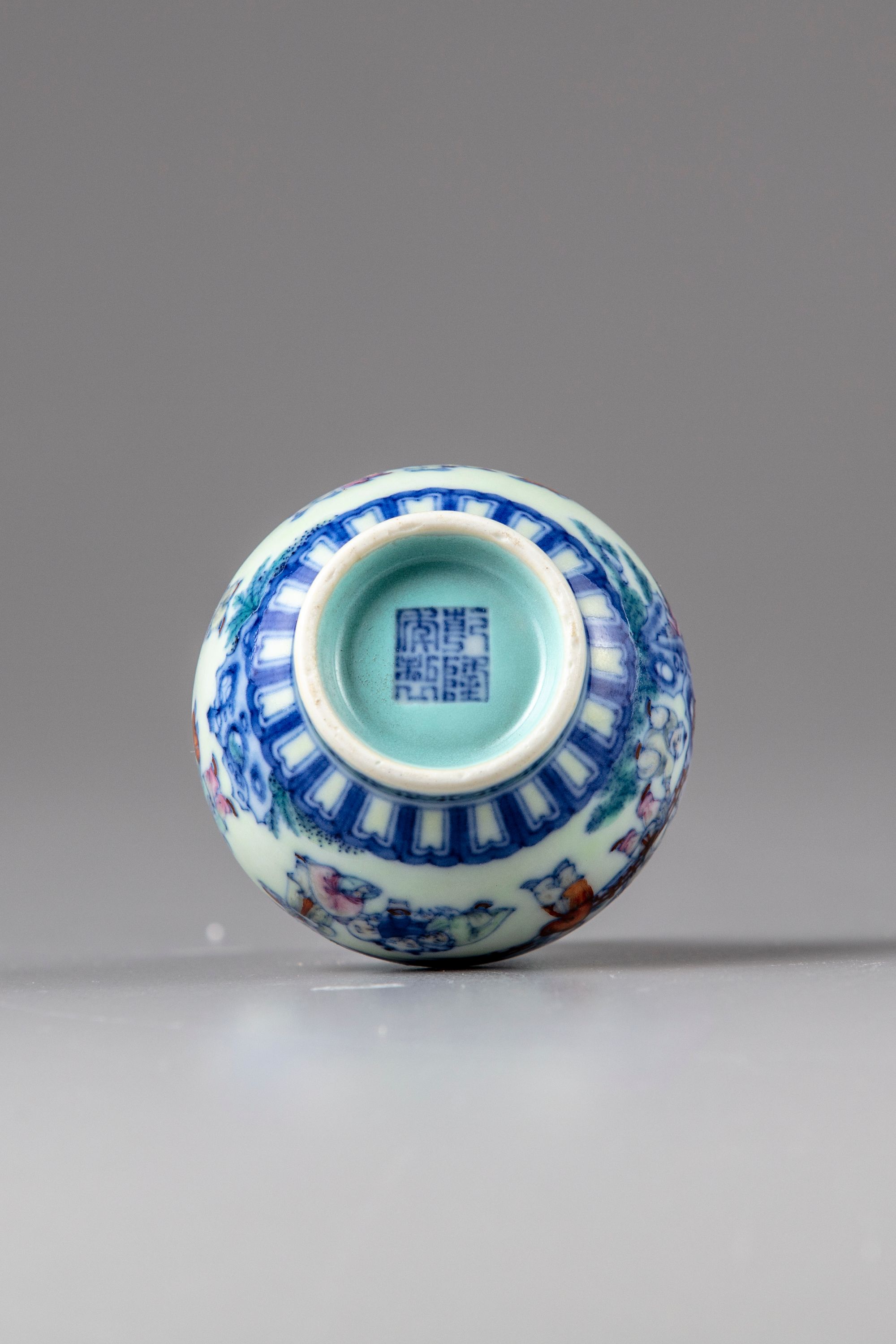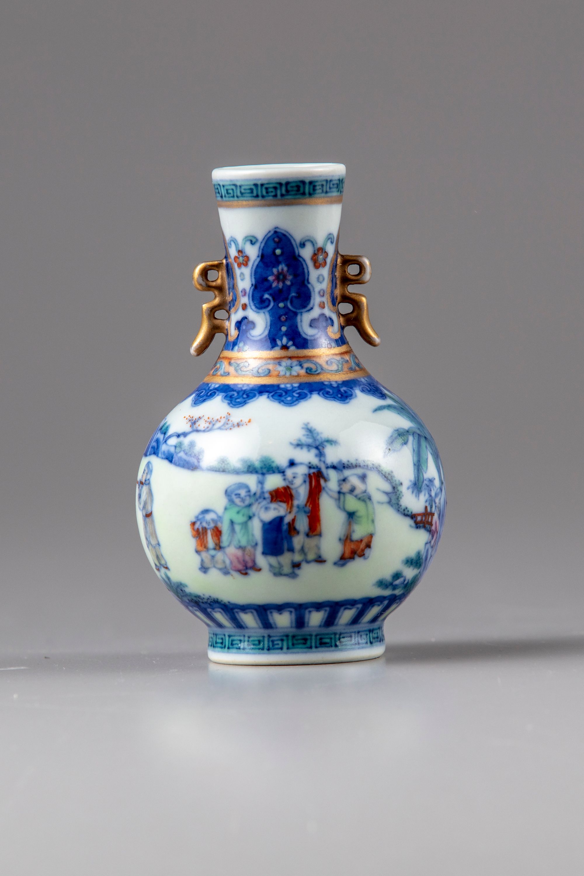 The vase is stylized with two gilt handles, decorated with boys at play in a fenced garden, set between a band of ruyi heads to the shoulder and a lappet border to the base . The neck with a band of elongated ruyi heads and key fret chain.The bottom with a Qianlong seal mark on a turquoise ground.