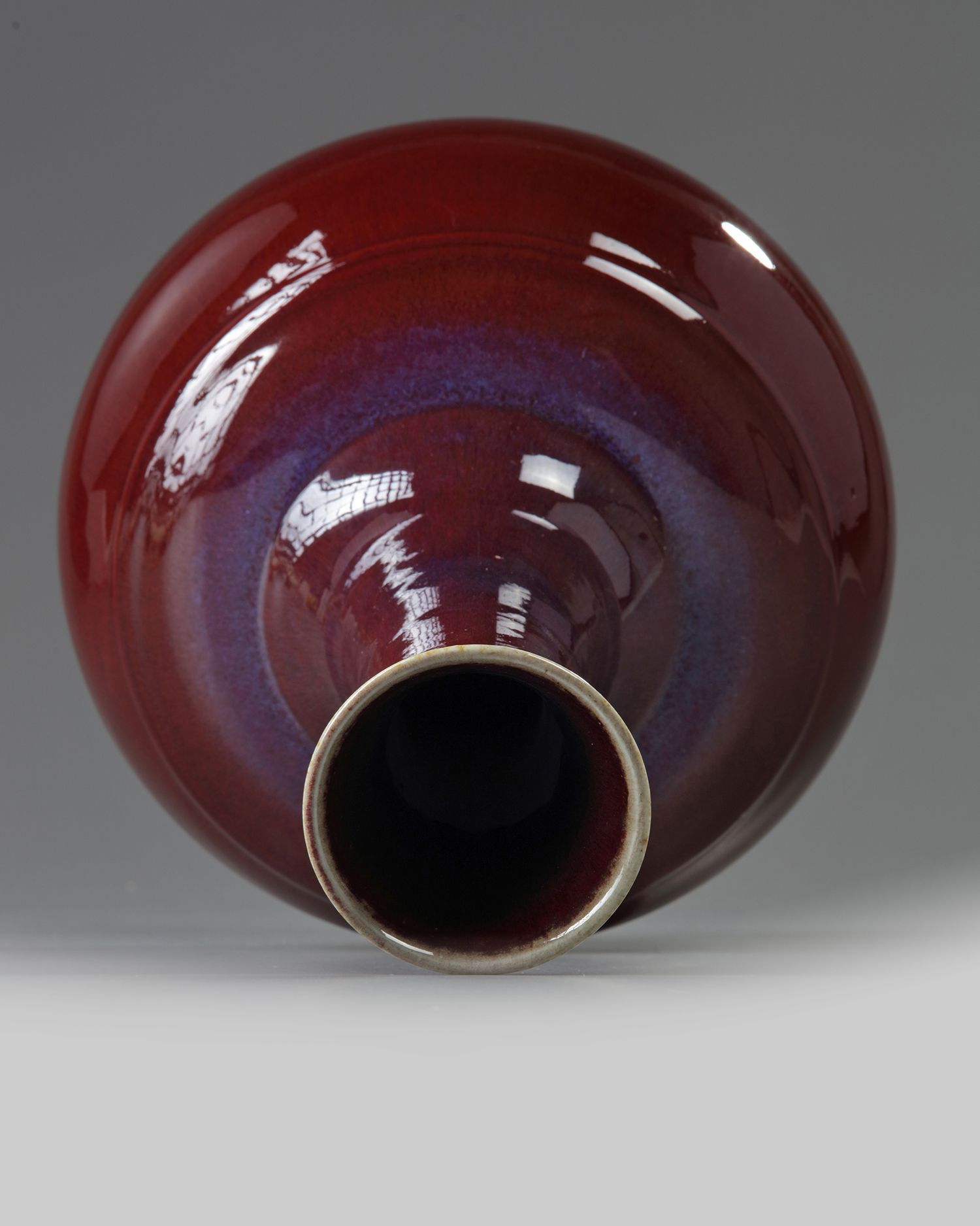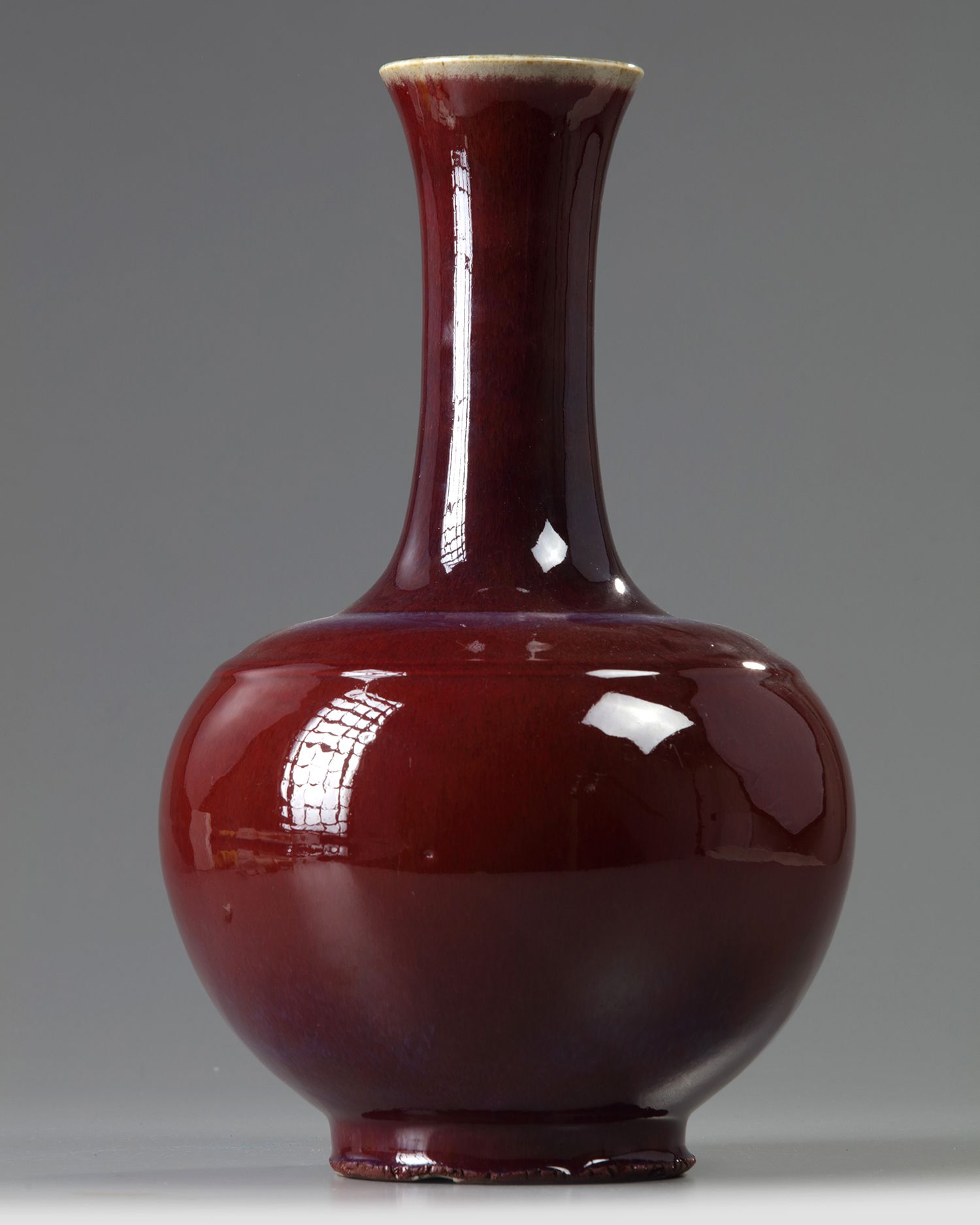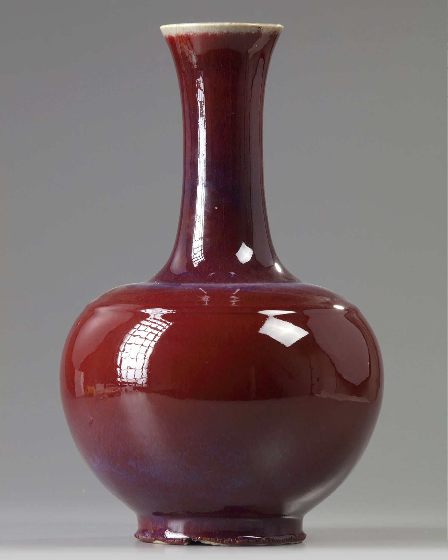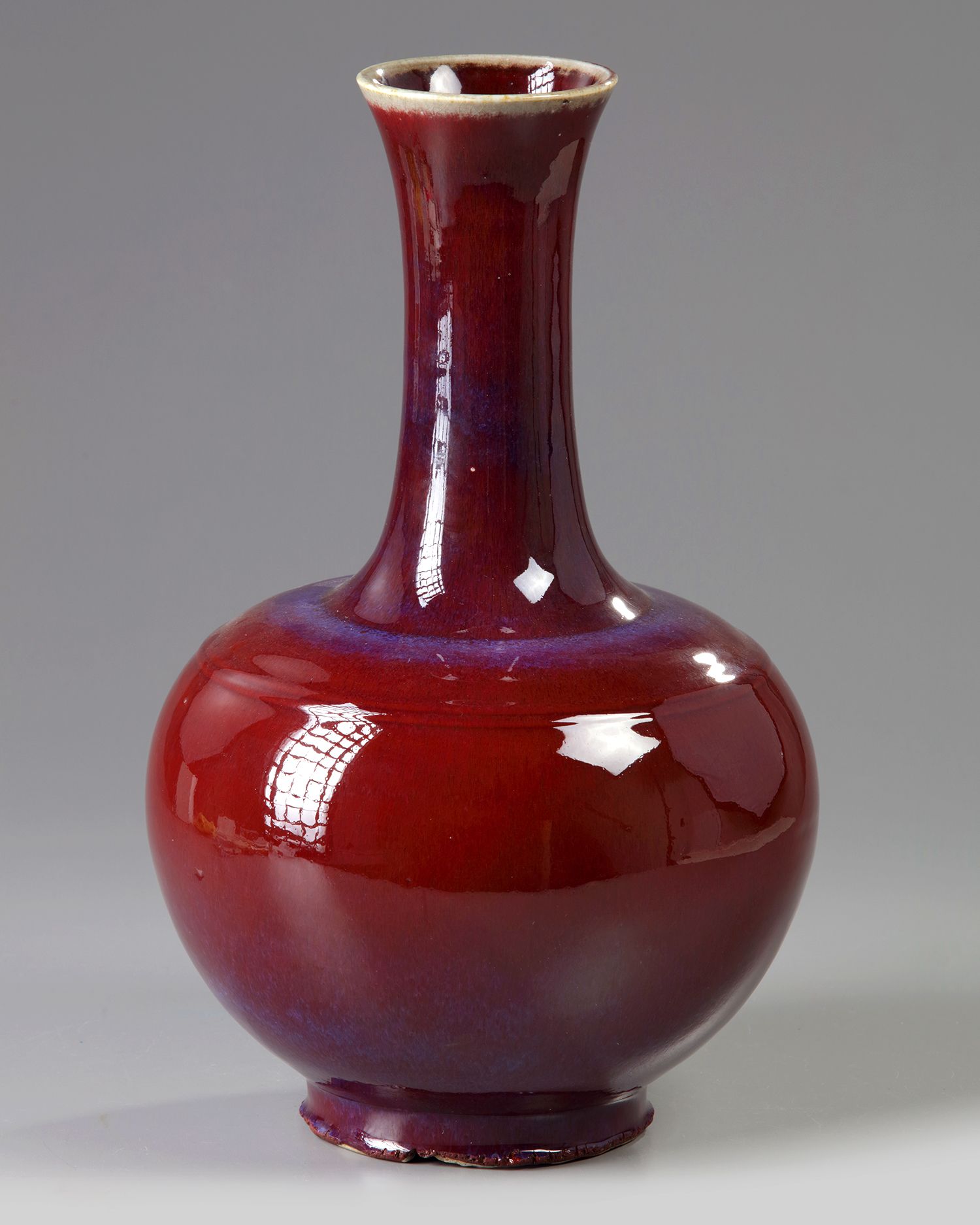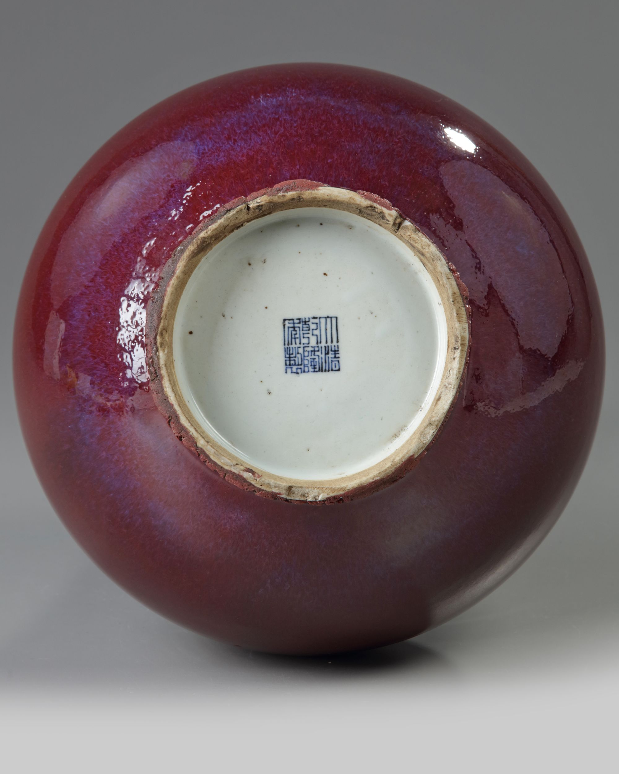 The vase is covered overall with a thick glaze of crushed strawberry tone suffused with purple highlights around the shoulder and thins to a mushroom tone at the rim. The base with an apocryphal Qianlong mark.