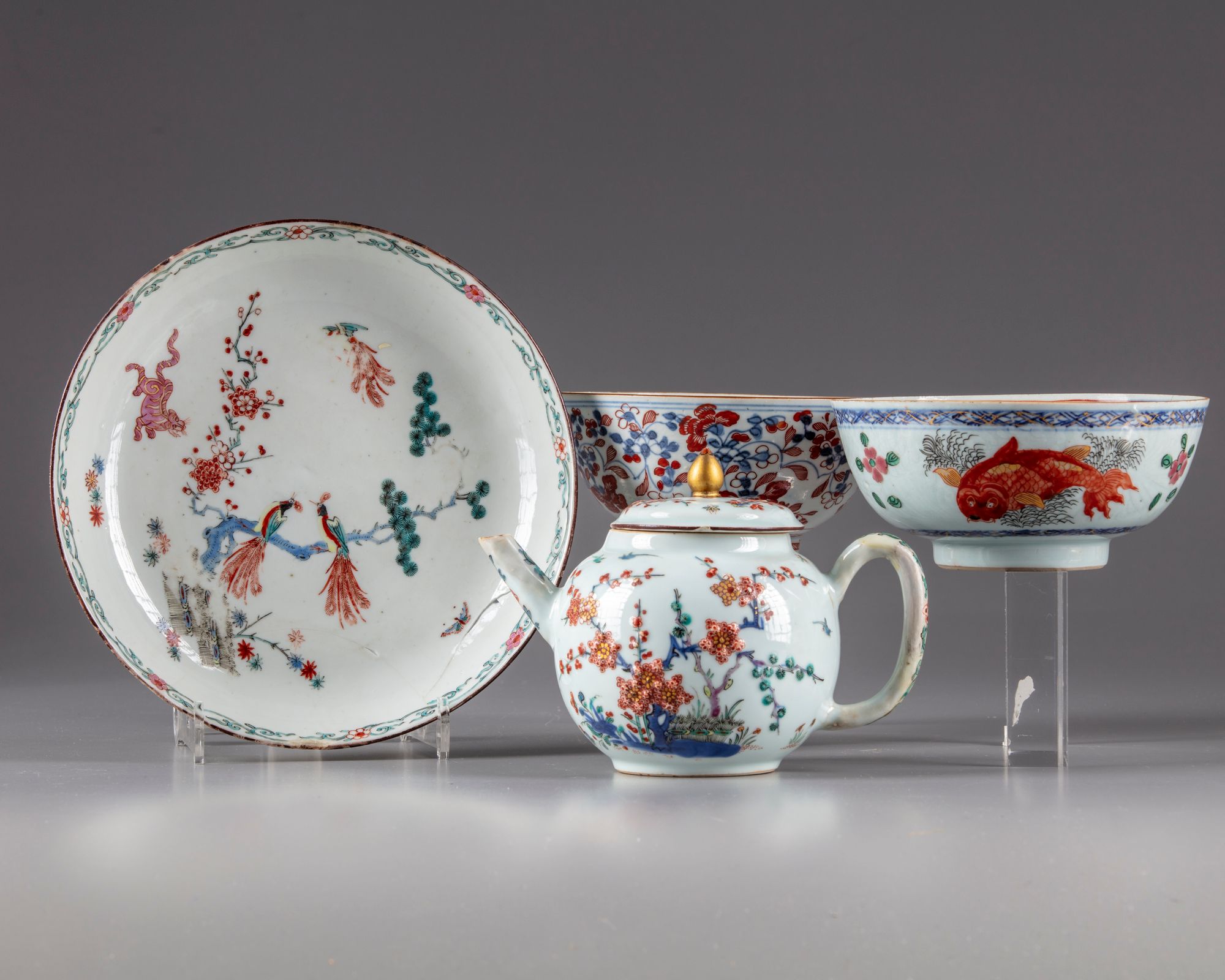 - A dish decorated in colorful enamels with two birds perched on a tree branch with flowers, 21 cm.