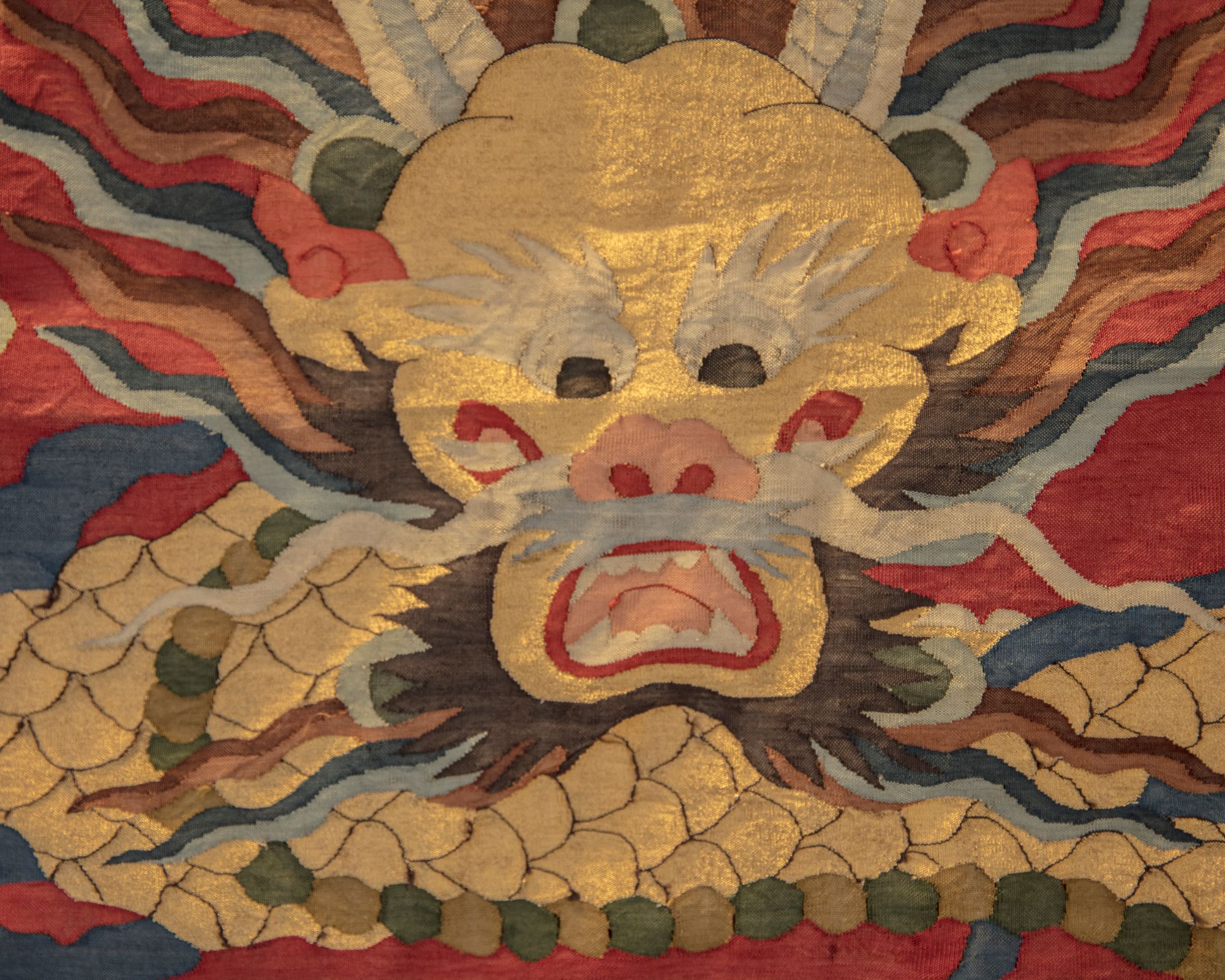 The panel is woven with a front-facing five-clawed dragon chasing the flaming pearl amongst clouds above a mountain with an elephant and precious objects floating in crashing lishui waves.