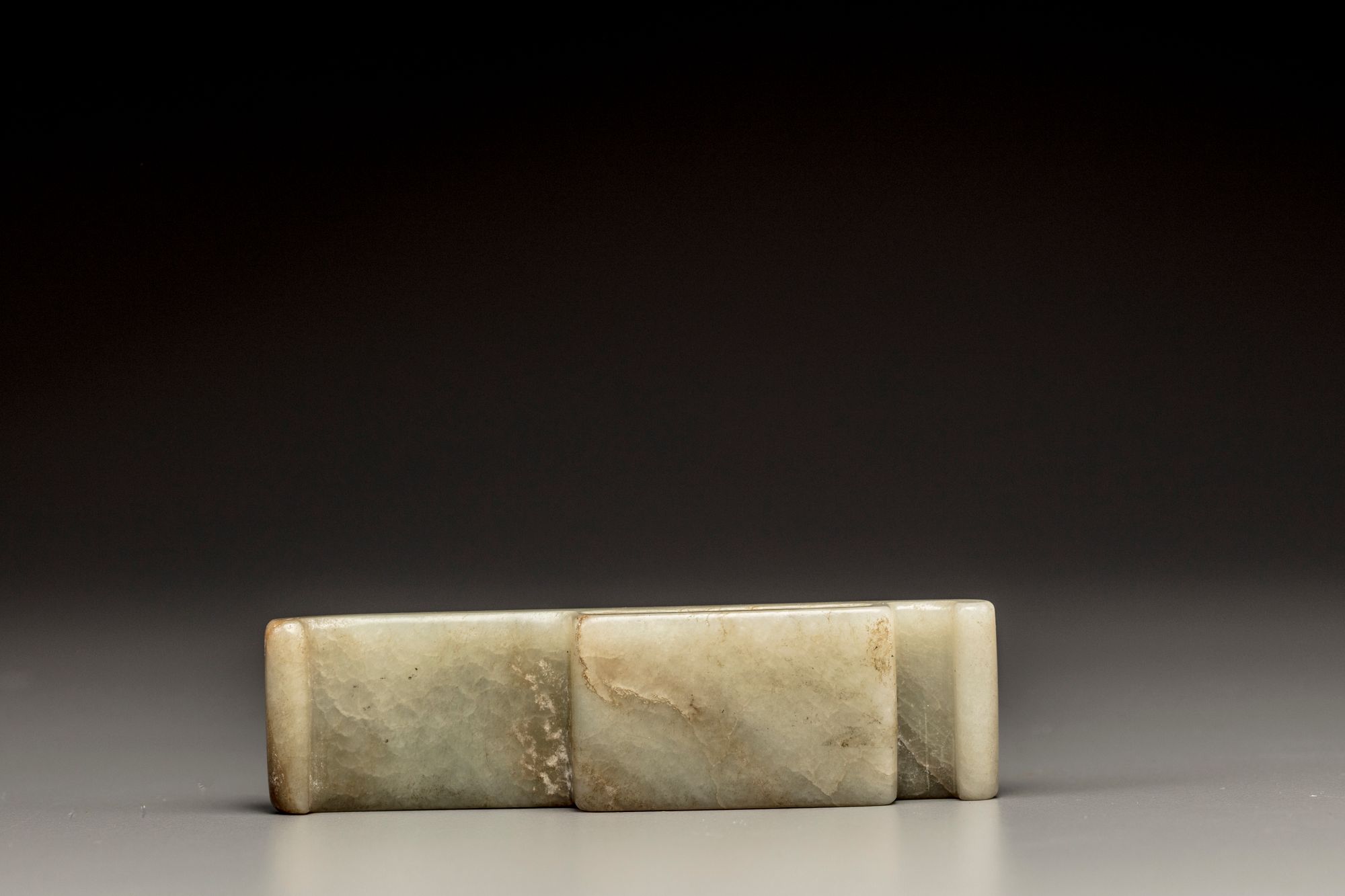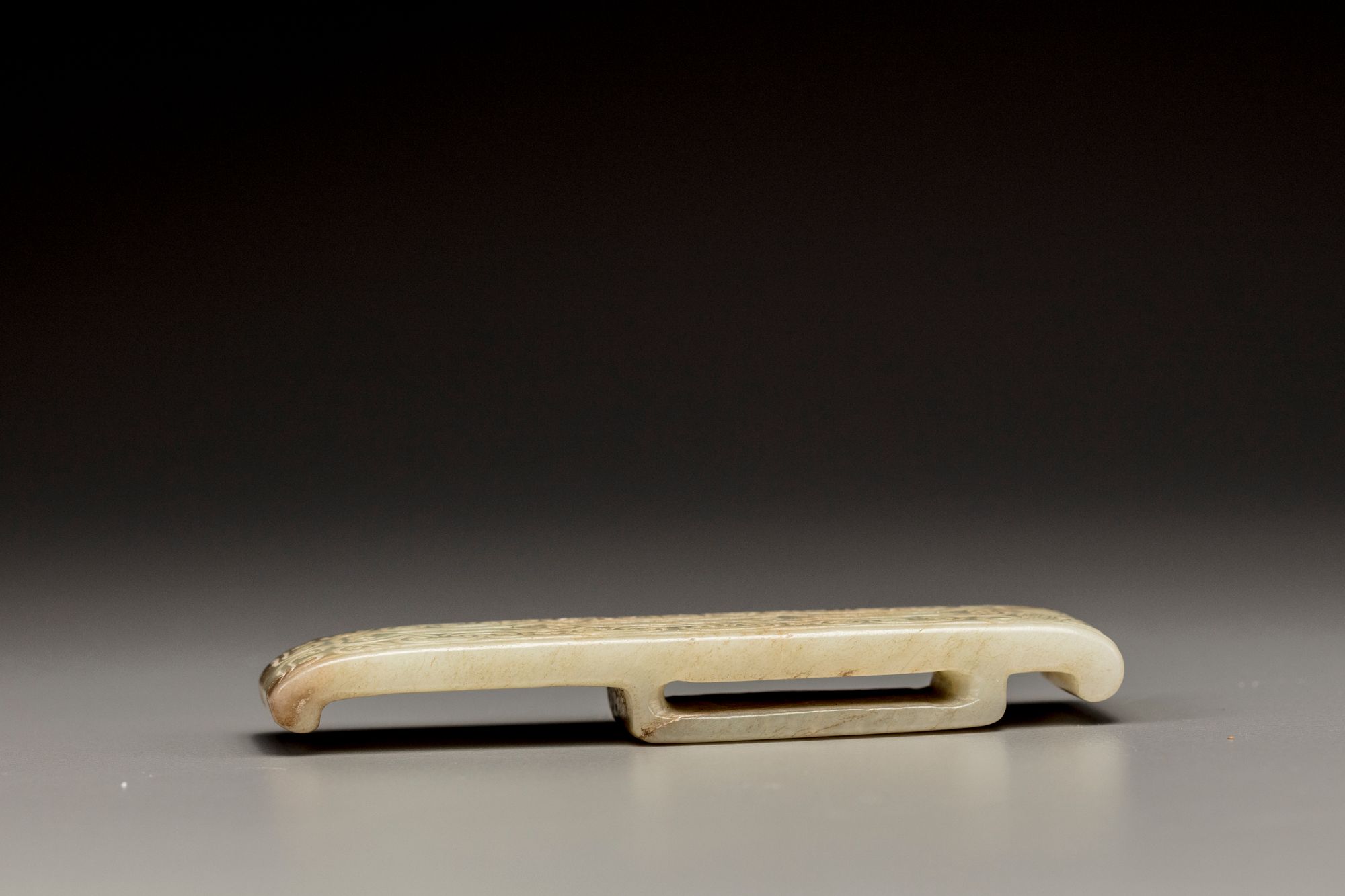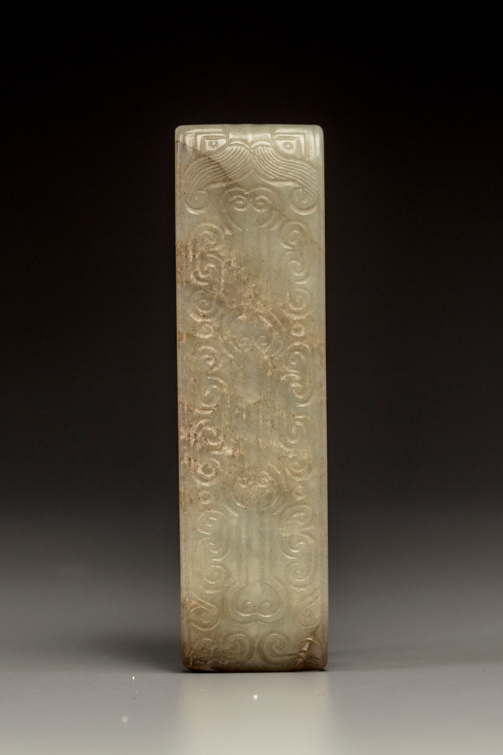 The upper surface is carved with archaistic c-scrolls and a taotie mask to one end. The stone is of a celadon tone with russet and white veins.