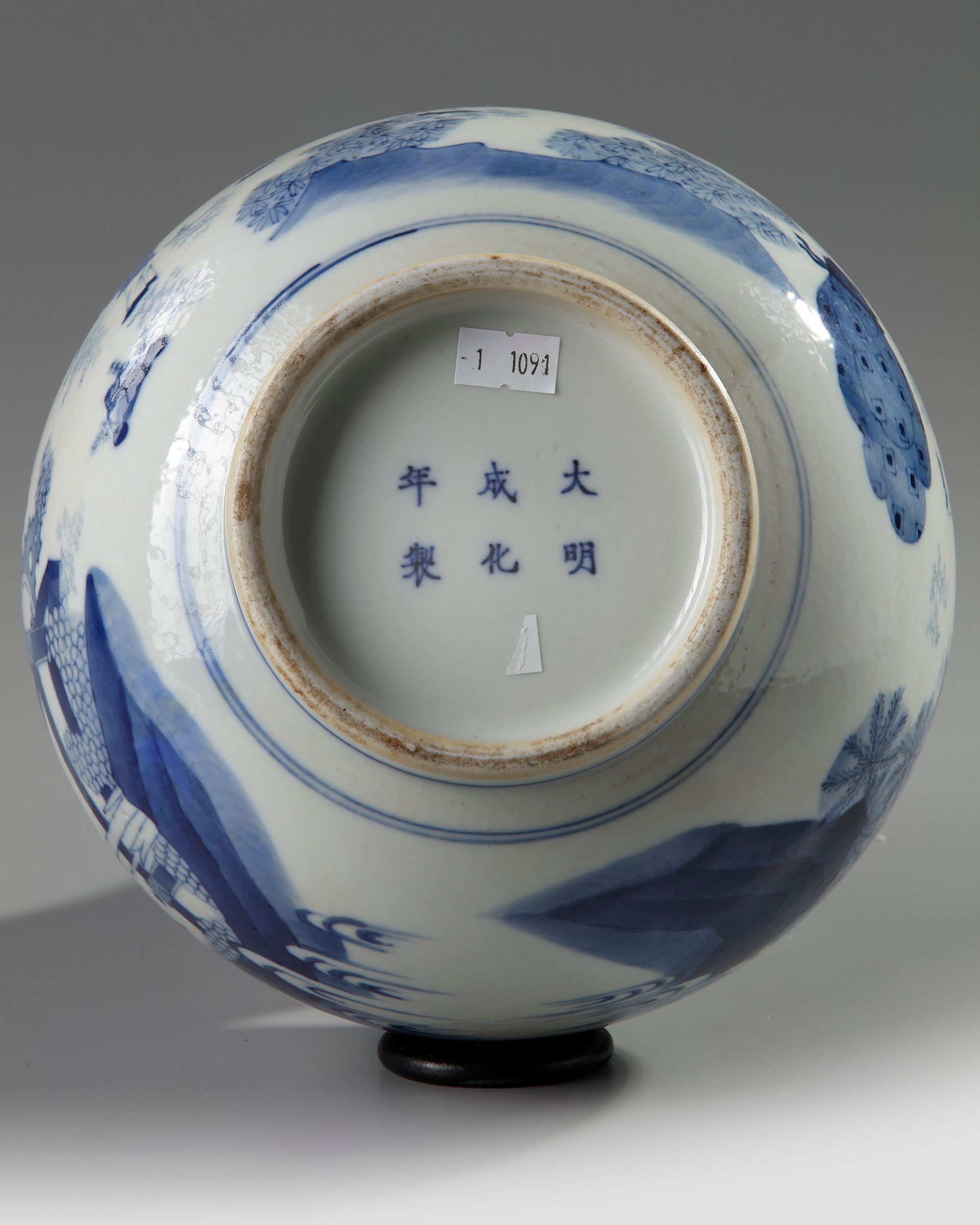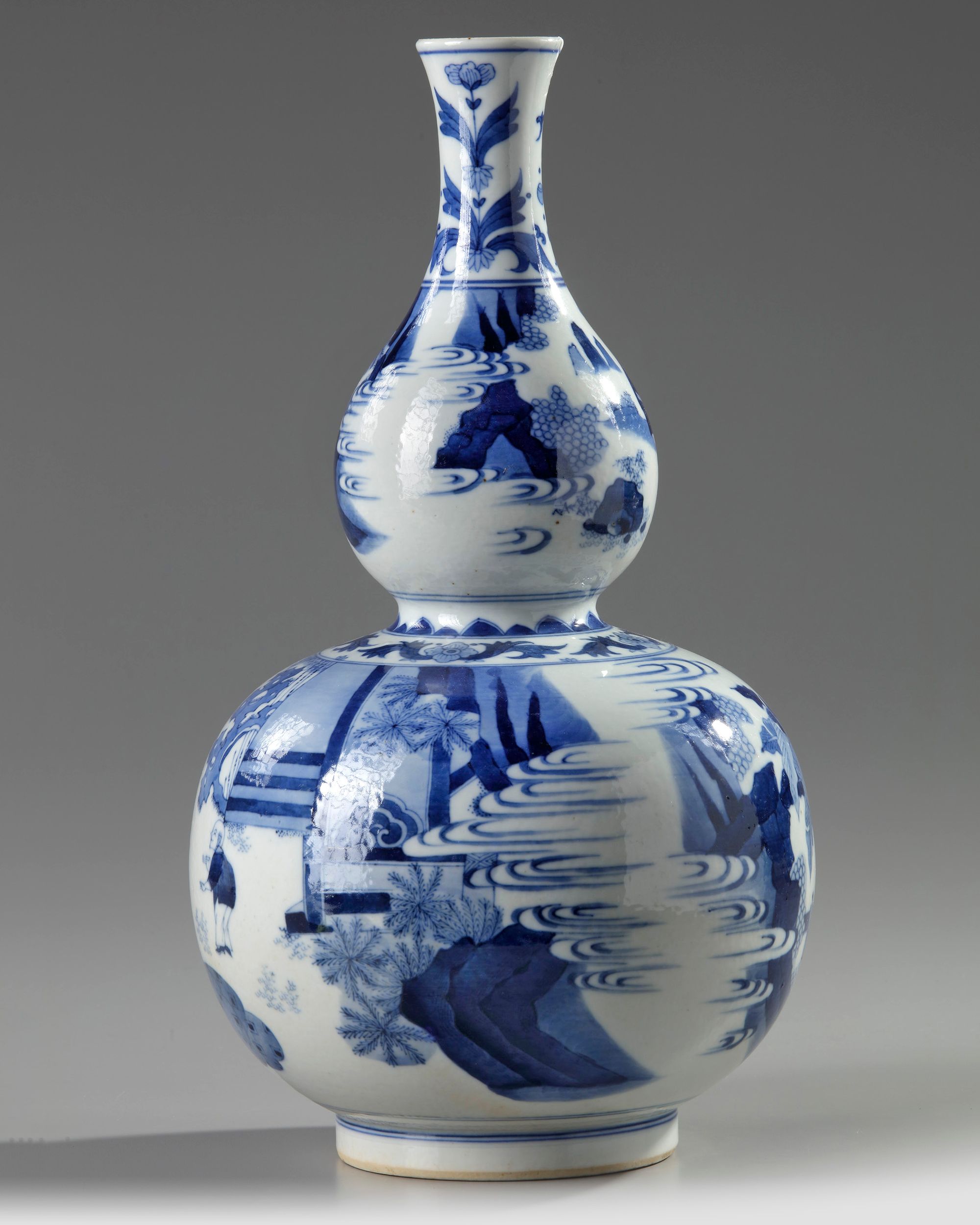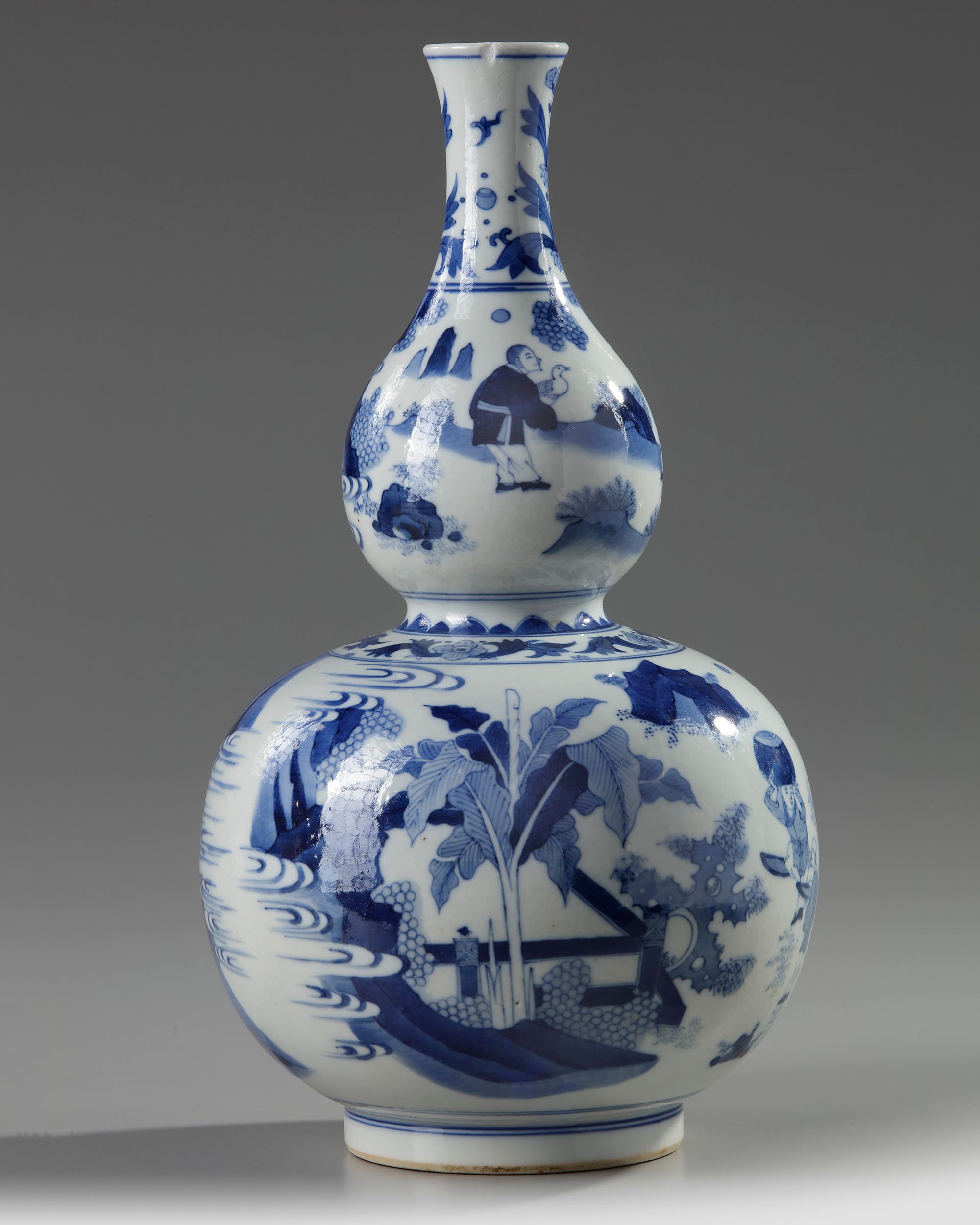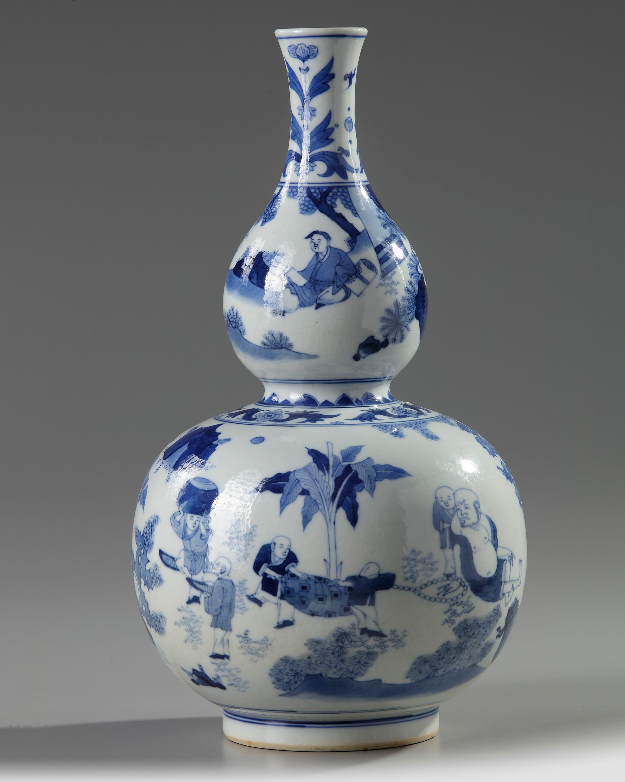 The lower globular section is decorated in blue with Budai and his attendants in garden amongst plantain. The upper section is decorated with a scholar and attendant holding a goose. The waisted neck is decorated with a tulip spray. The base with an apocryphal Chenghua mark.