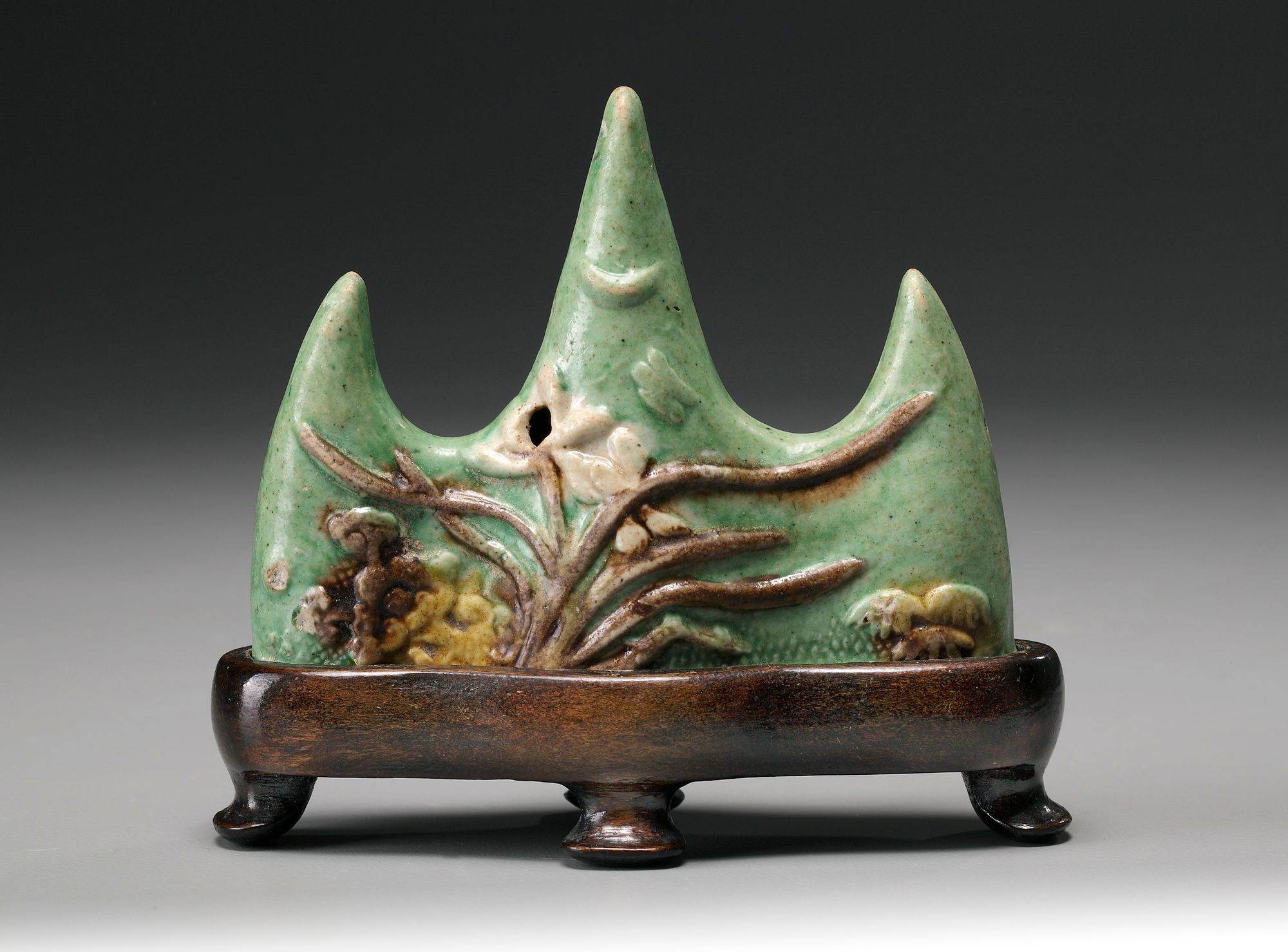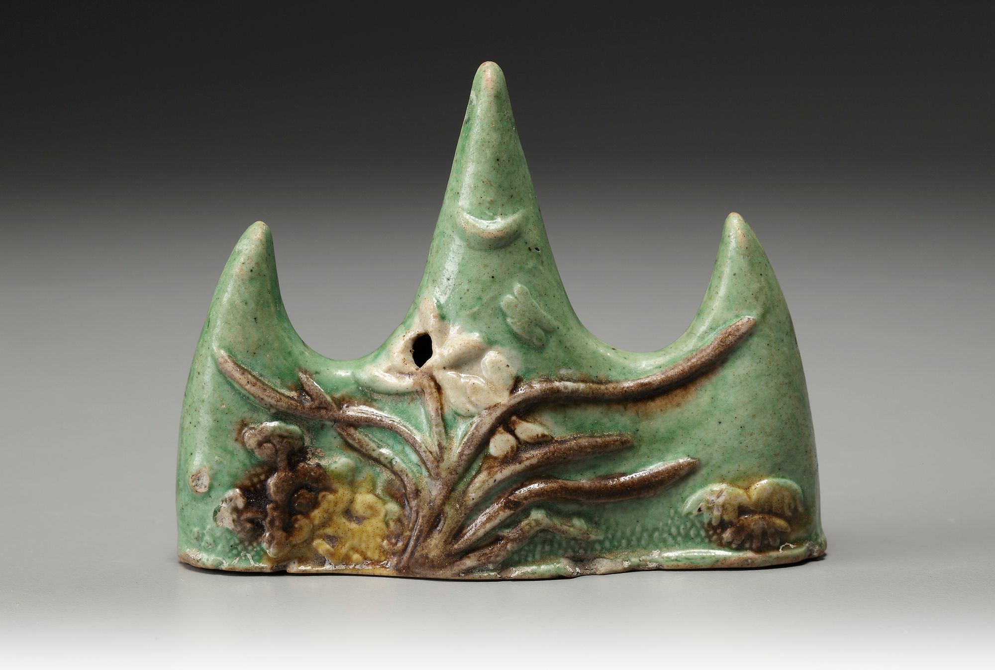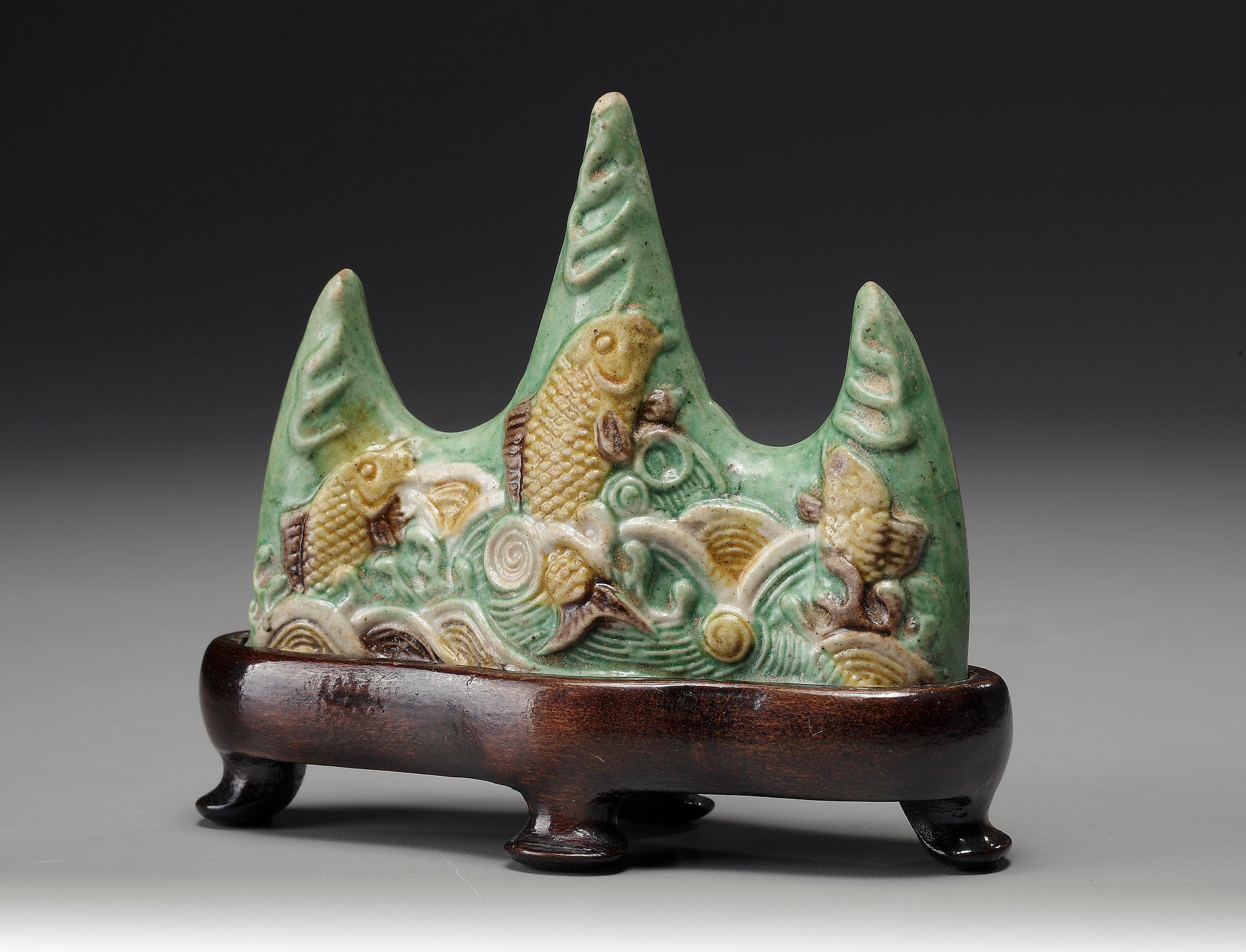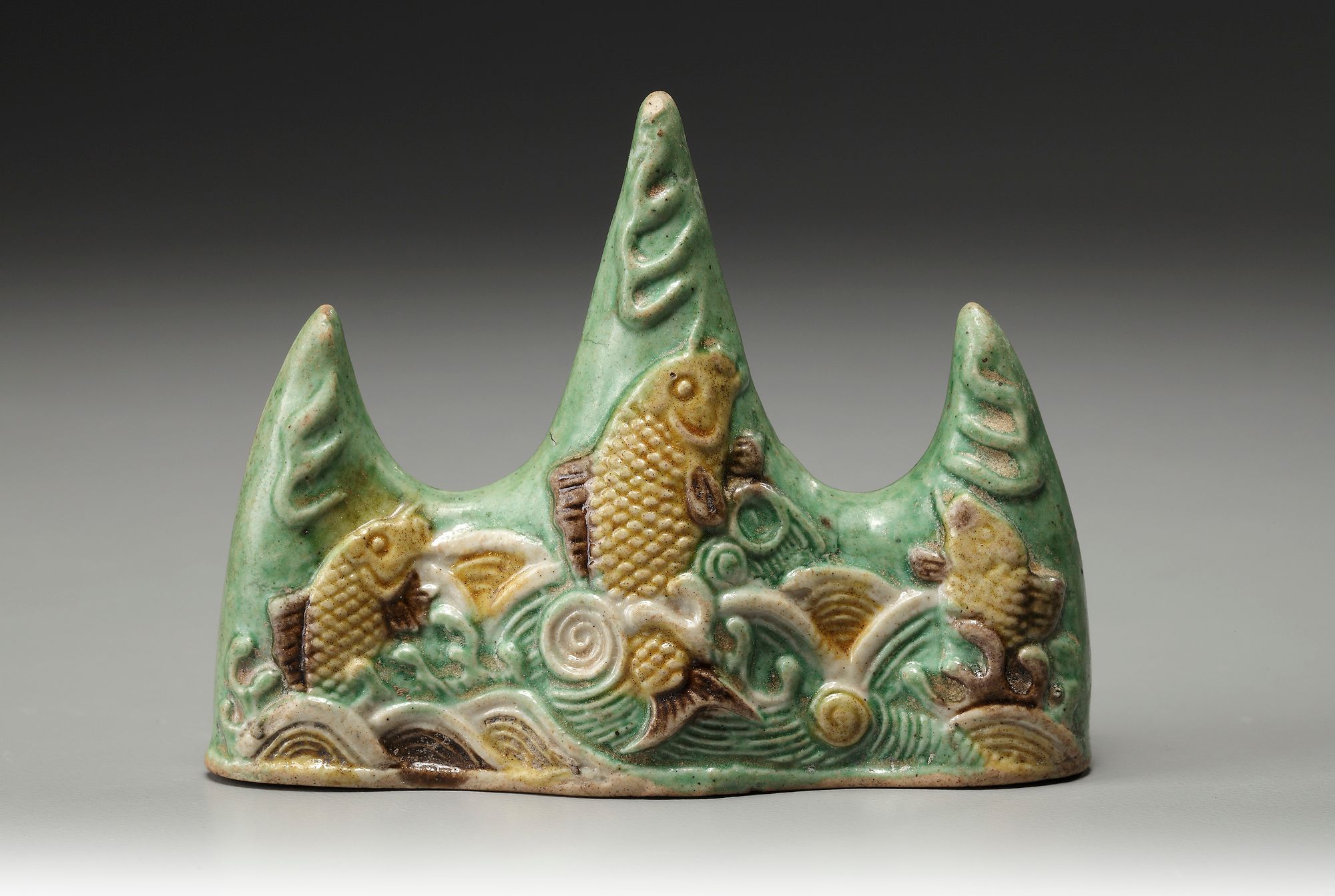 In the shape of three large waves with fish jumping out of the water, decorated with yellow, green and aubergine enamels.