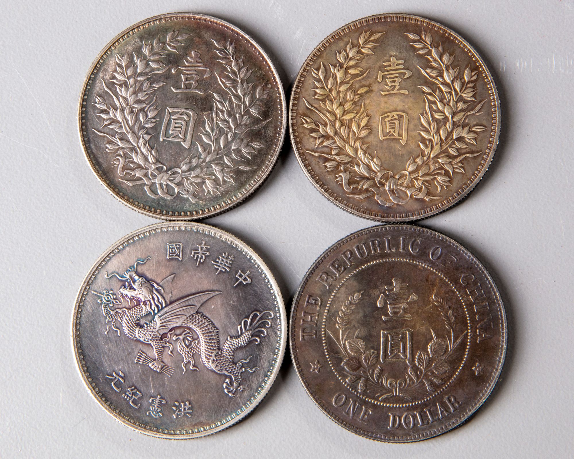 Four silver Chinese coins, incised with famous statesmen like stalin