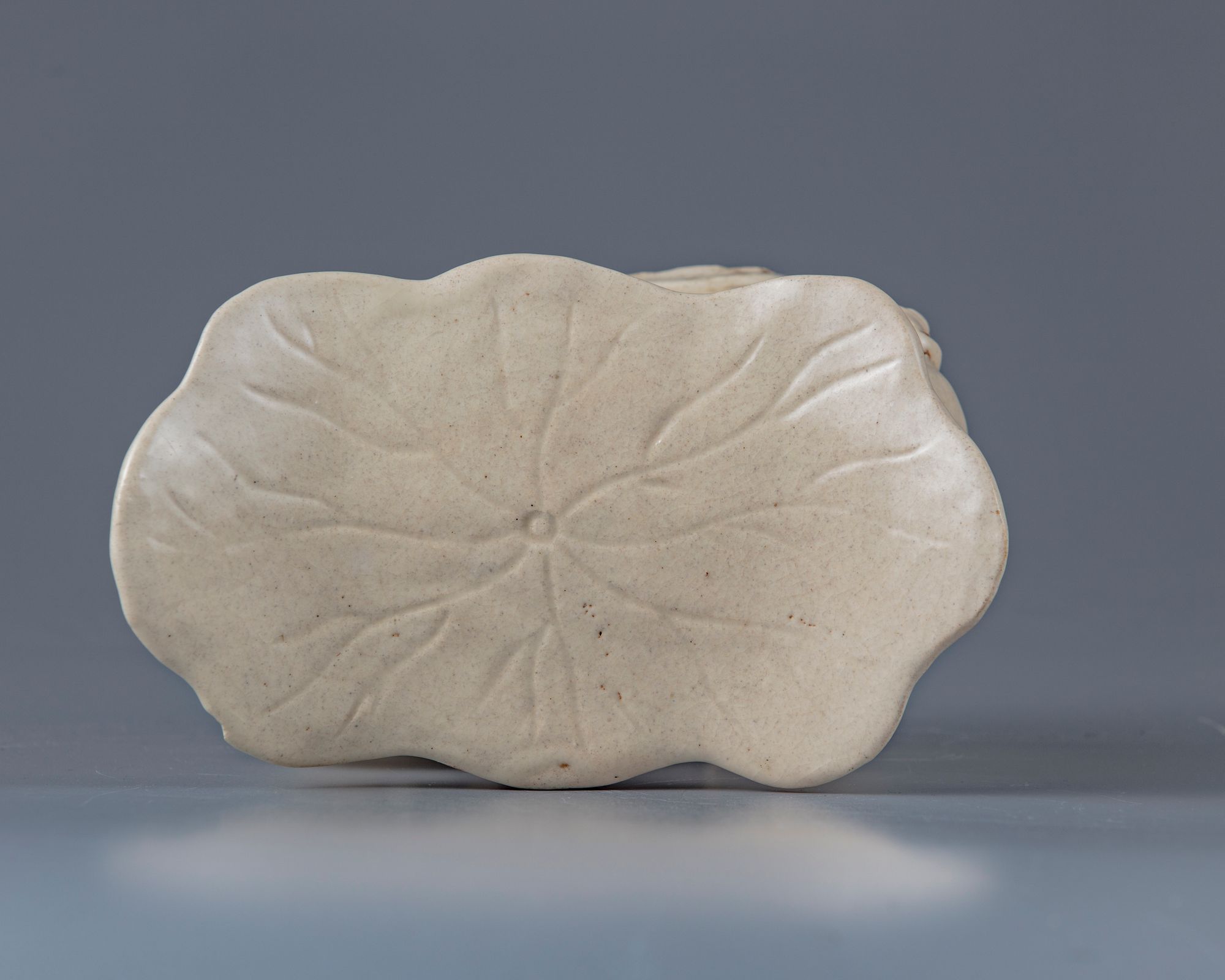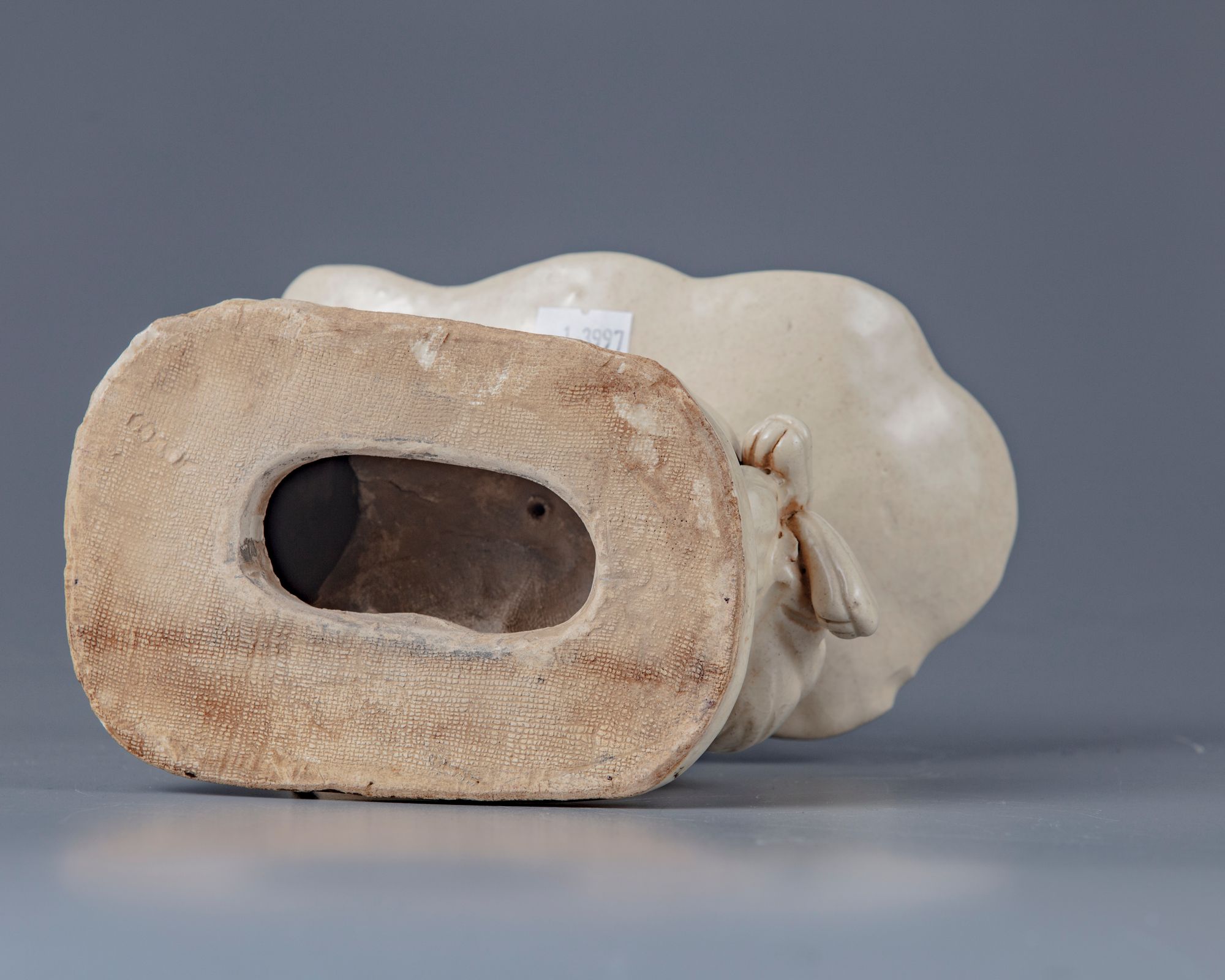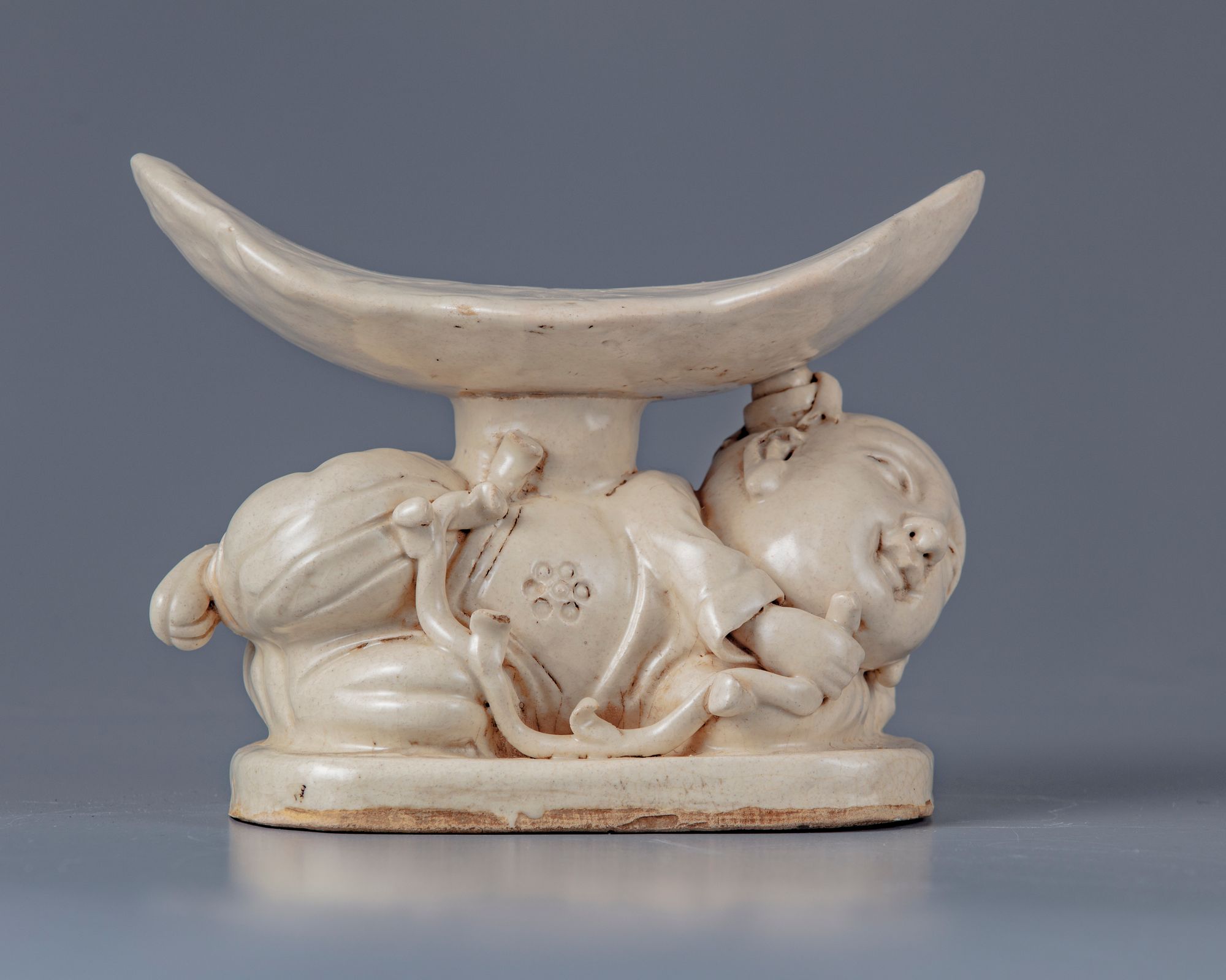 The pillow is modelled with a foliate headrest carved and incised to the top, above a boy holding a flag scroll in his hand,the face with a calm expression detailed with half-closed eyes, covered overall with a soft transparent glaze.