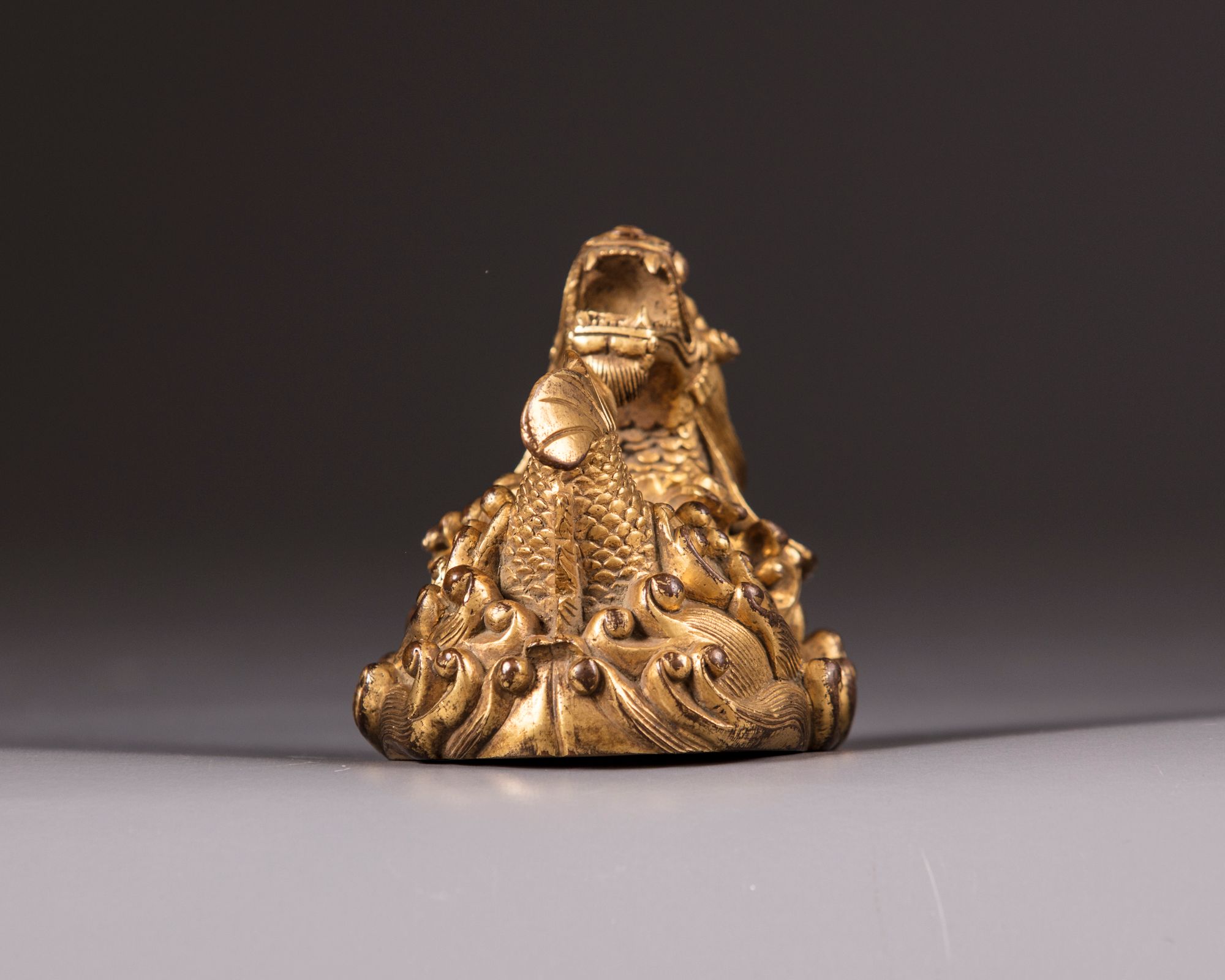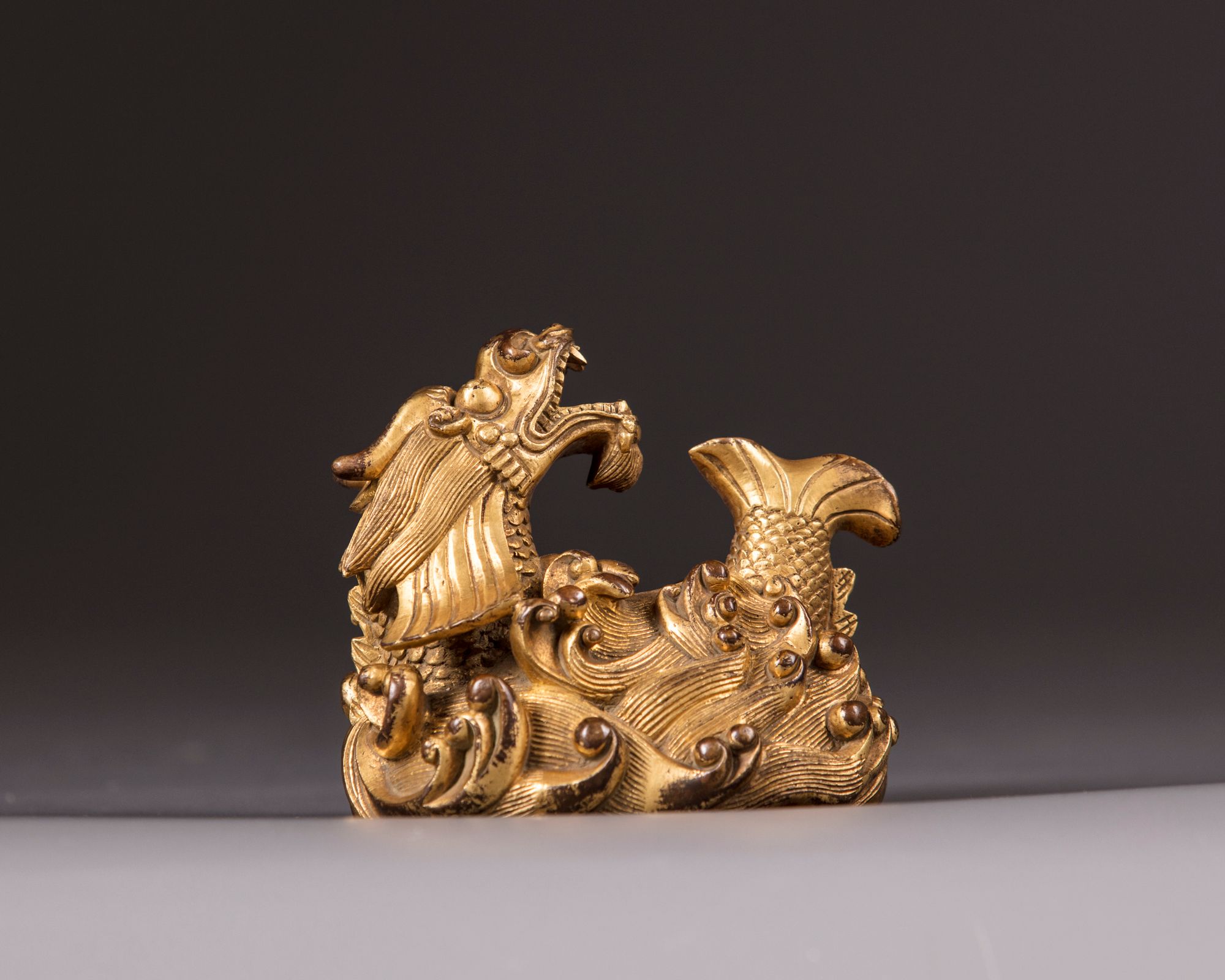The piece is modelled as a mythical creature with fierce dragon head with its mouth open and carp body leaping from tumultuous foaming waves. The base with an apocryphal Yongzheng mark.