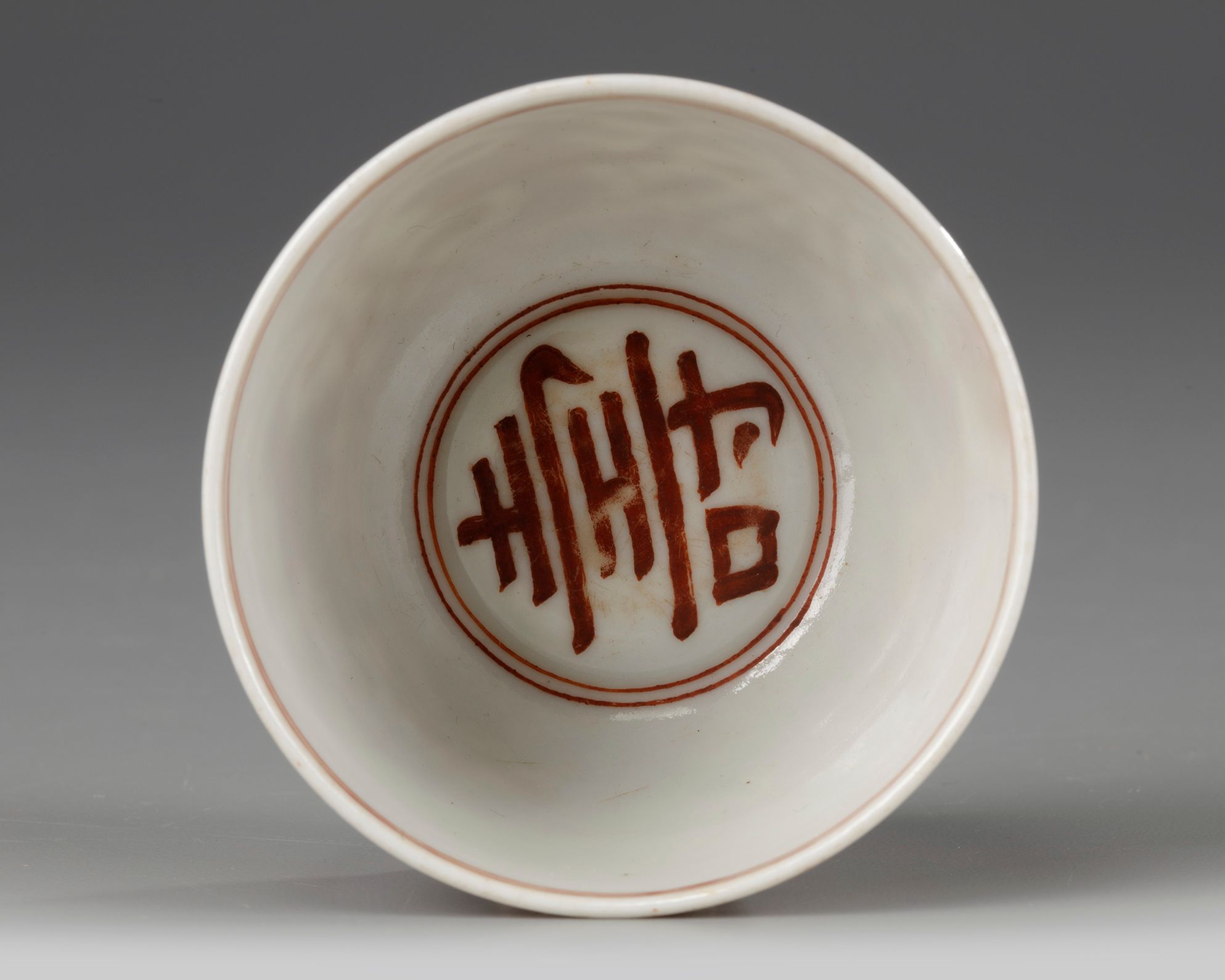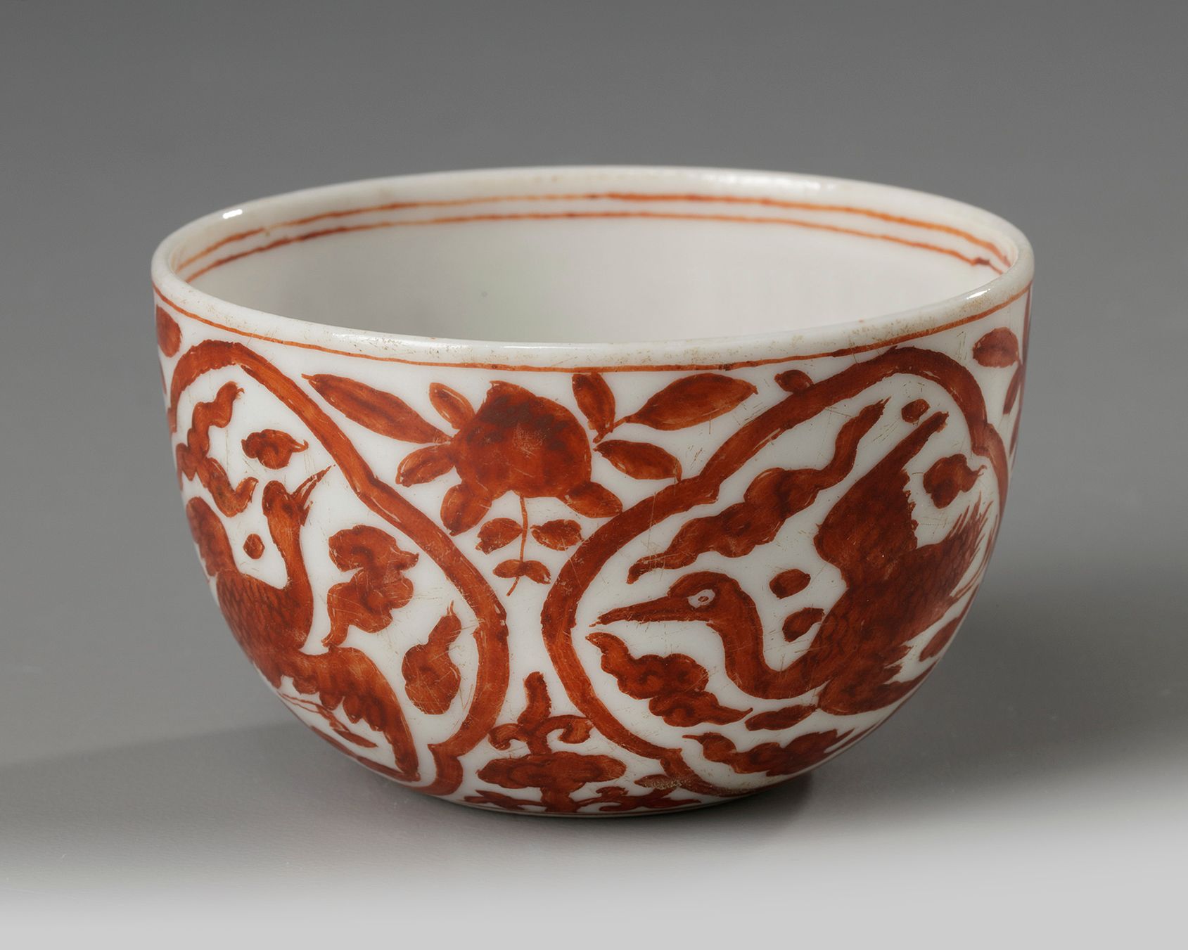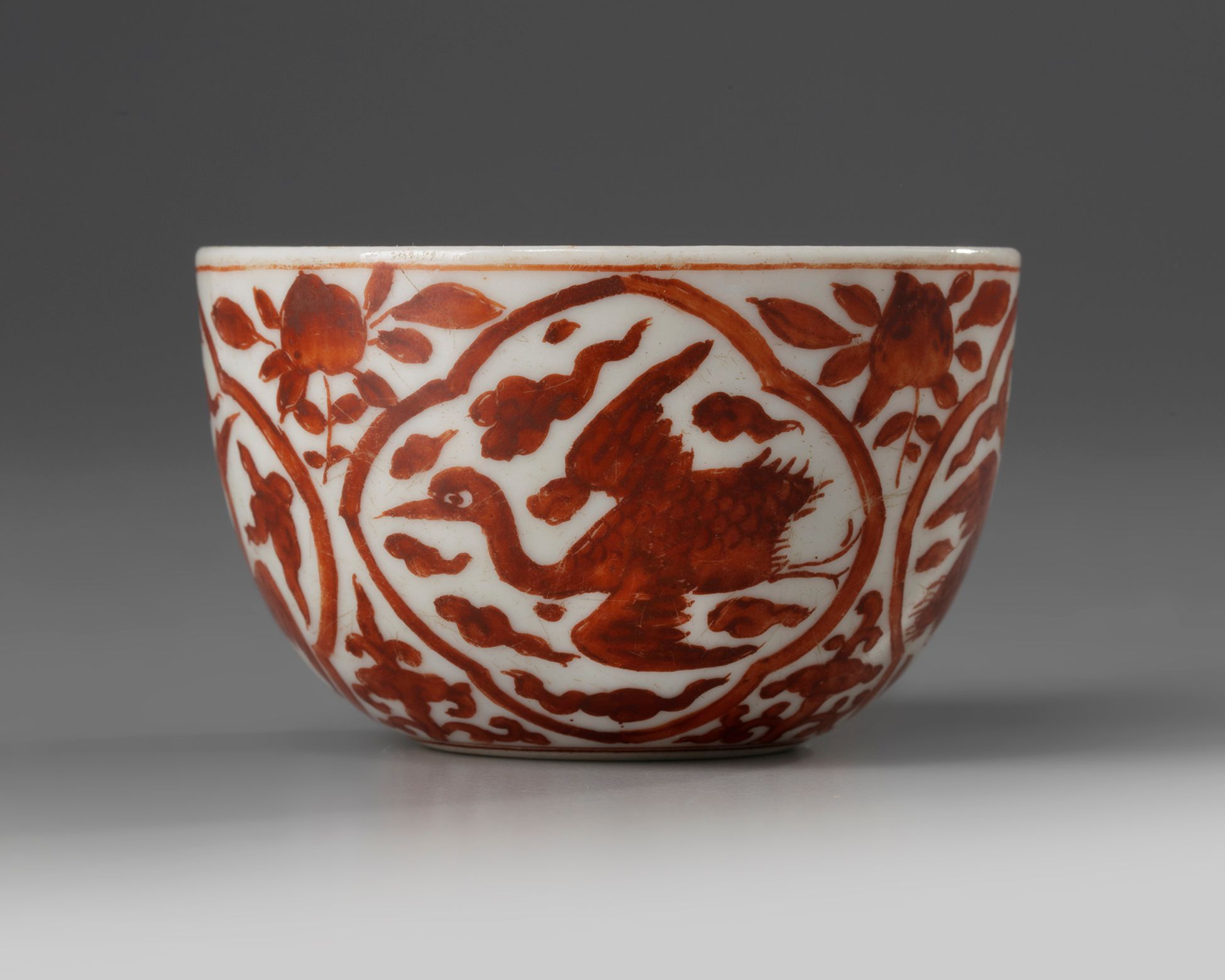 The exterior is decorated with four shaped medallions enclosing cranes in flight, separated by lingzhi and peach sprays. The interior is decorated with a shou character, and the base with an apocryphal Jiajing mark.