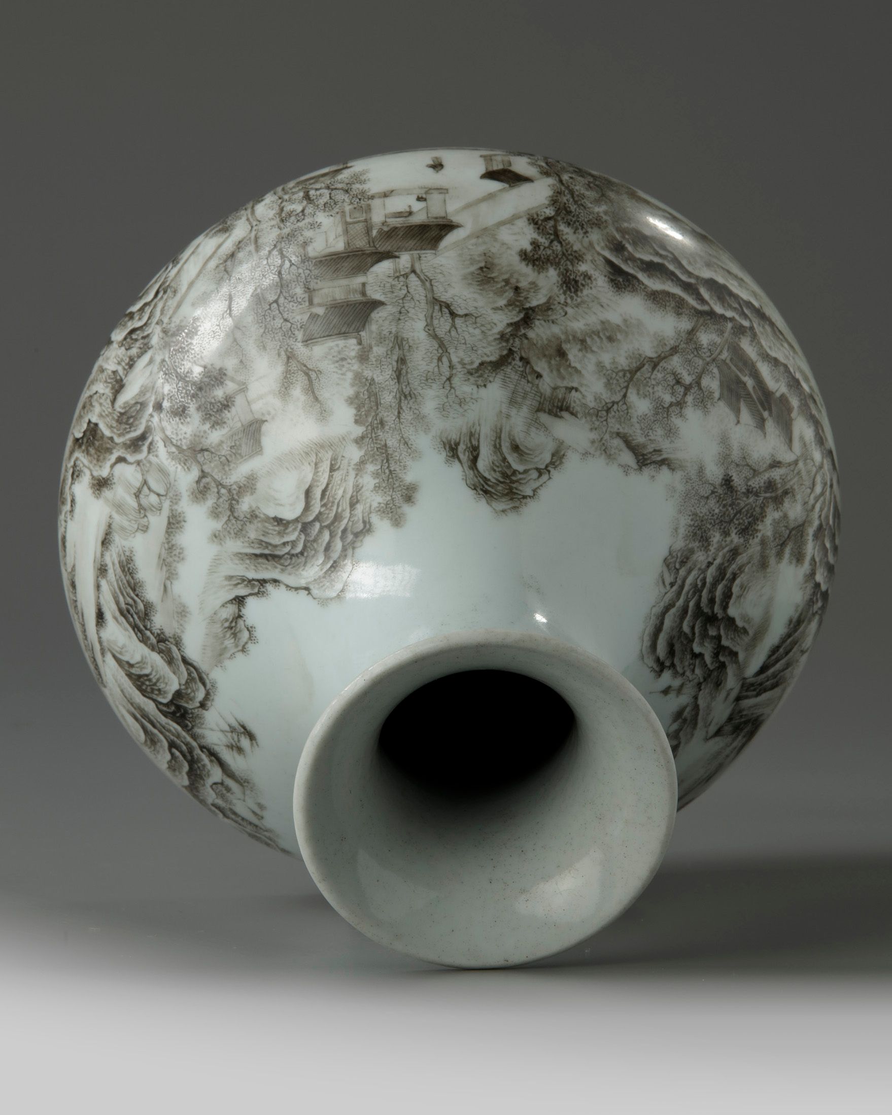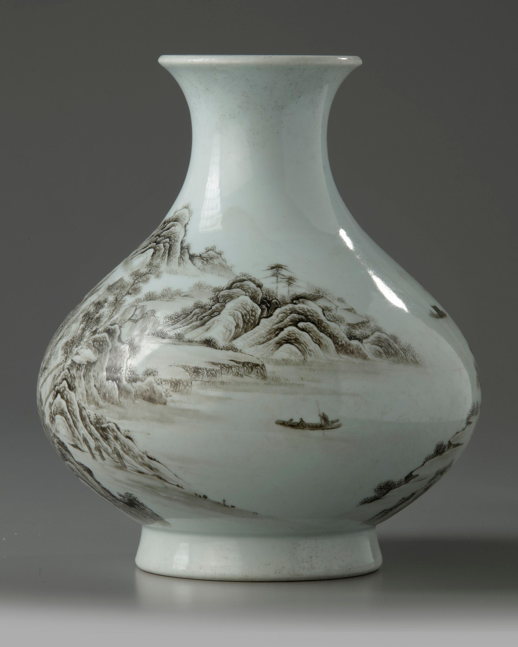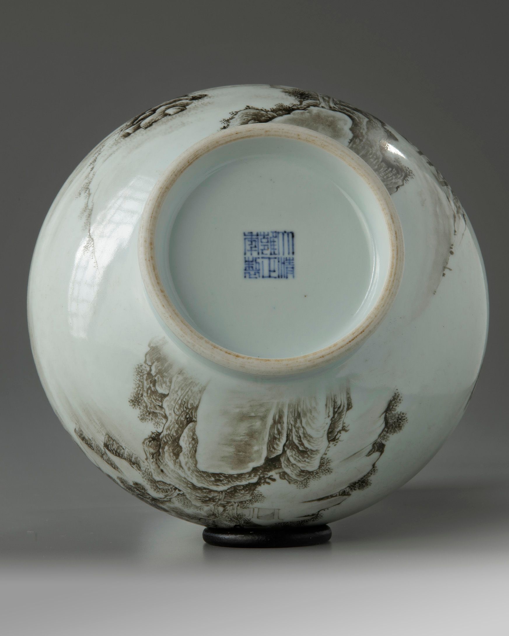 The exterior is decorated with a continuous scene of figures in a mountains river landscape. The base with an apocryphal Yongzheng mark.