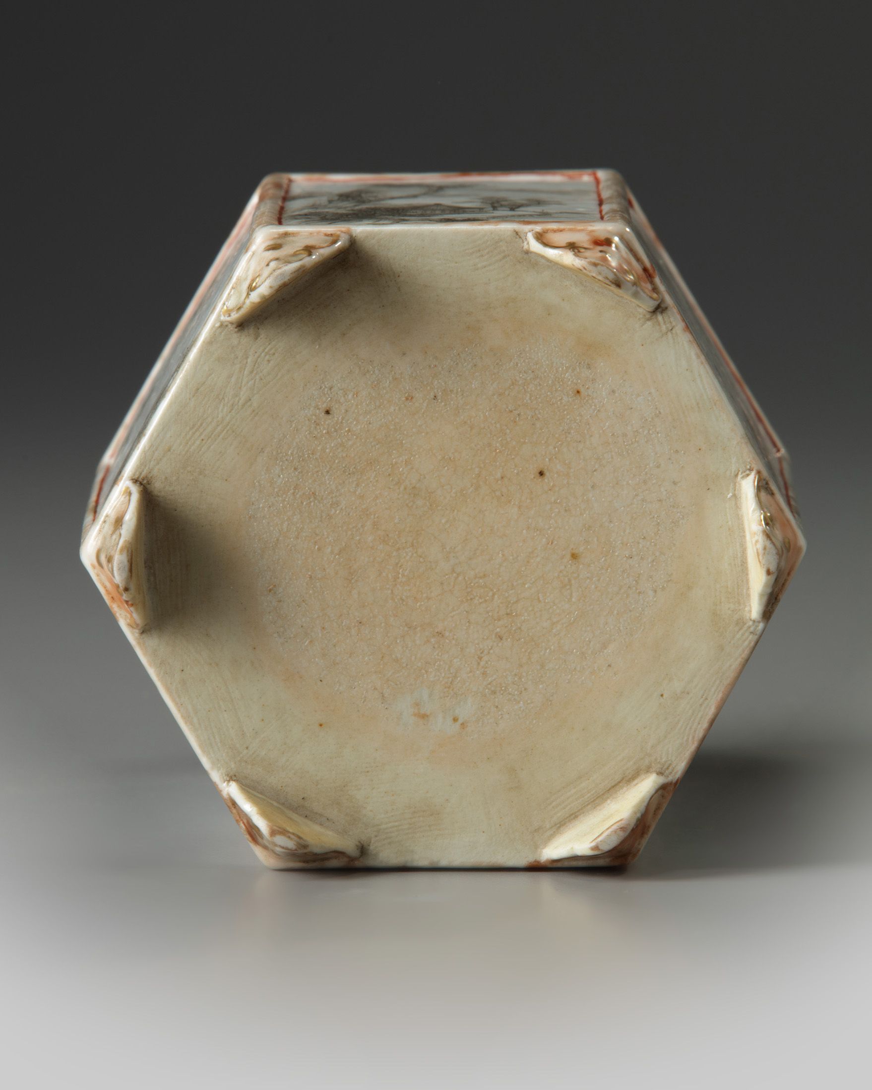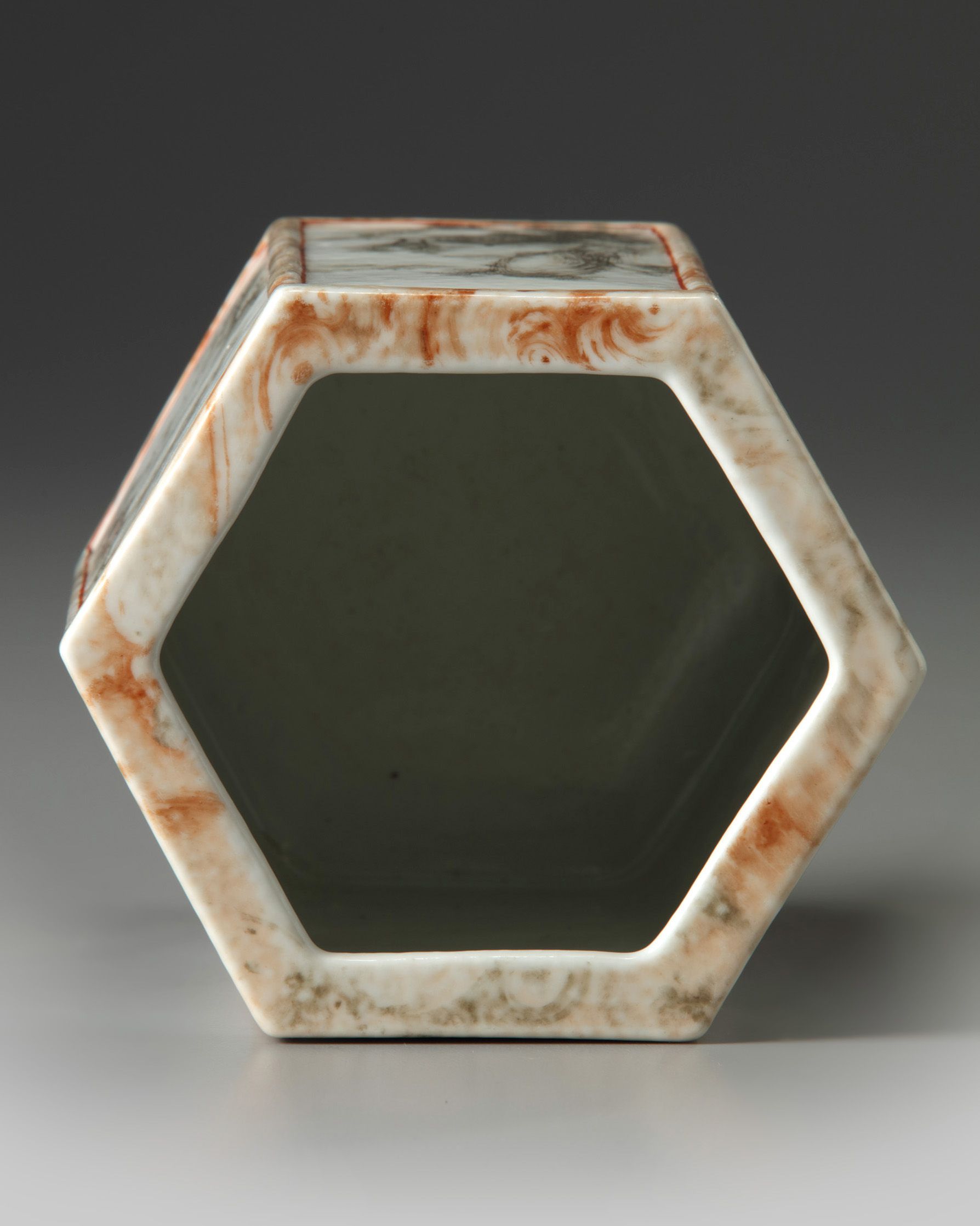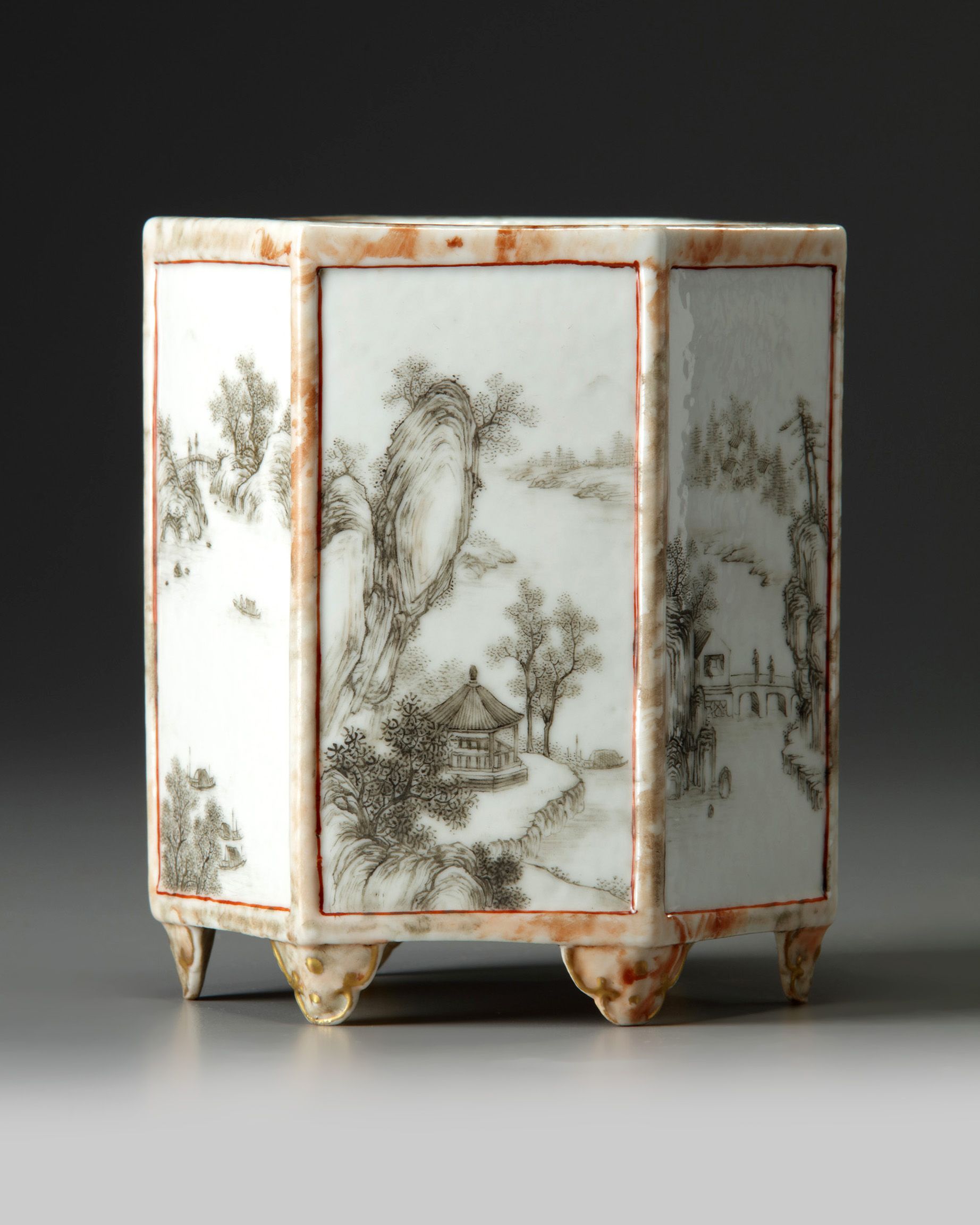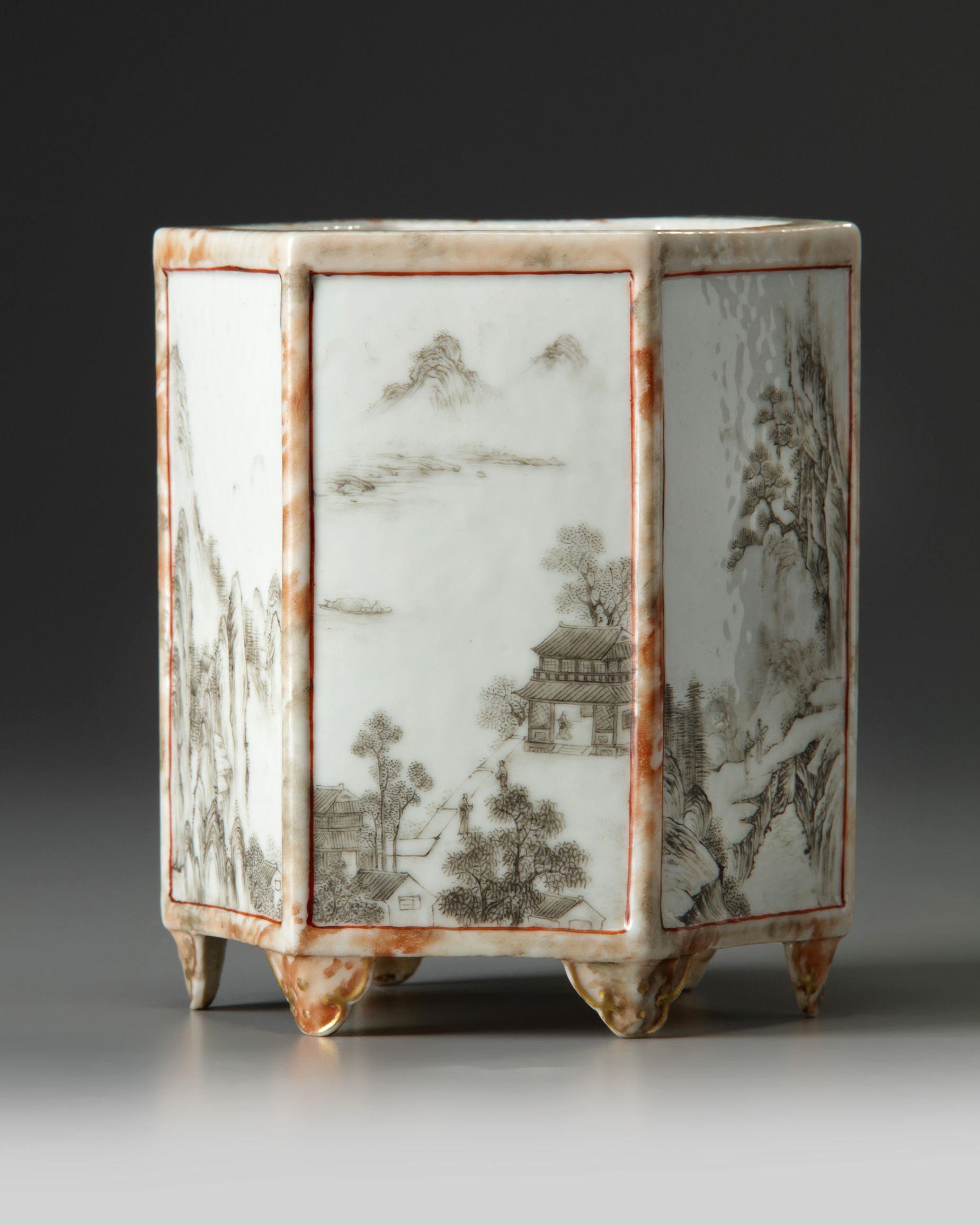 Each rectangular face of the burh pot is decorated with a different landscape scene, with mountains, rivers, and pavilions, some with figures, all surrounded by an imitation marble border executed in grey and sepia enamels. The brush pot stands on six moulded ruyi-head feet.