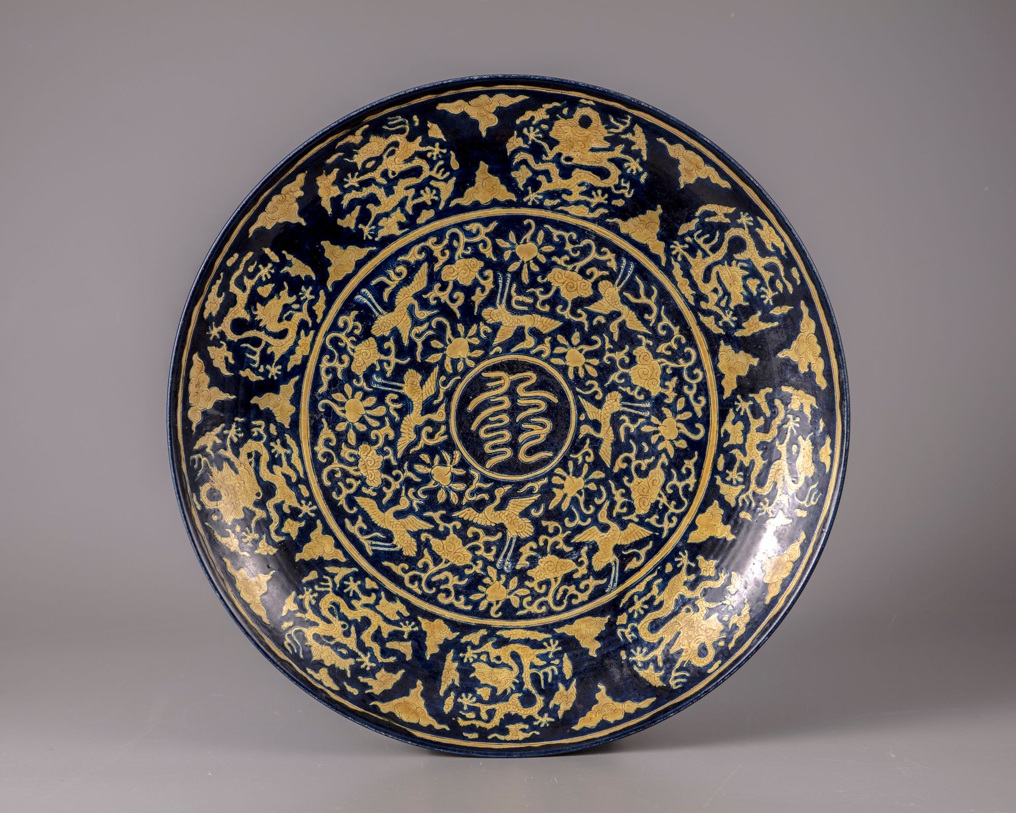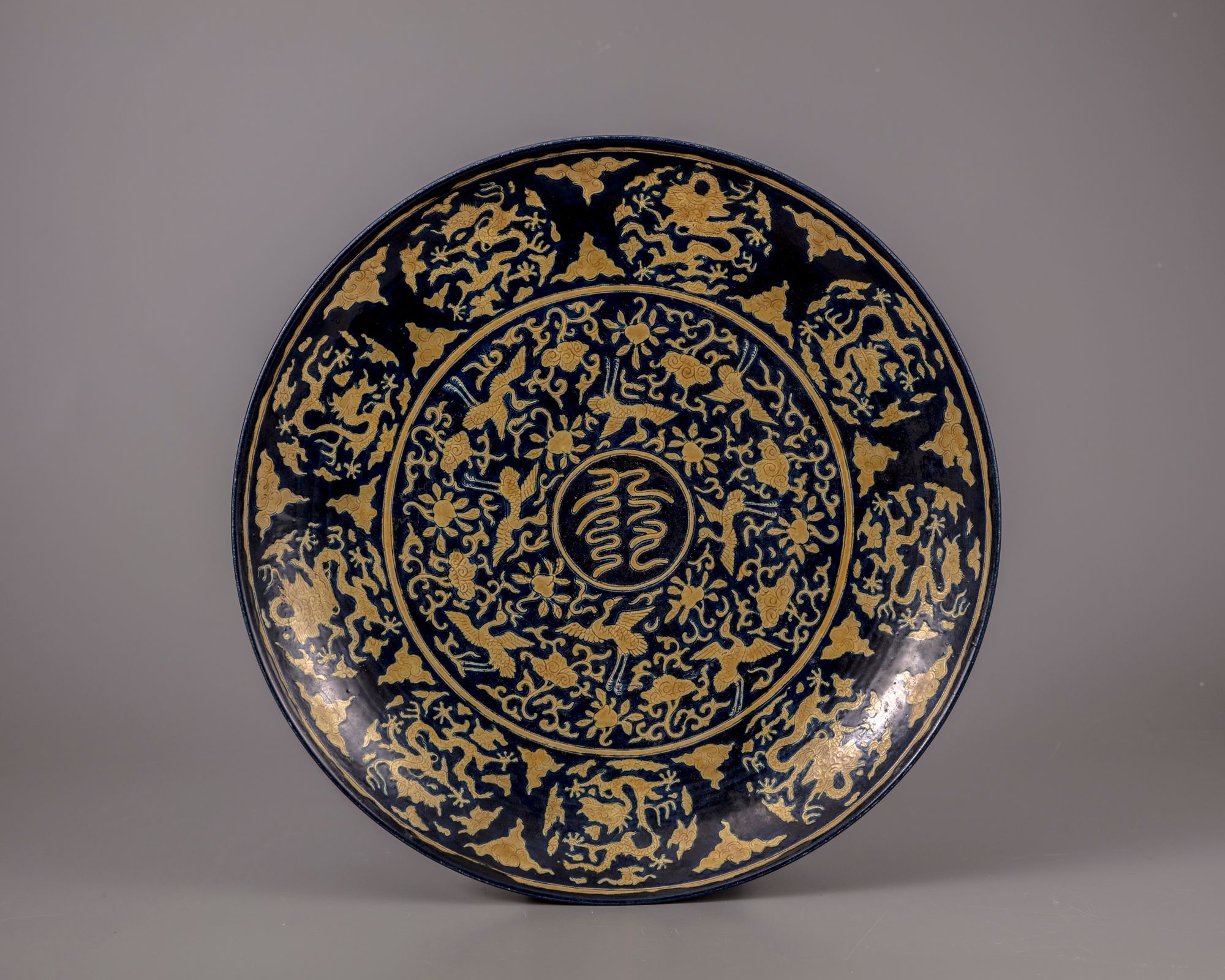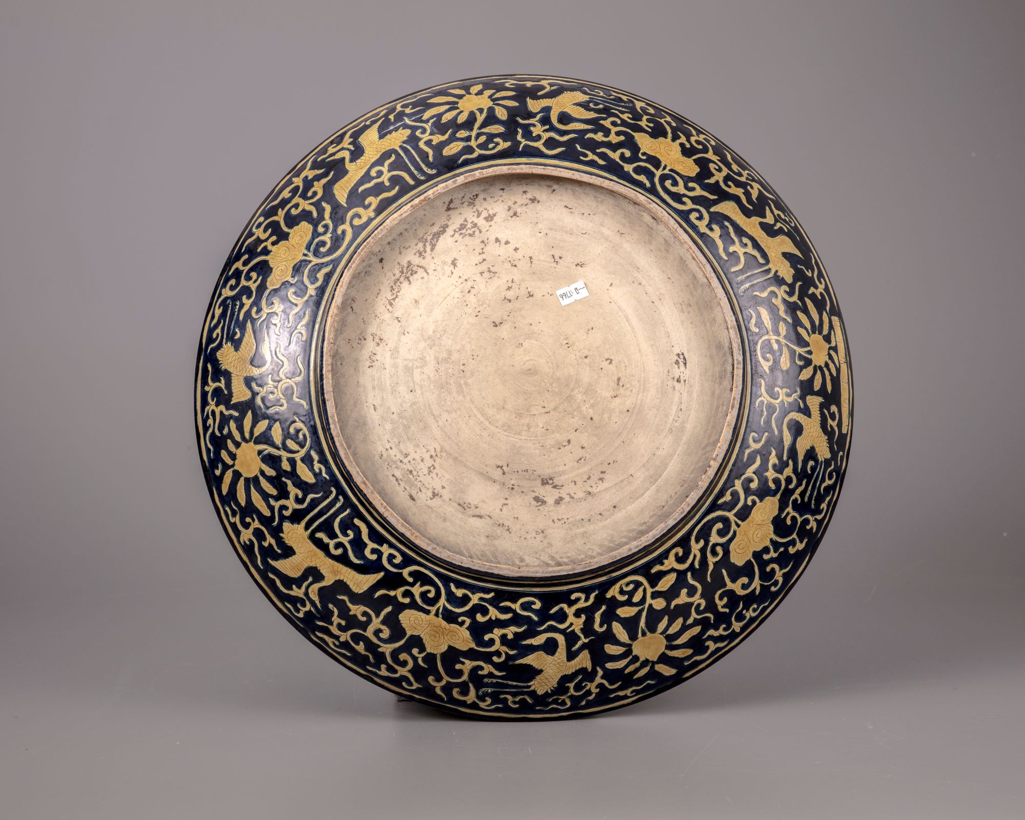 The interior is decorated and incised with a central stylised 'fa' (wealth) character surrounded by cranes, peaches and lingzhi. The cavetto is decorated with nine dragon roundels separated by cloud scrolls. The reverse is decorated with crane, peaches, and flower scrolls.
