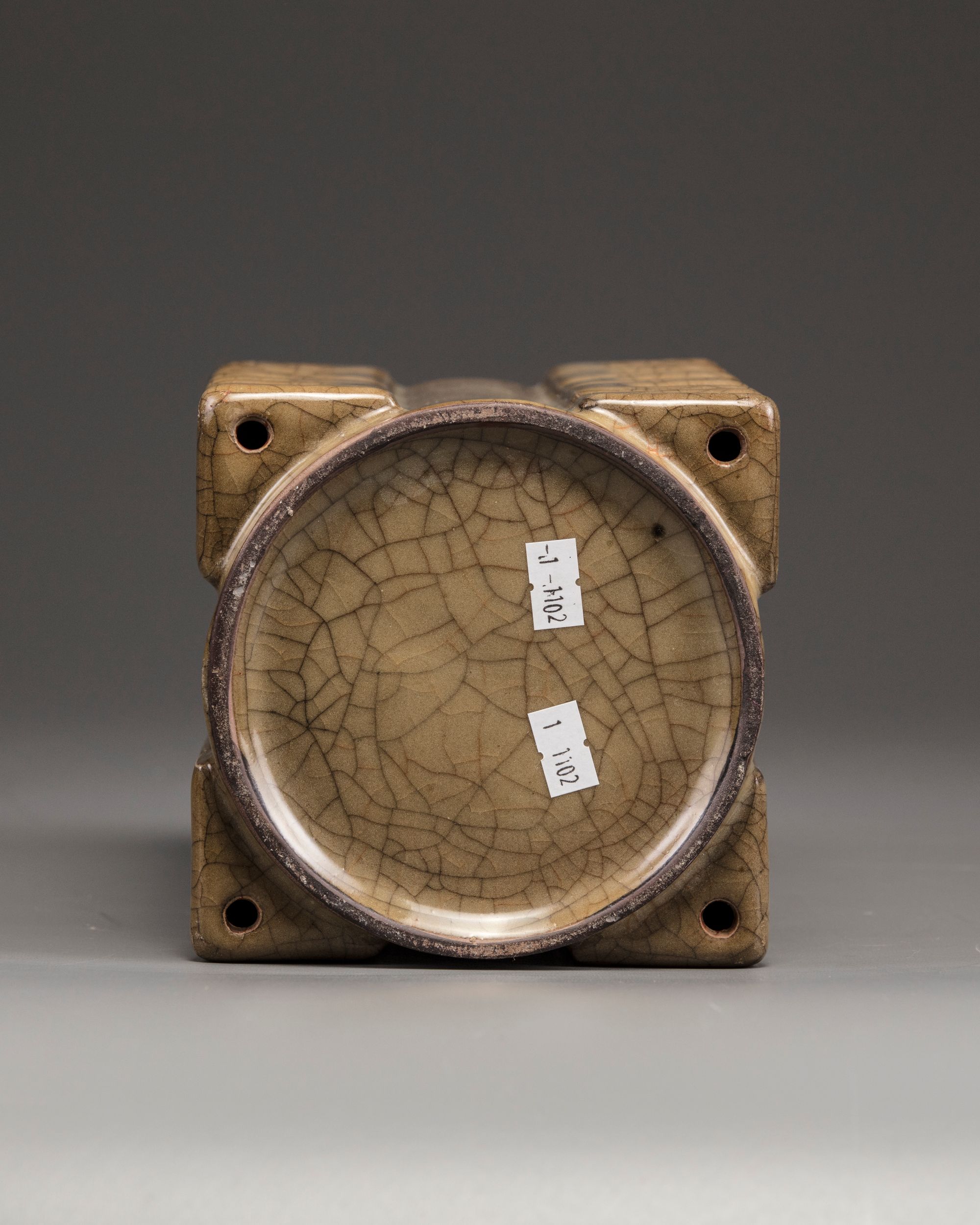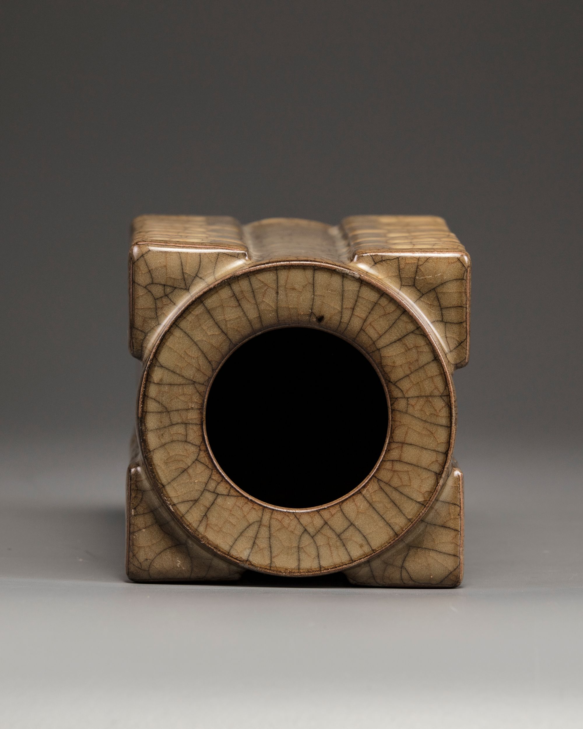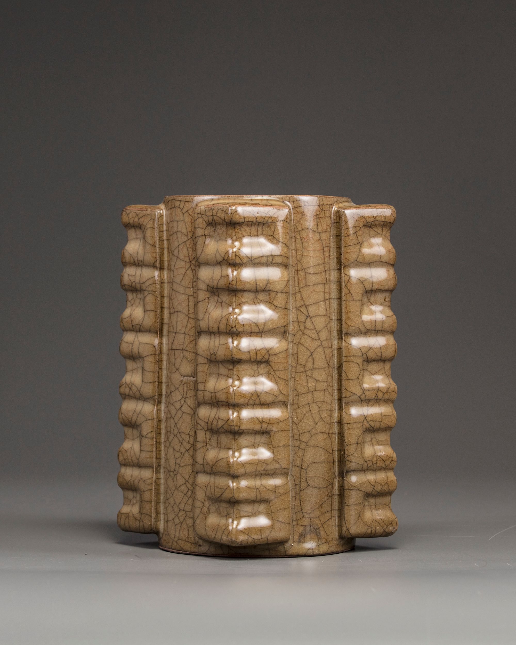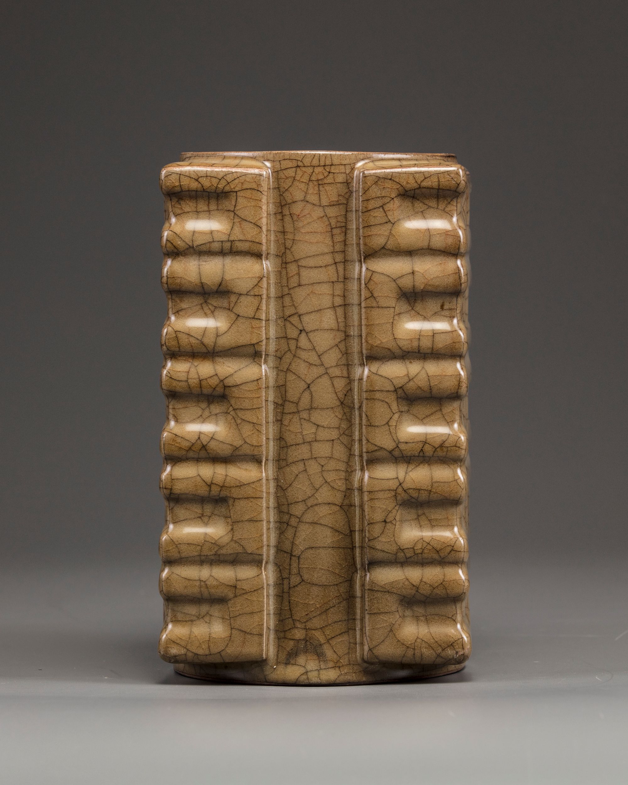 The sturdily potted vase is of square section with four rectangular facets, each moulded with alternating short horizontal ribs along the outer edges, leaving the central vertical rounded panel undecorated. It is covered with celadon glaze with an network of crackles