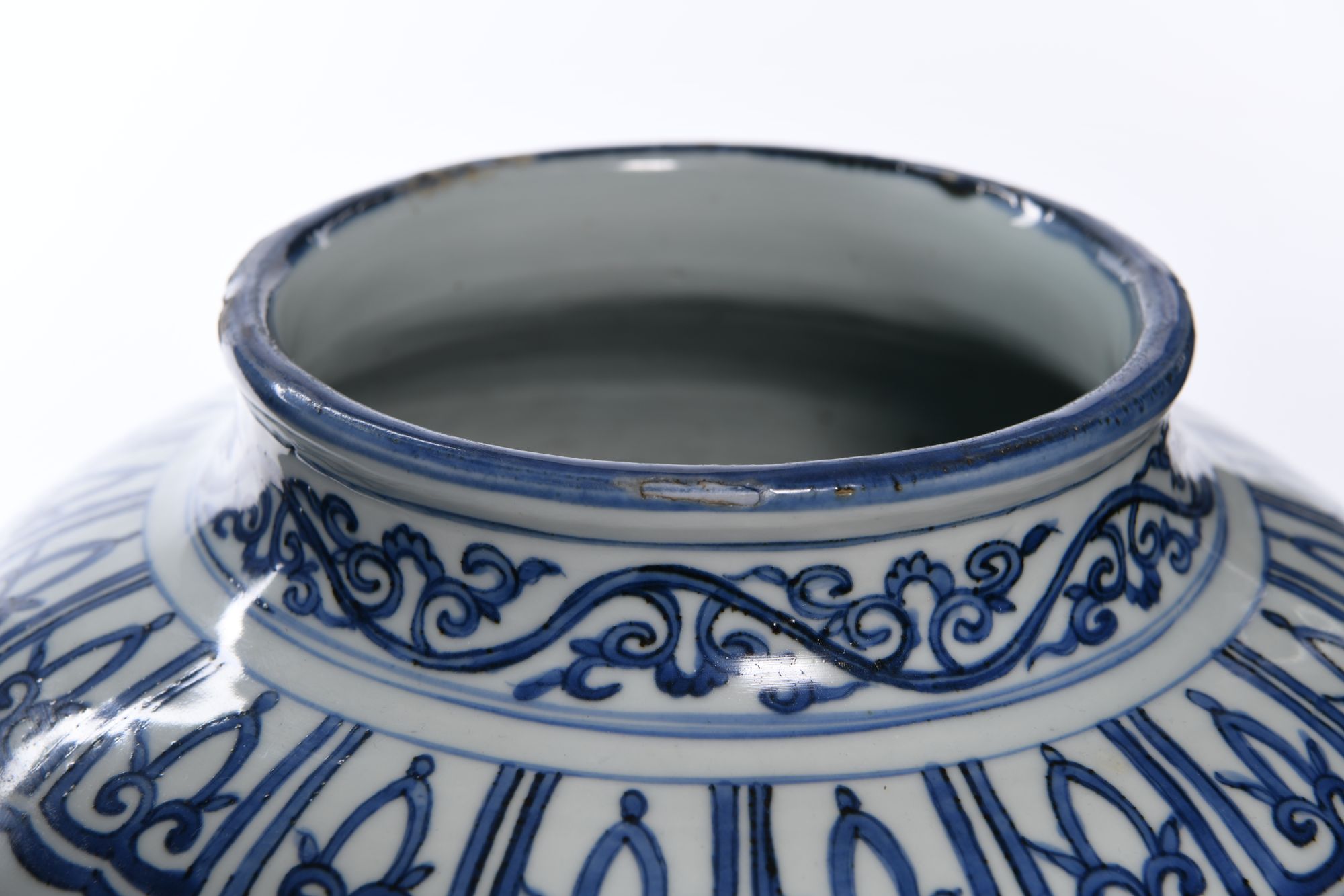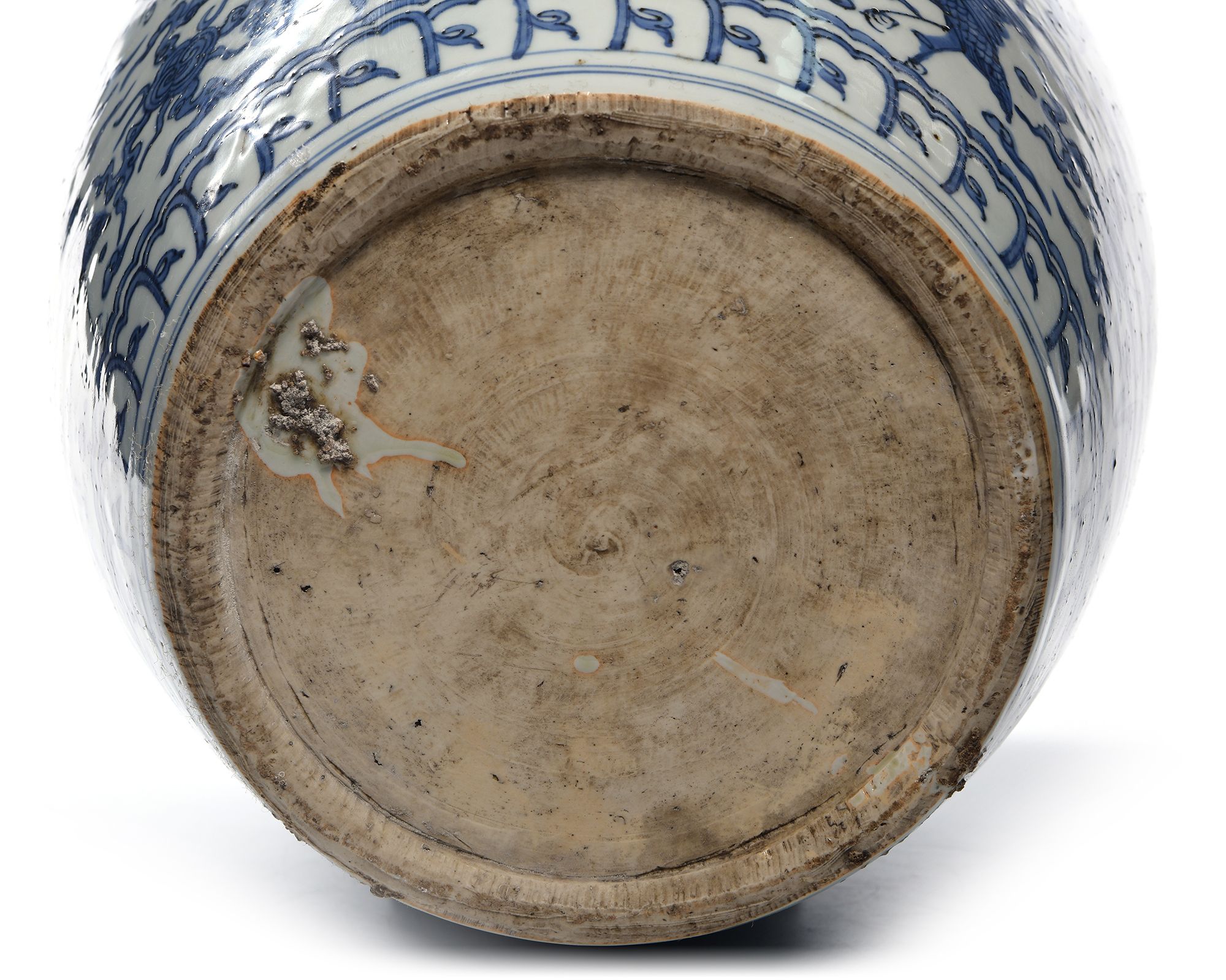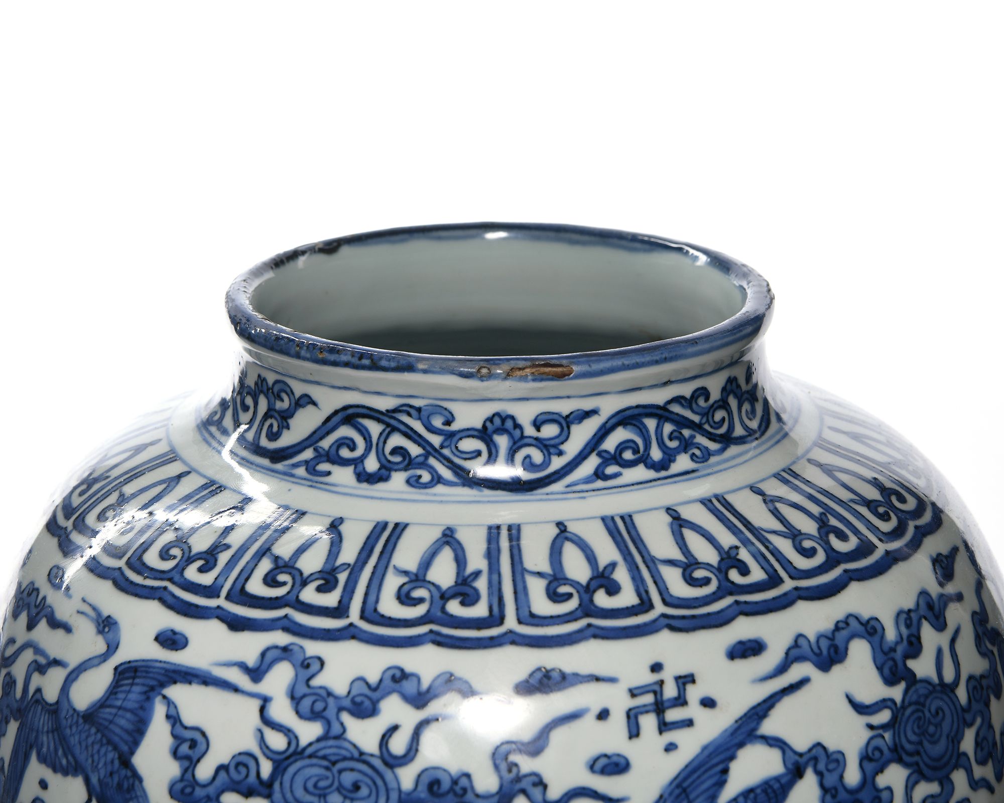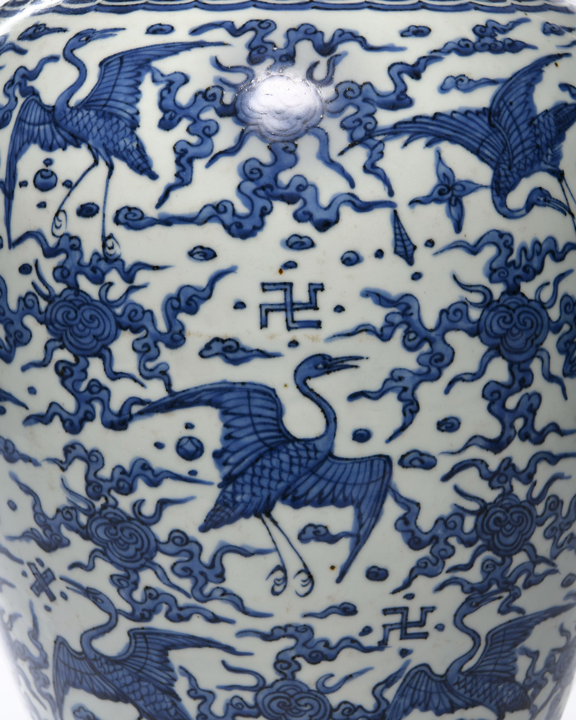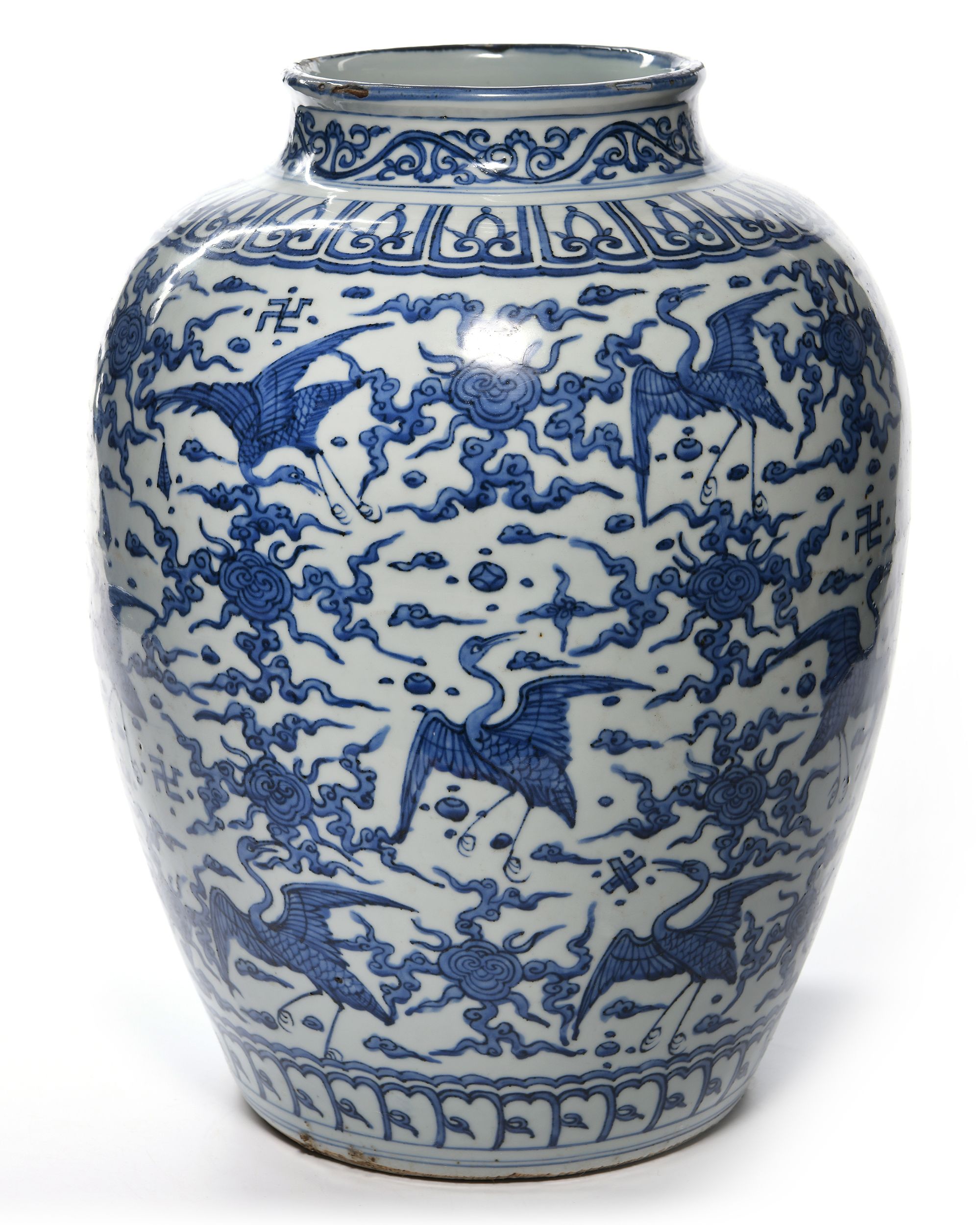 Of ovoid form, finely painted with an overall design of cranes soaring with outstretched wings through wispy clouds, the short wide neck encircled by a band of classic scroll between two borders of vertical stripes, the foot painted with an additional border of classic scroll. 55 cm. height and 25 cm. diam.