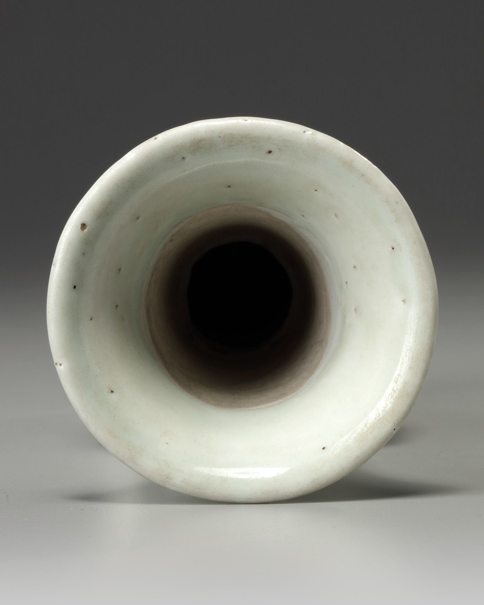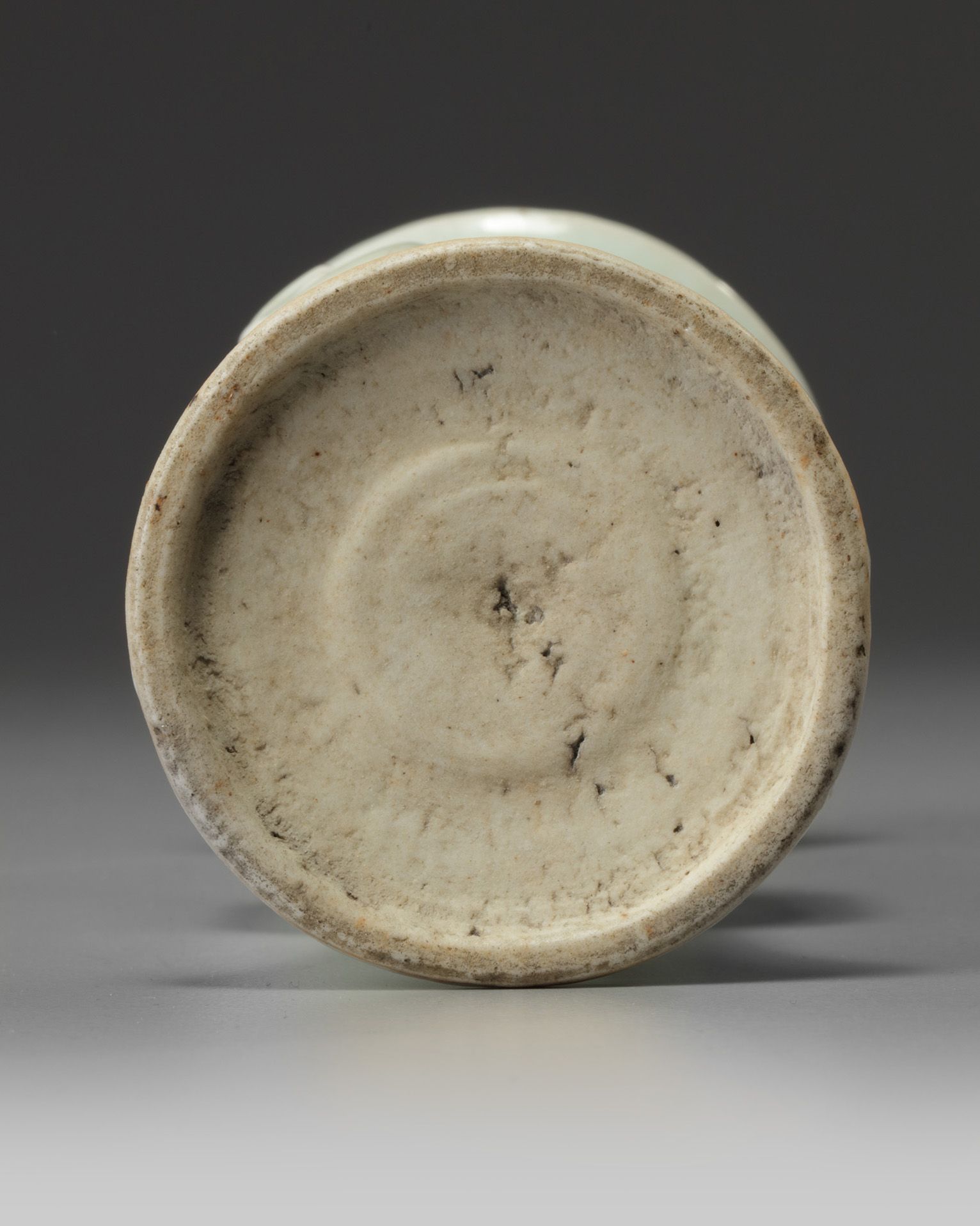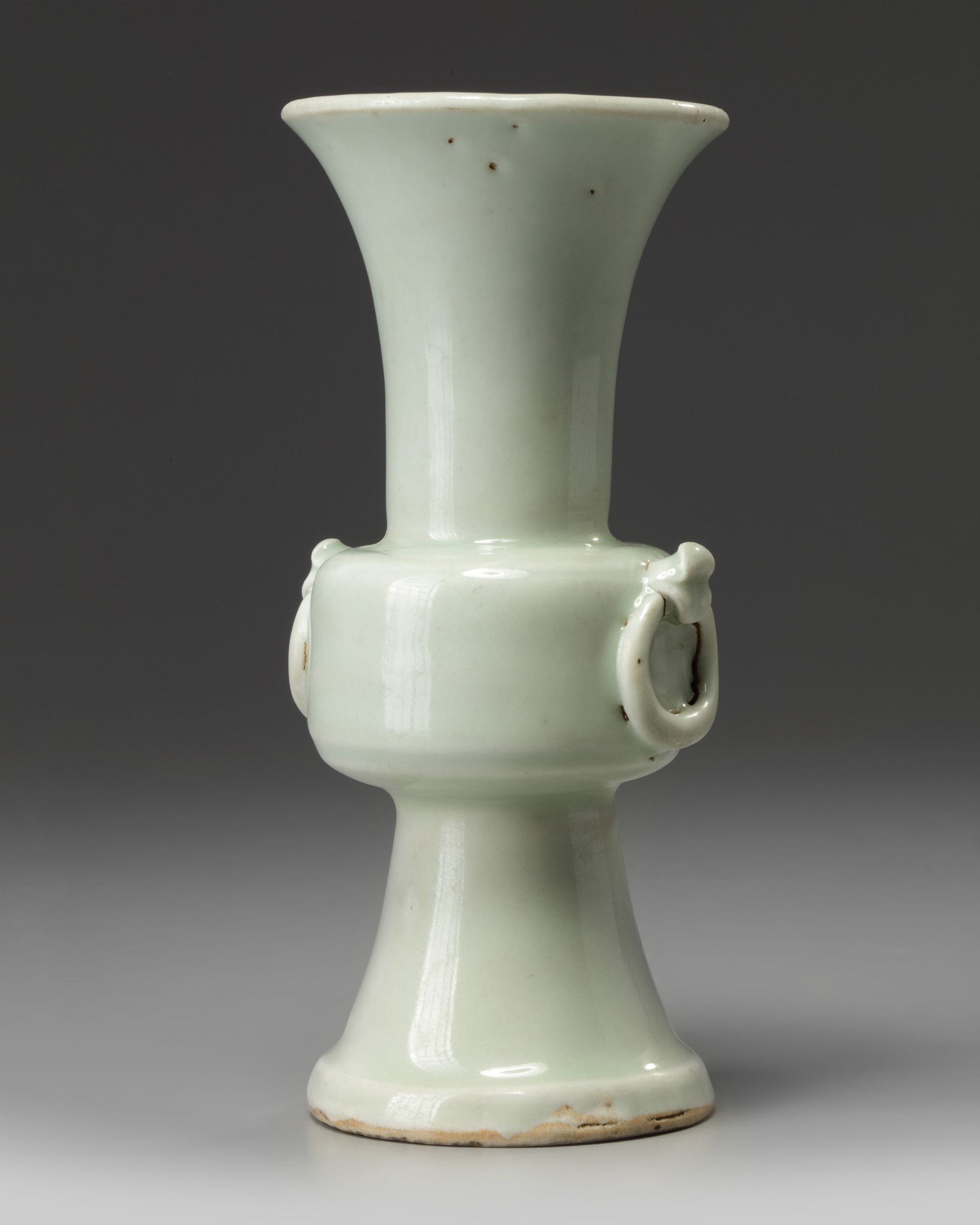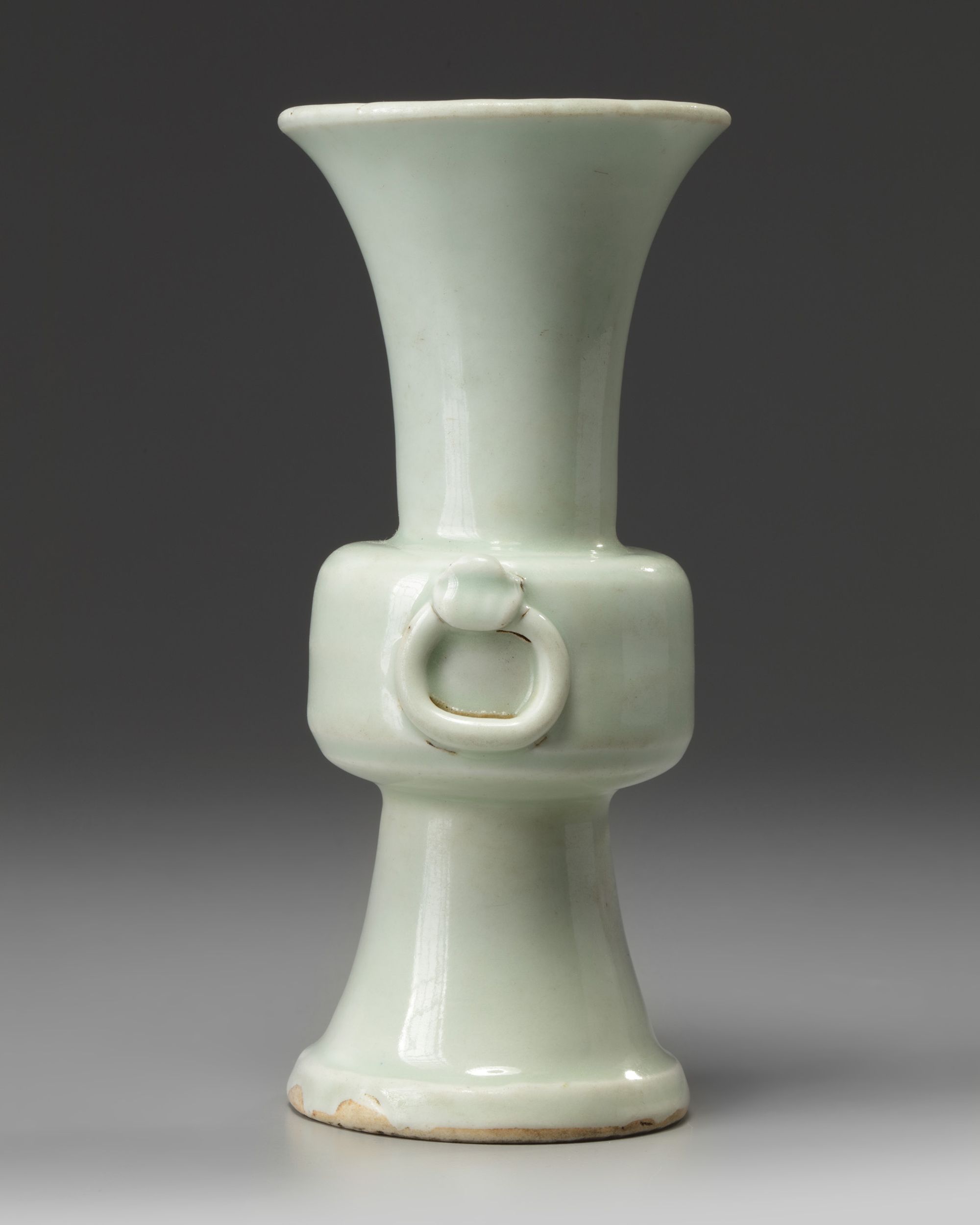 The vase is decorated to the cylindrical central section with two fixed-ring handles. It is covered to the exterior and the interior of the rim with a pale bluish-celadon glaze.