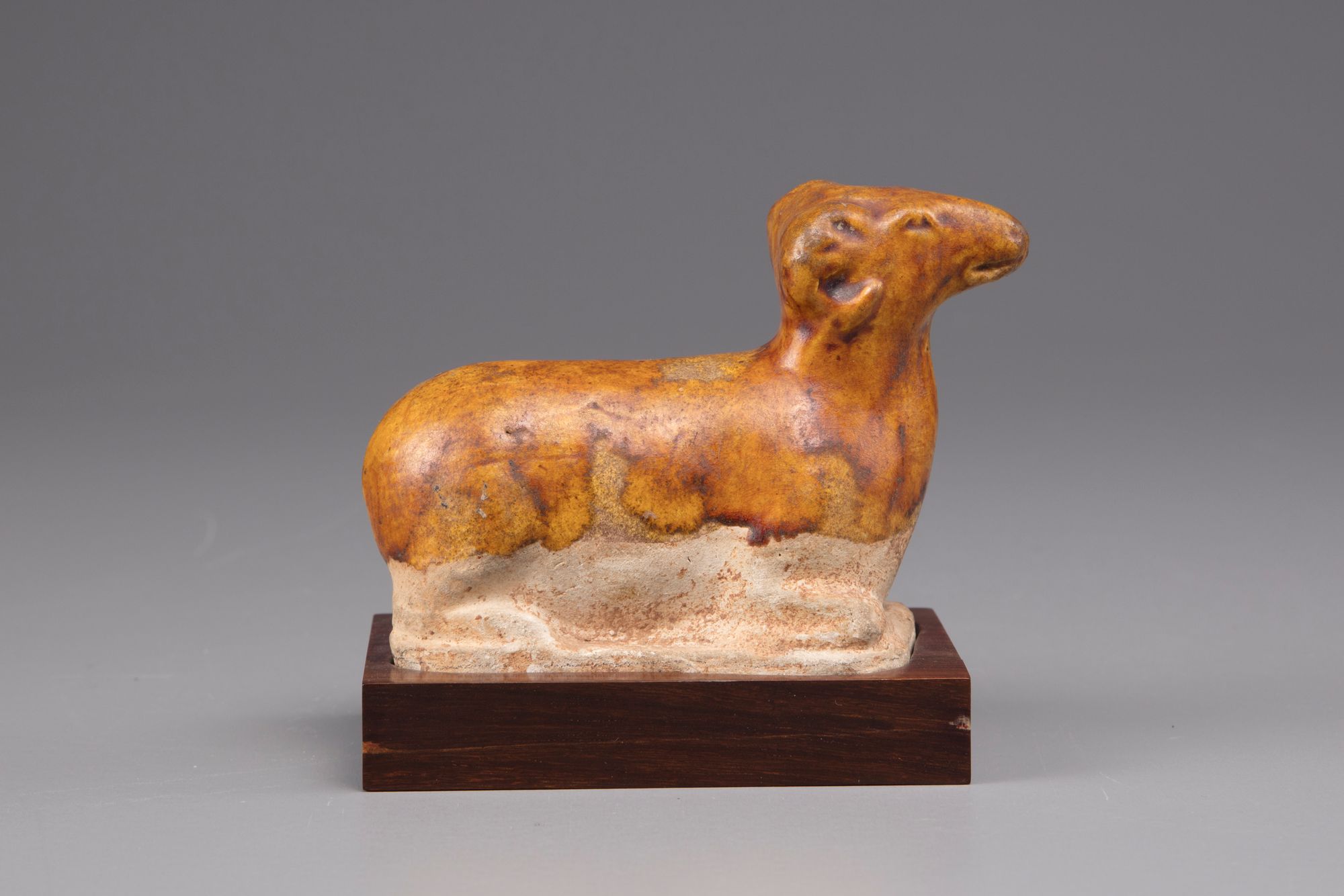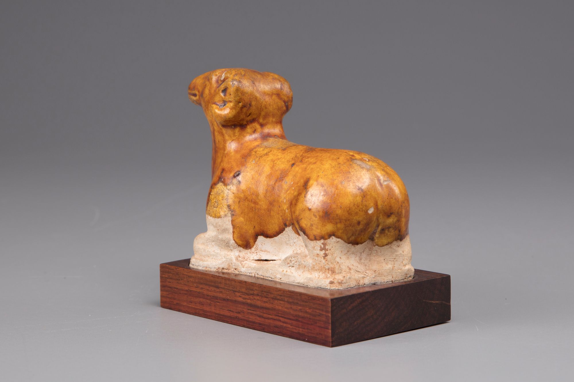 Moulded earthenware figure of a ram, decorated with a brown glaze falling short above the feet.