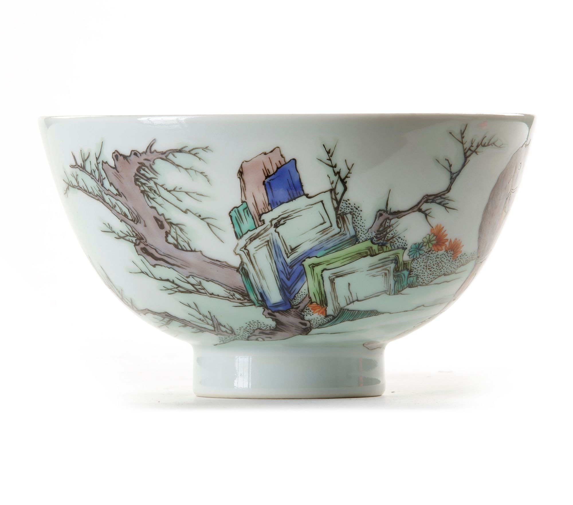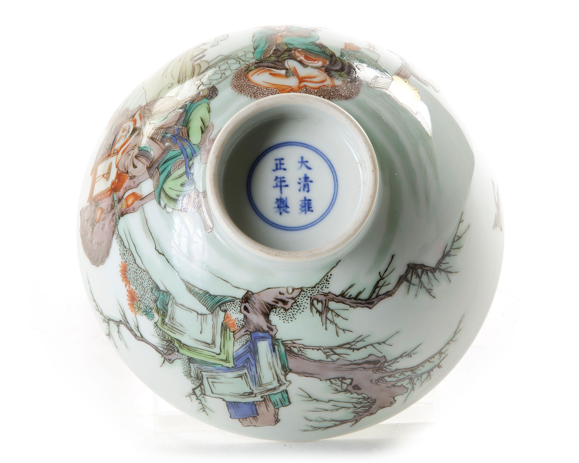 The bowl is decorated to the exterior with a rider and horse before a tent accompanied by a lady holding a pipa. The base with an apocryphal Yongzheng mark.