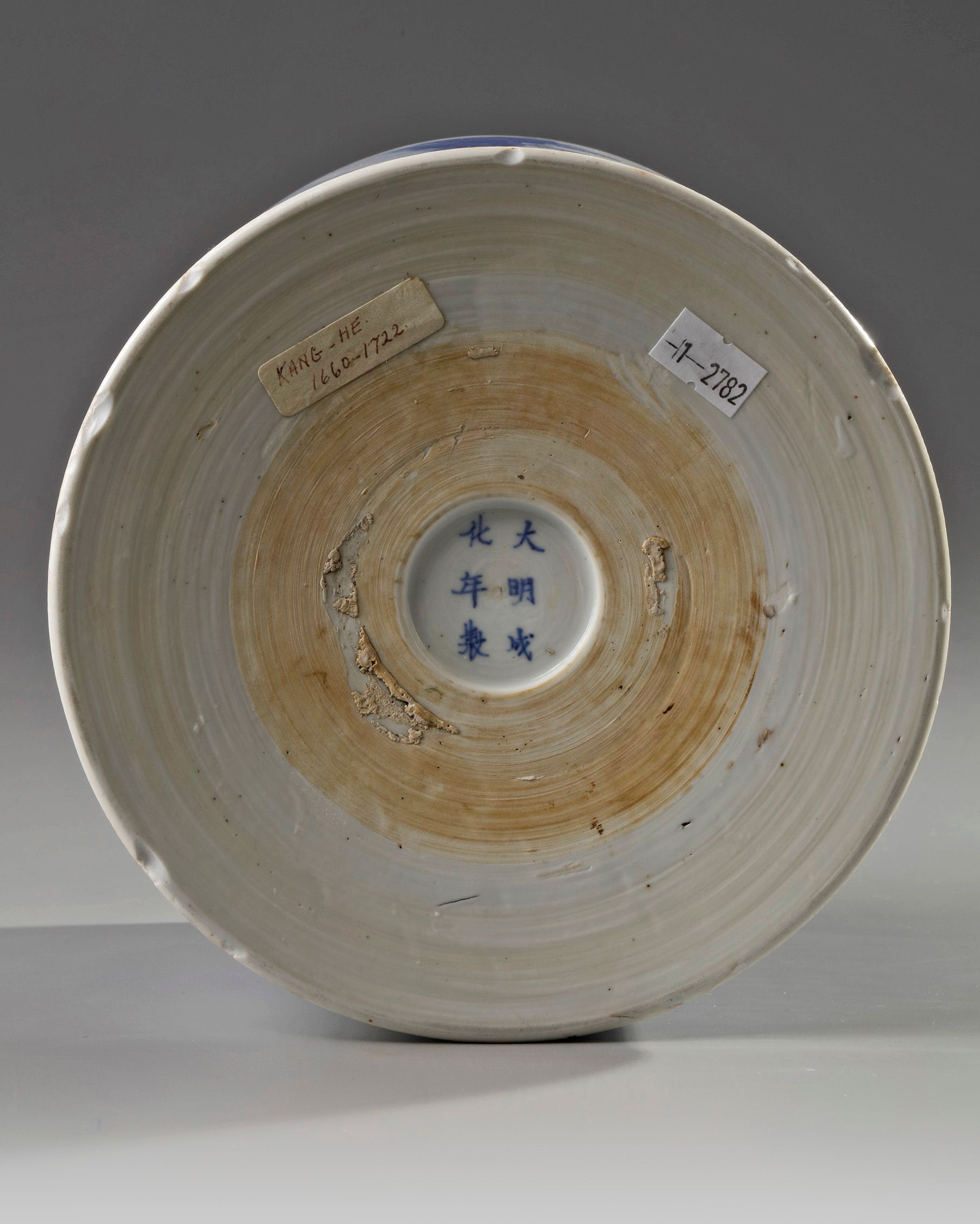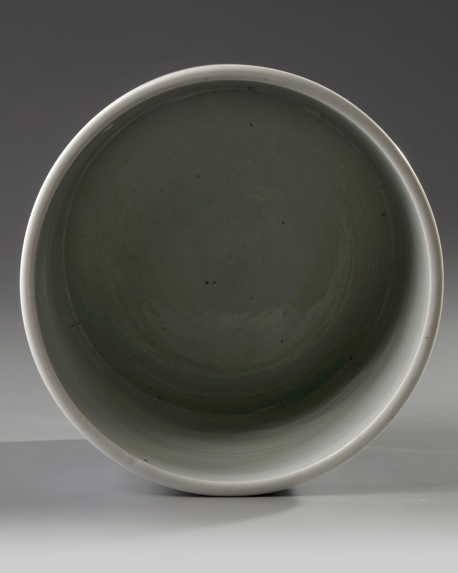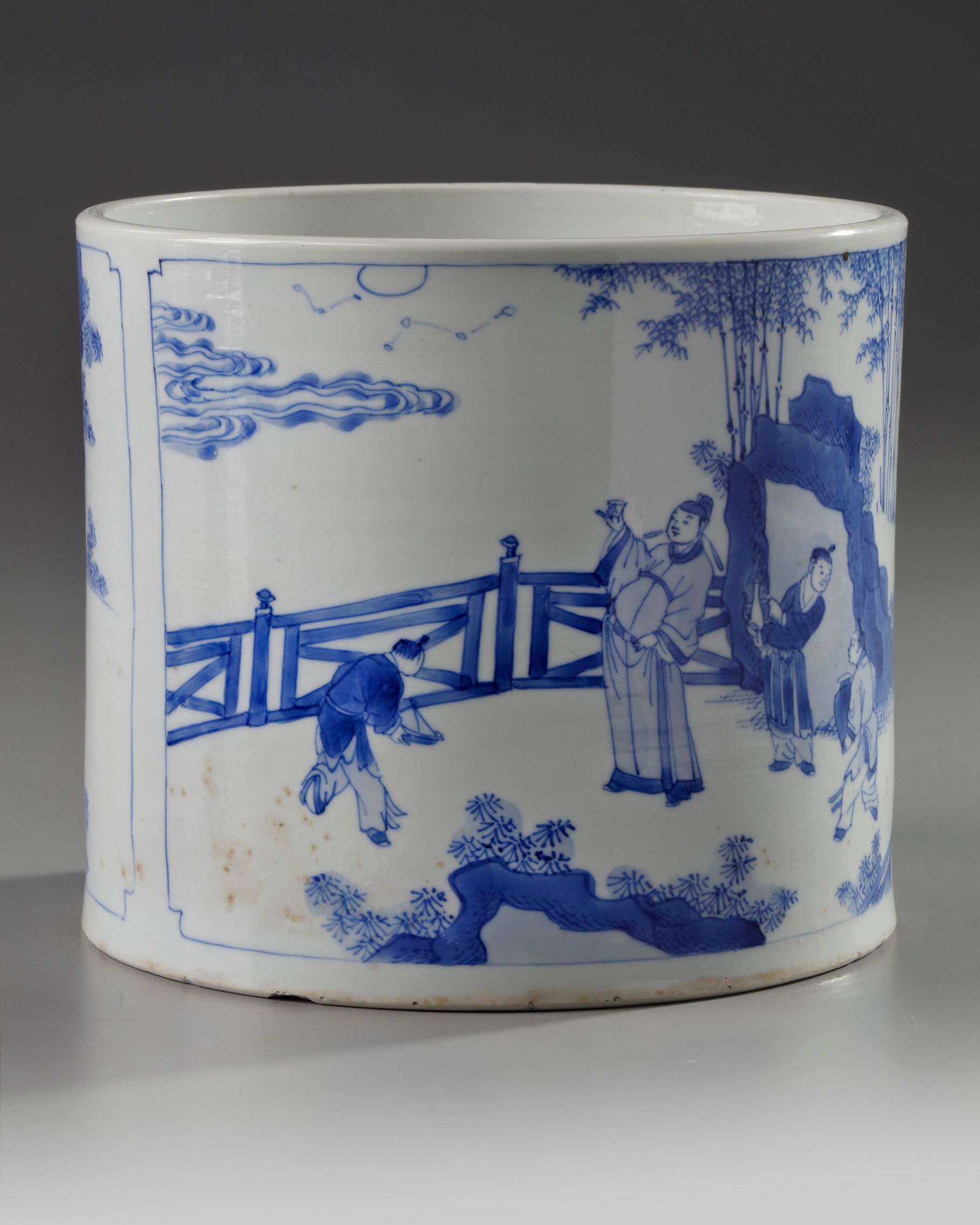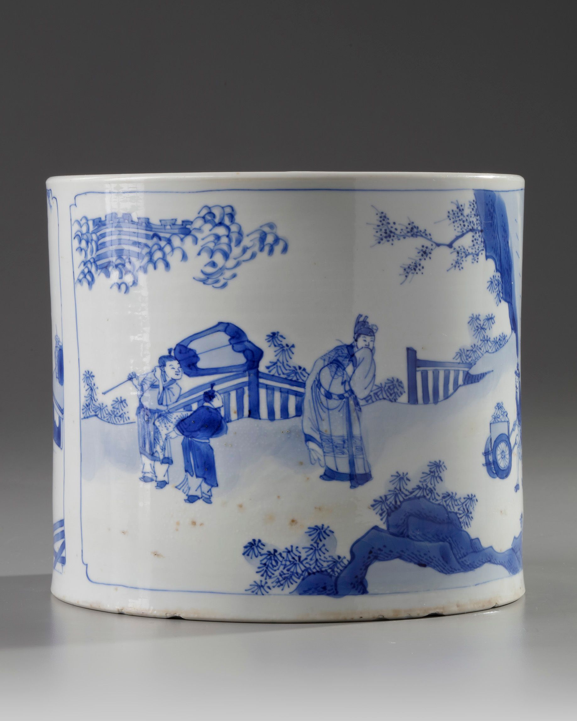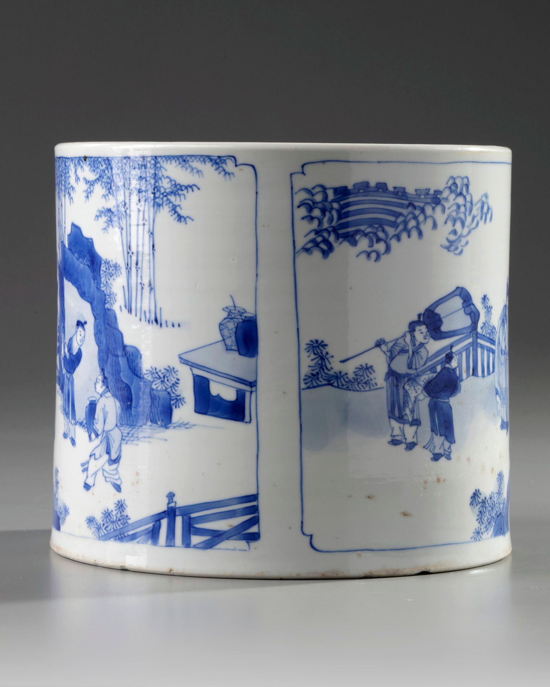 The cylindrical brush pot is decorated to the exterior with two panels, one depicting a scholar holding a wine up with his attendants in a fenced garden under the moon, and the other with a scholar and his two attendants before a city wall with a man rolling a wheel barrow. The base with an apocryphal Chenghua mark in a recessed circle.