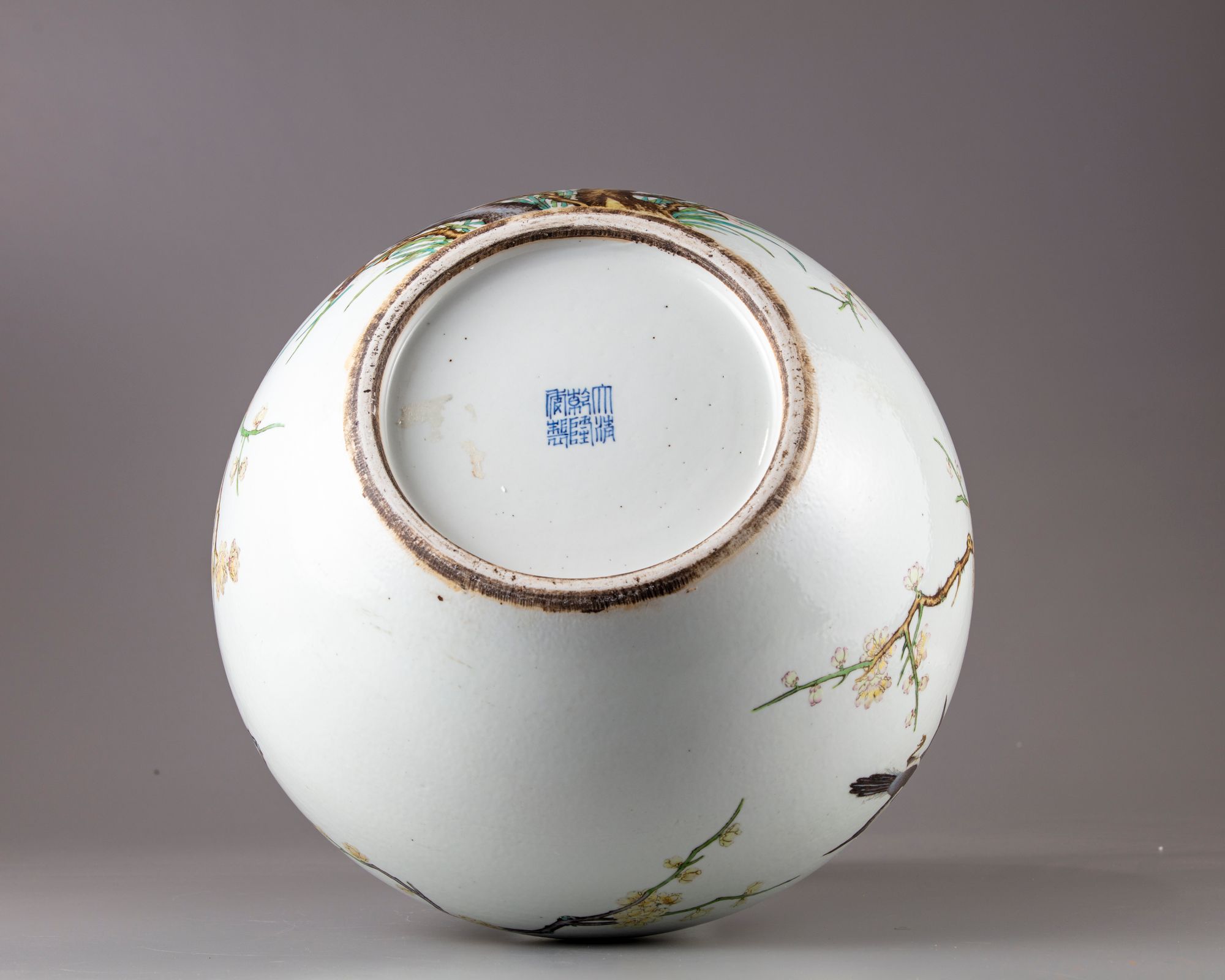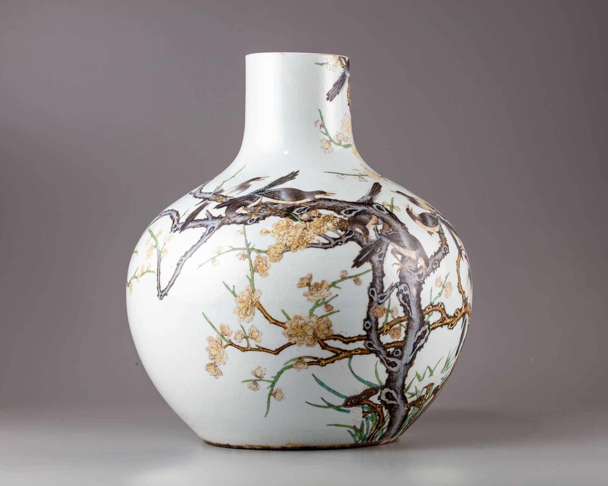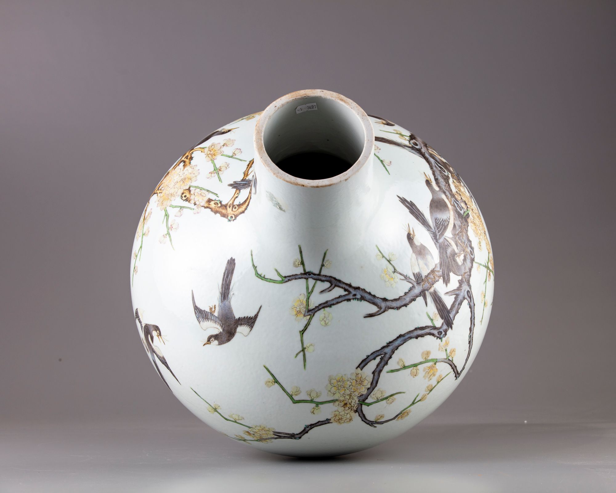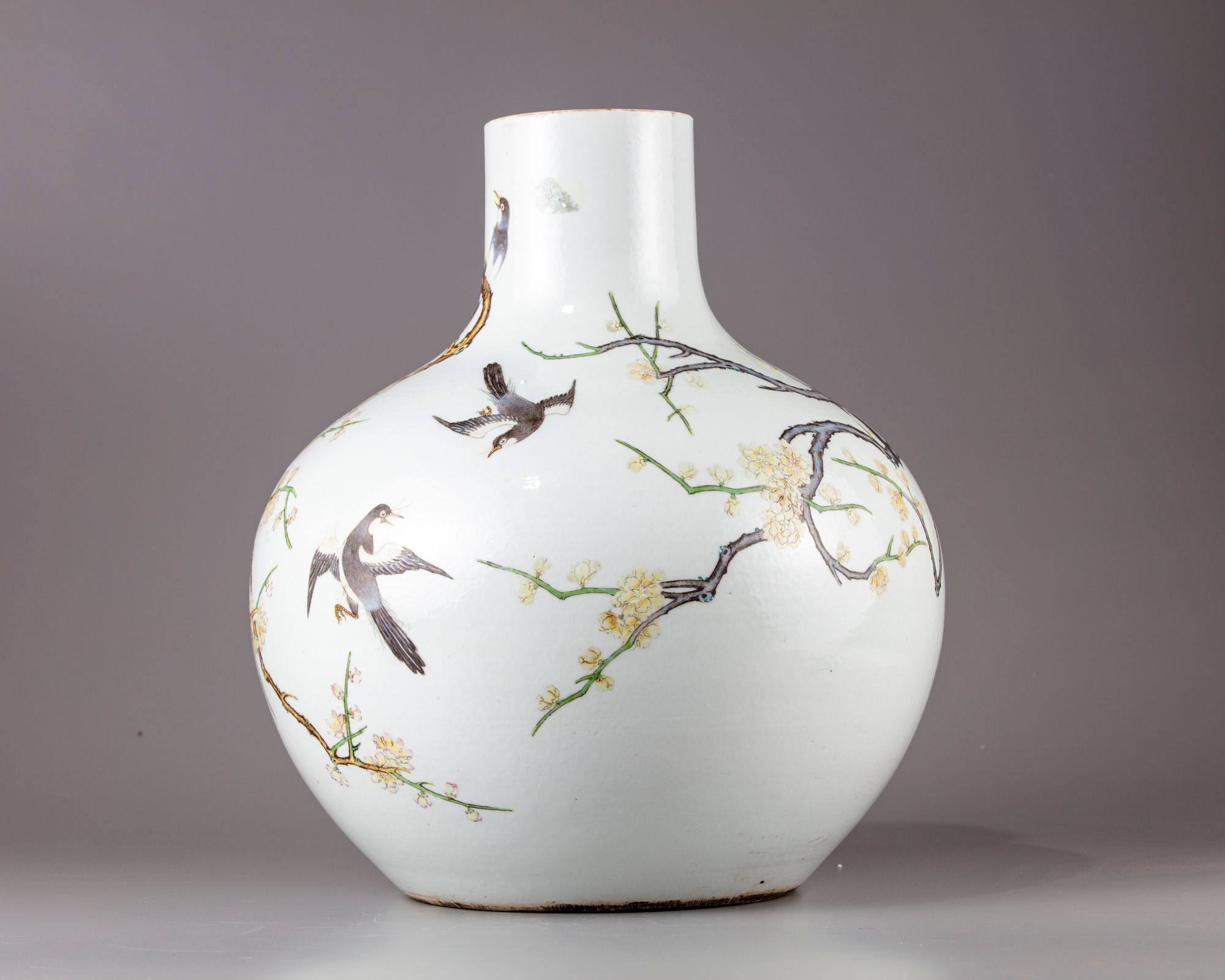 The bottle vase is decorated with birds perched cherry flowering branches ,The reverse with two birds in flight .