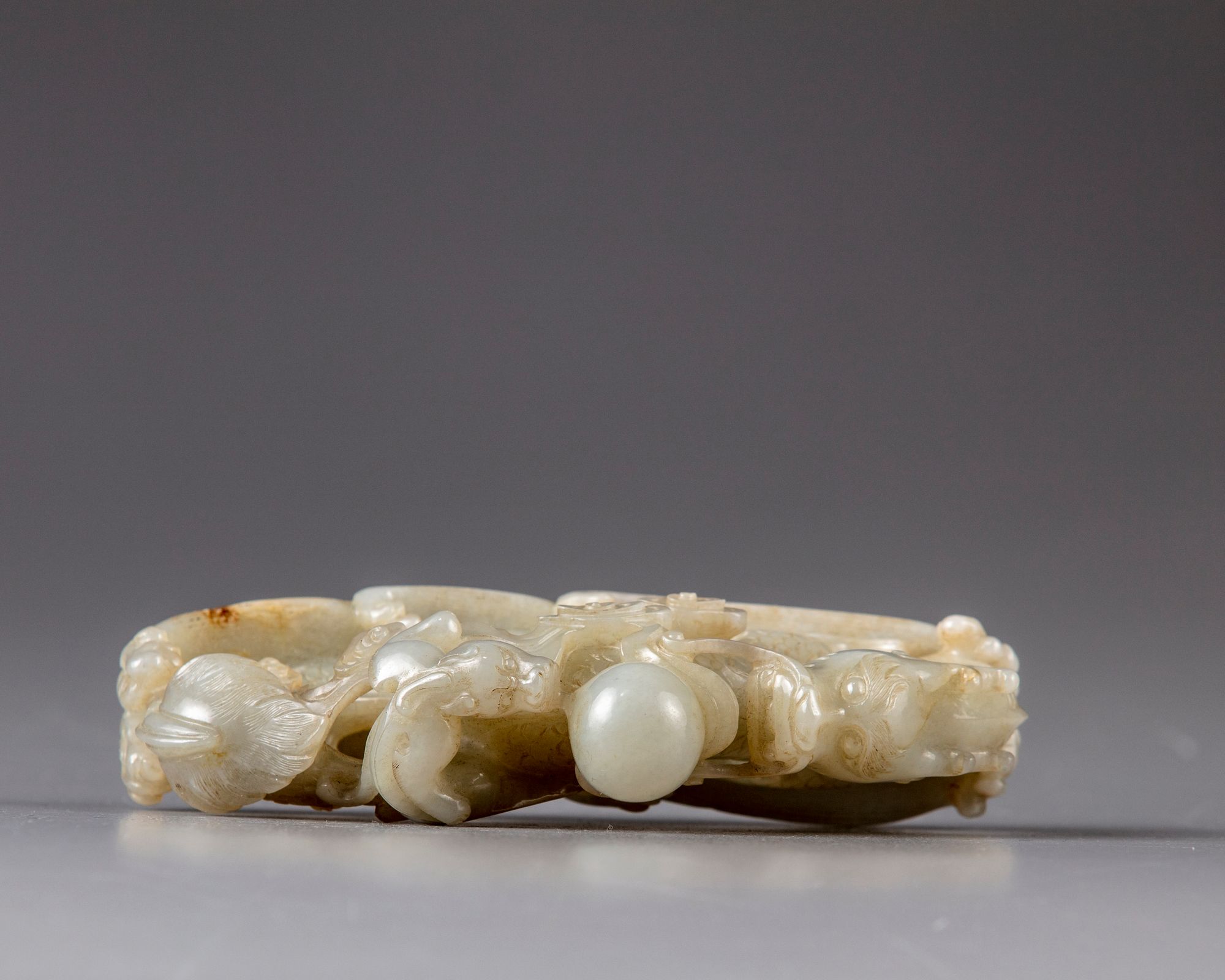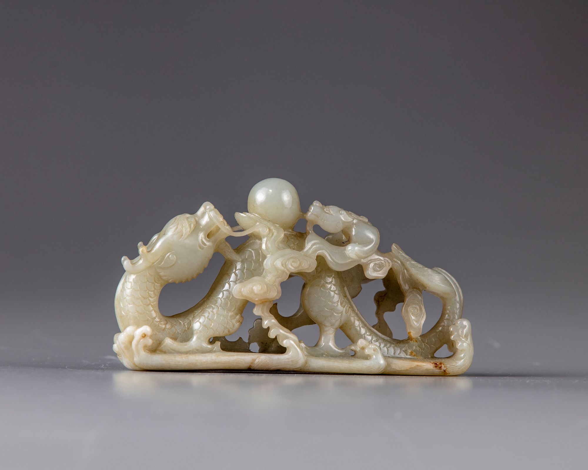 The dragon is carved standing on its four feet, its head turned backwards toward a flaming pearl on its back with a chillong , All on a base.