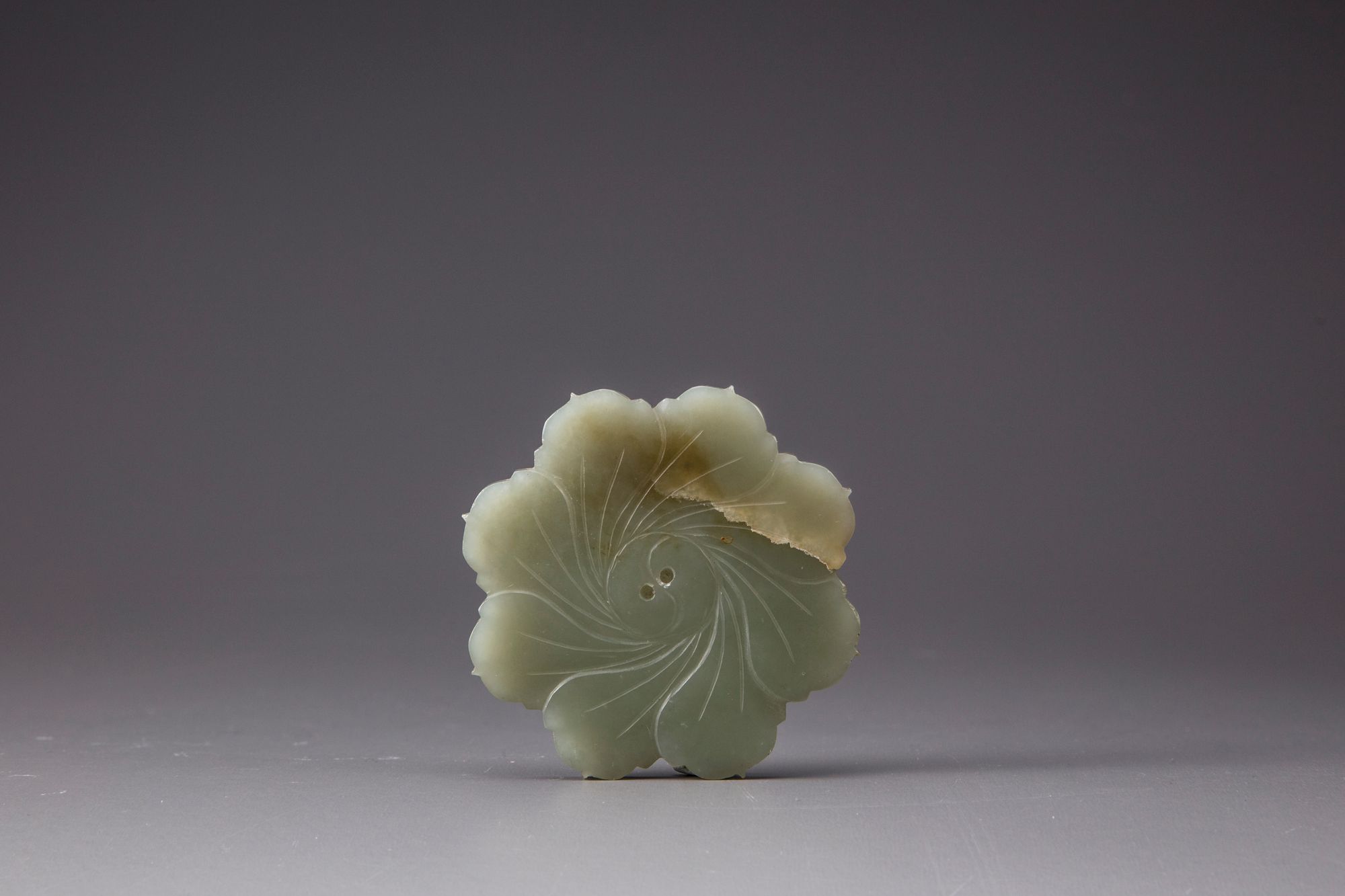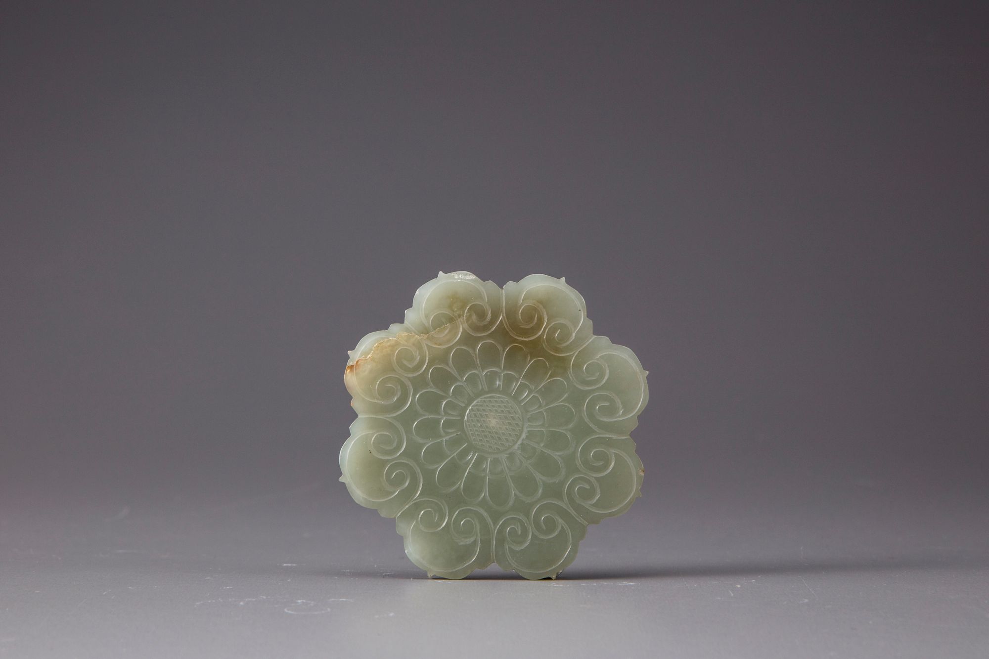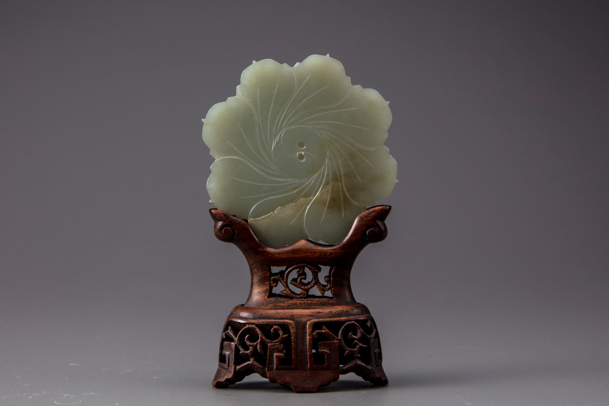 The plaque is carved to one side with a central chrysanthemum head surrounded by ruyi-head shaped panels. The reverse is carved as a further flower with petals spiralling from a central yin-yang. The reverse with an aperture for attachment. The stone is of an even tone with russet veins. With a wood stand.