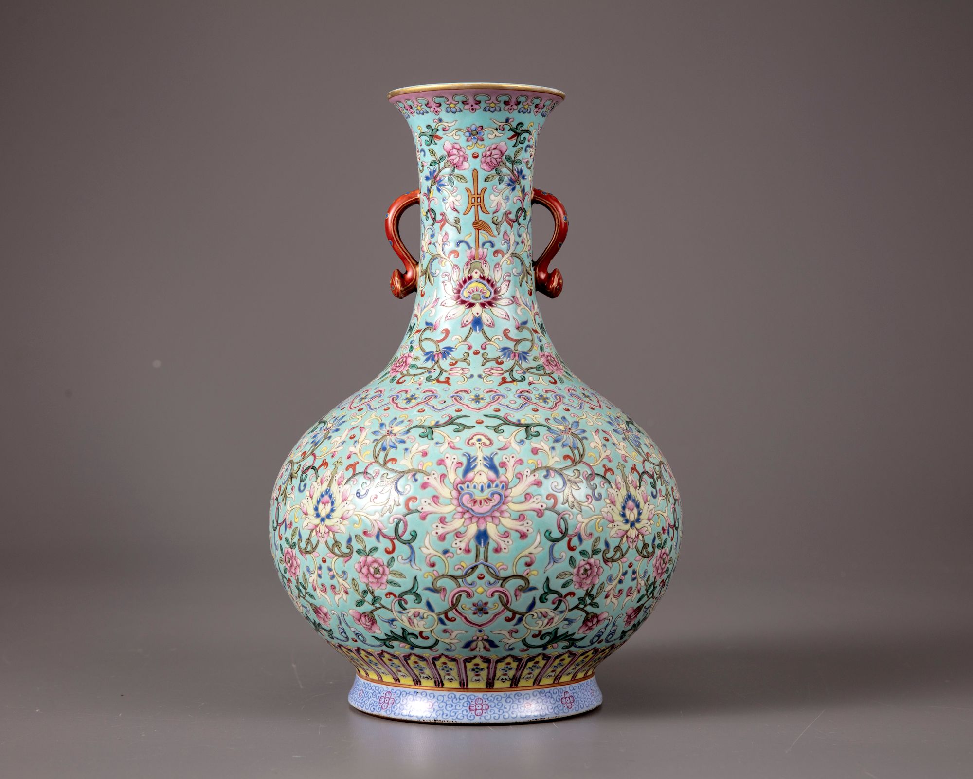 The vase is decorated with two openwork Ruyi shaped handles, with lotus scrolls and chrysanthemums. The base with a petal lappet border.