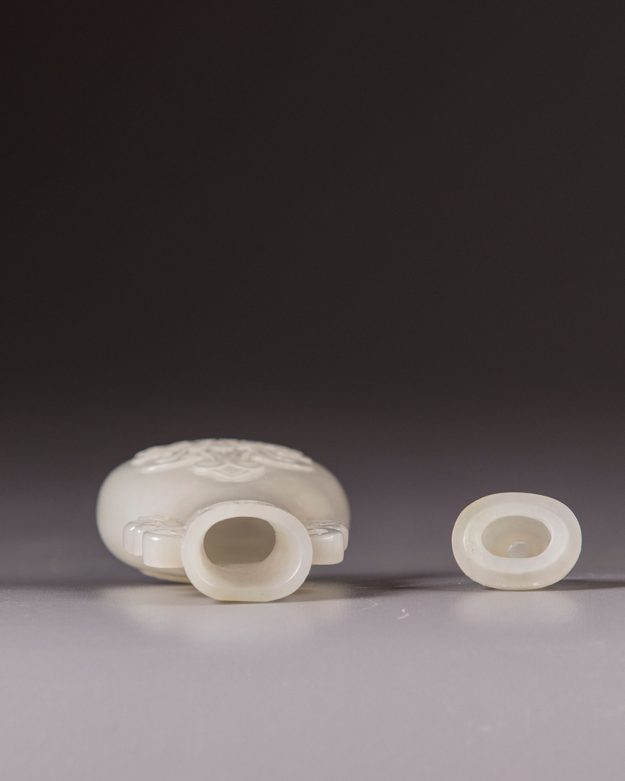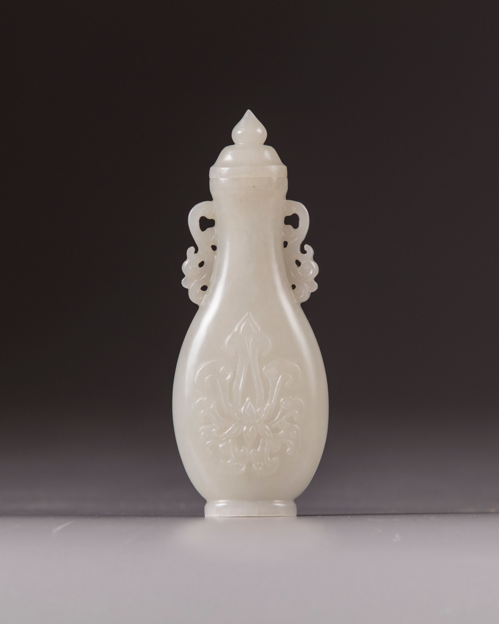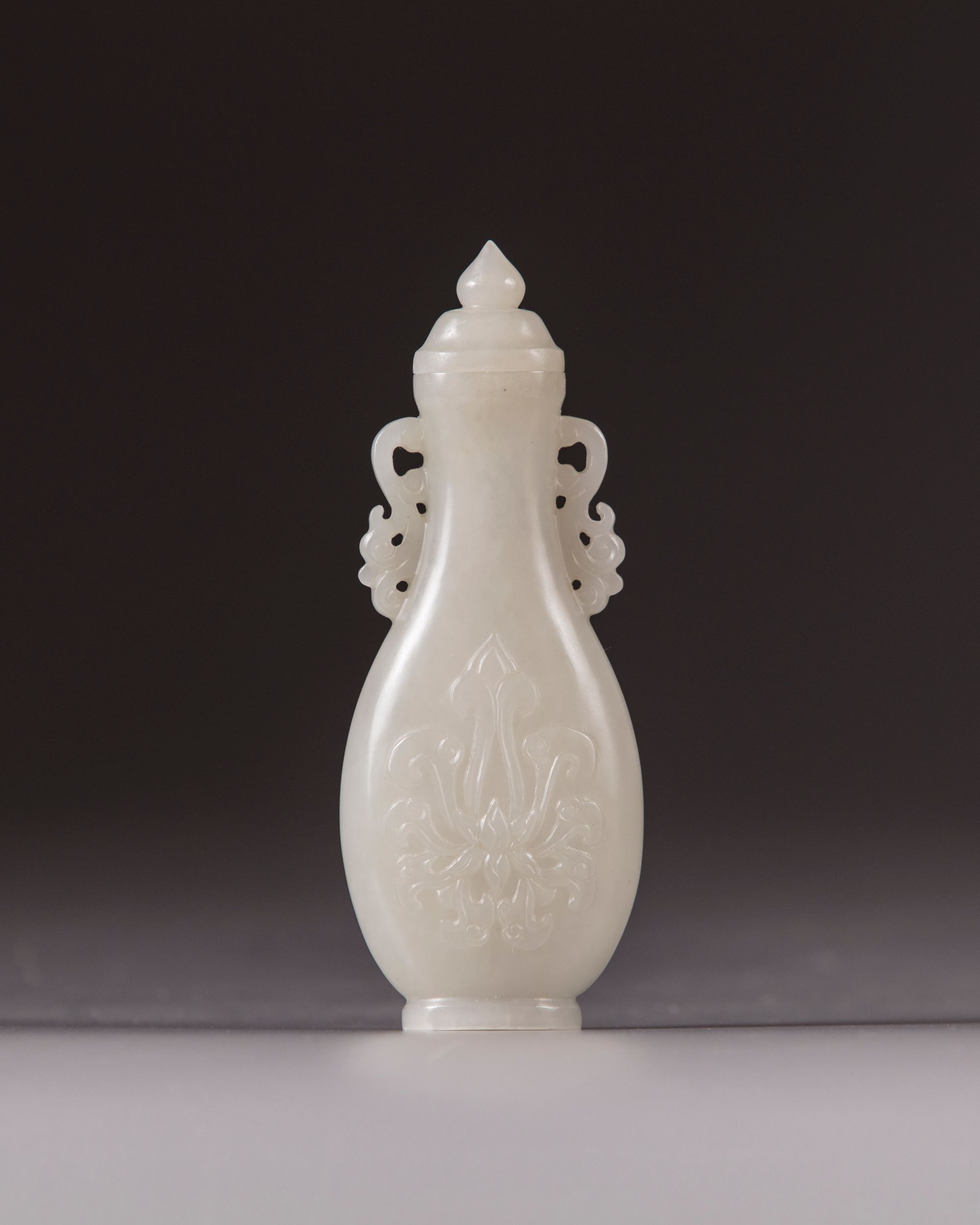 The thinly hollowed vase is fashioned with two scroll handles to the neck and shoulder. Each side is decorated with a lotus bloom in low relief. The cover is surmounted by a lotus bud finial. The stone if a pale even tone. Provenance: From the collection of mr. J.E. Vaandrager