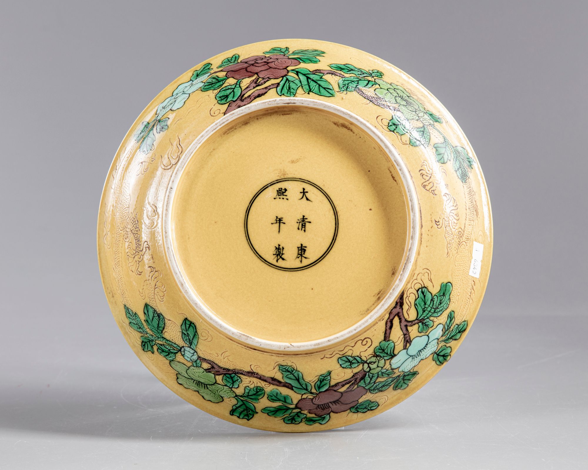 A Chinese sancai dish, decorated with fruiting branches of peaches, melon and pomegranates and dragons in low relief on a yellow ground. The bottom with a Chinese Kangxi six character mark