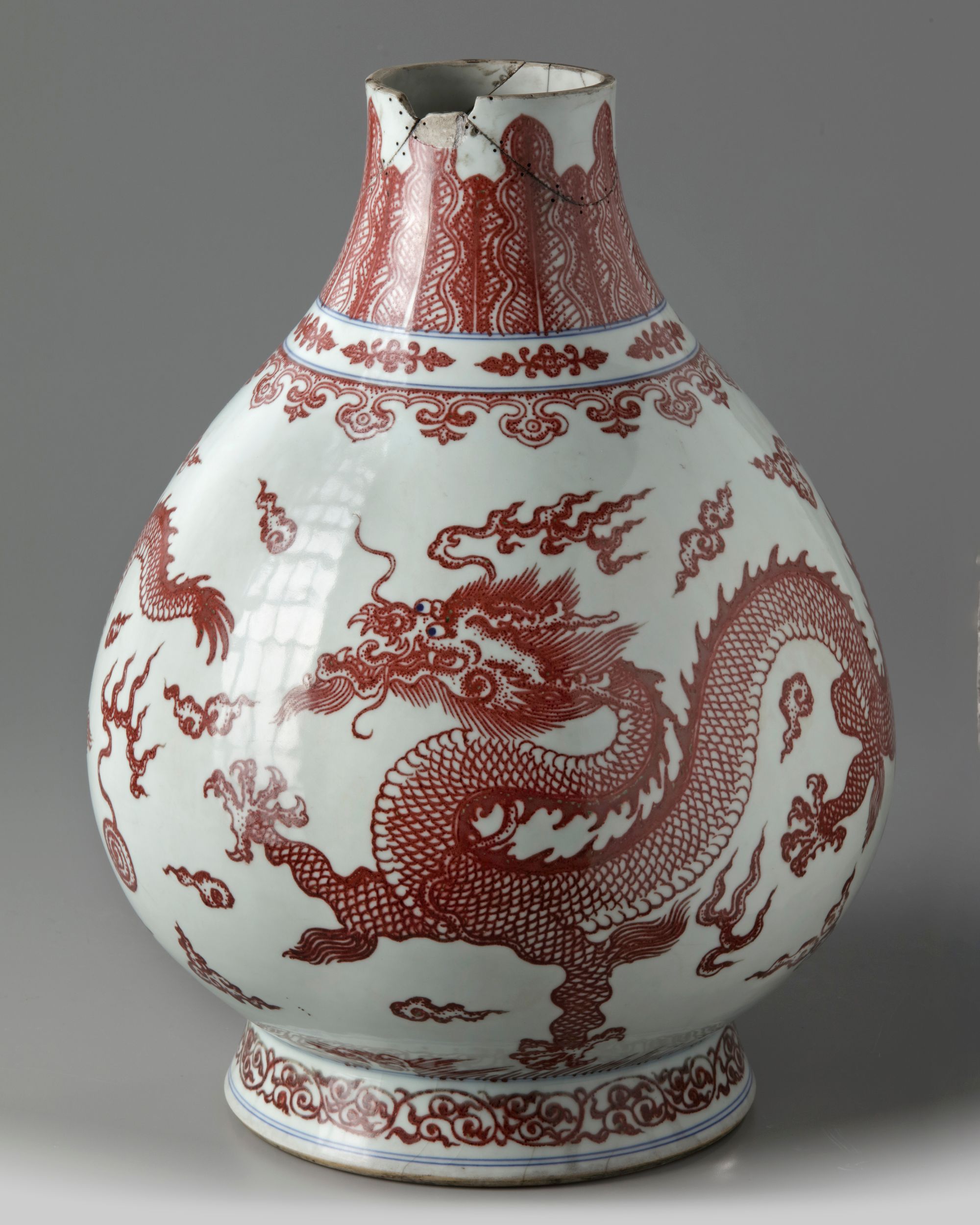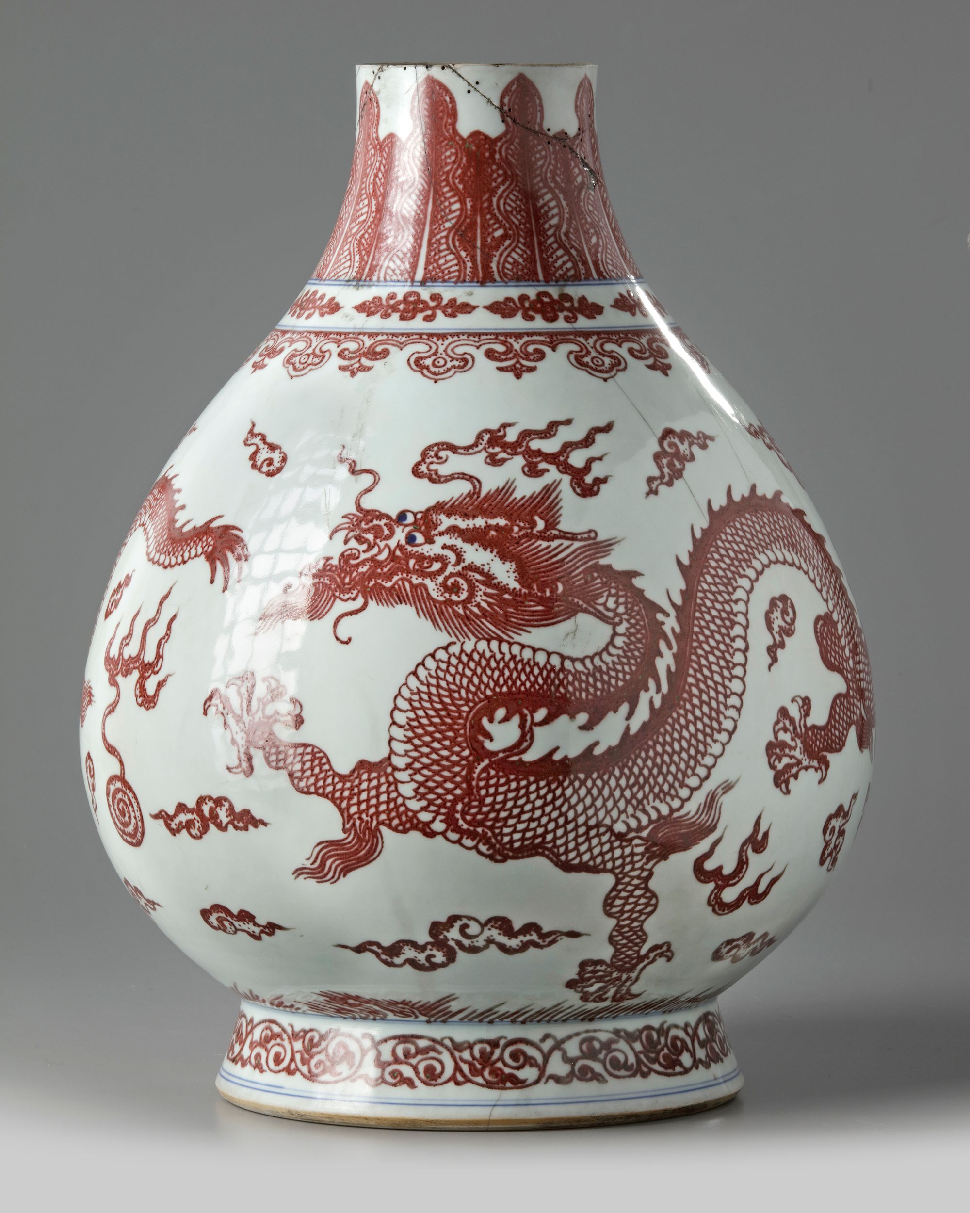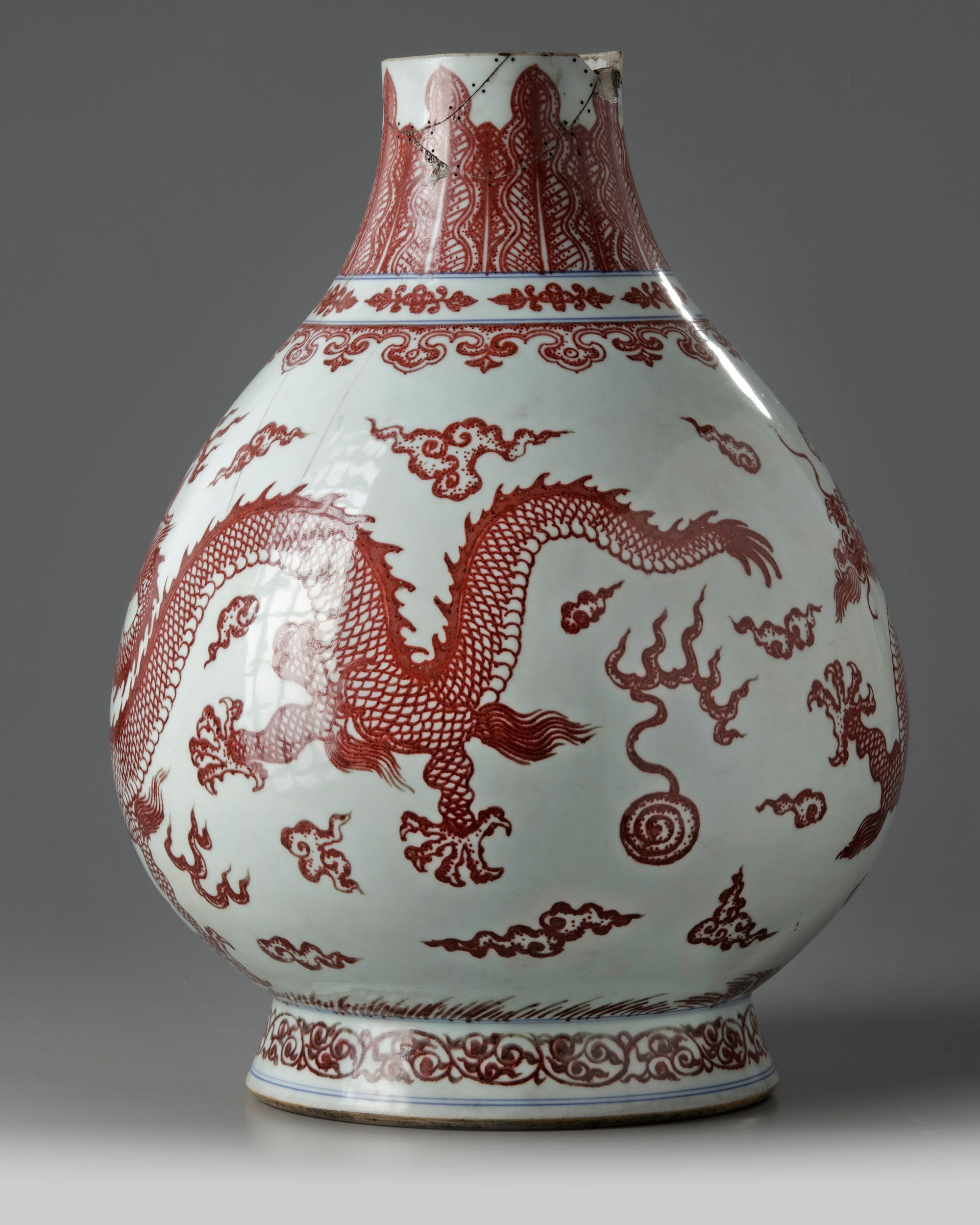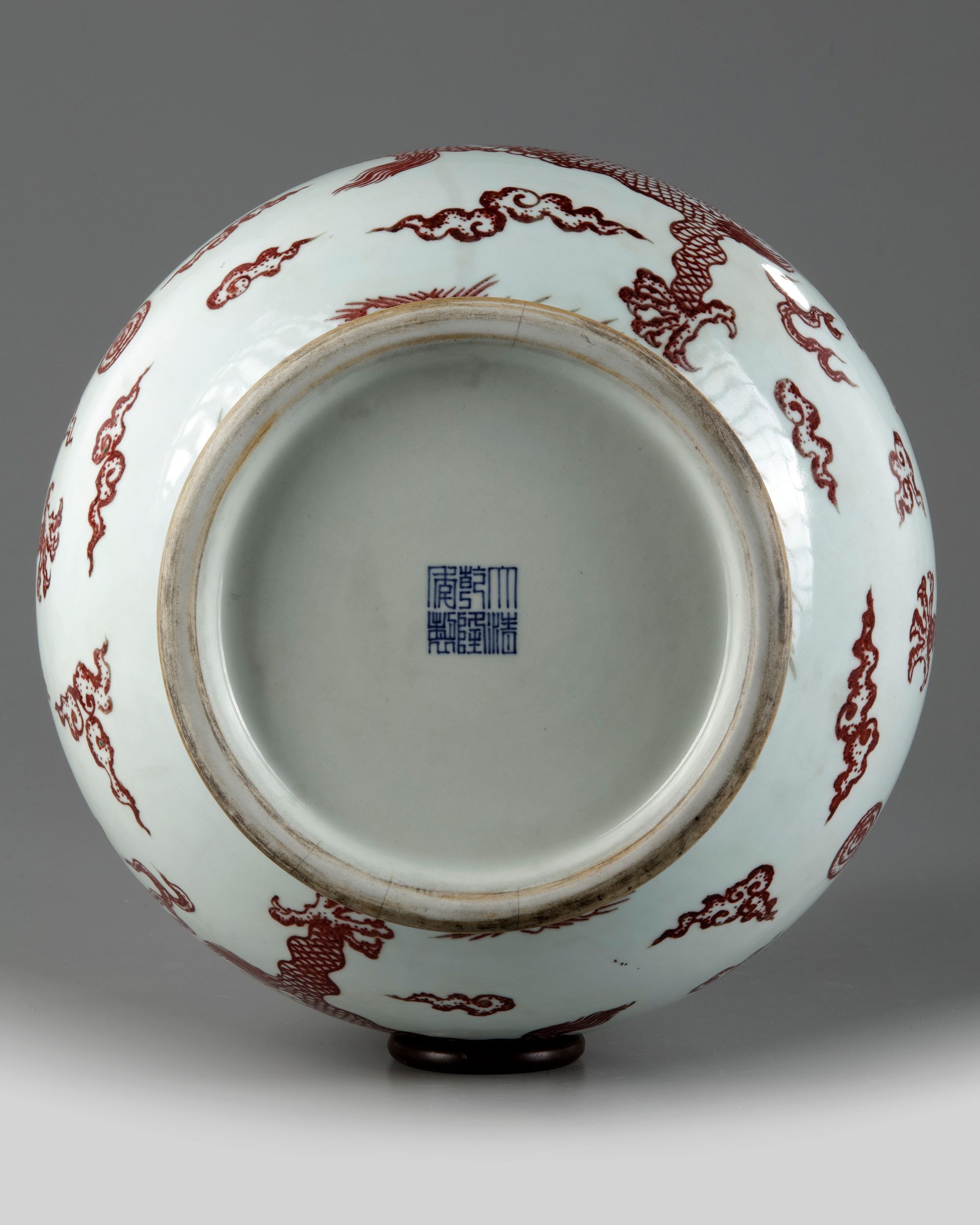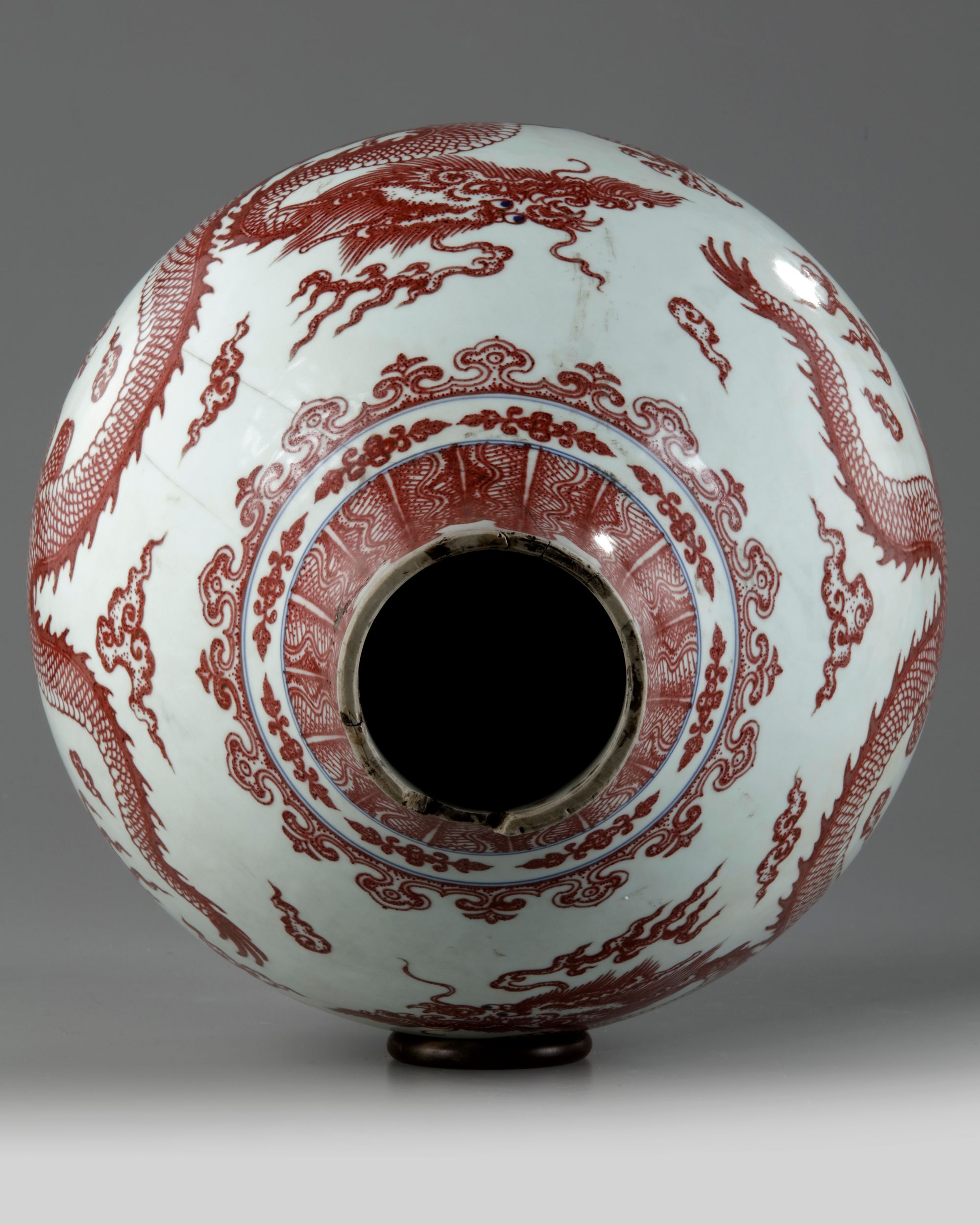The body is decorated with two striding five-clawed dragons chasing the flaming pearl amongst clouds, all below a spearhead border at the shoulder and stiff leaves at the neck. The foot is decorated with a band of classic scroll and the base with an apocryphal Qianlong mark.