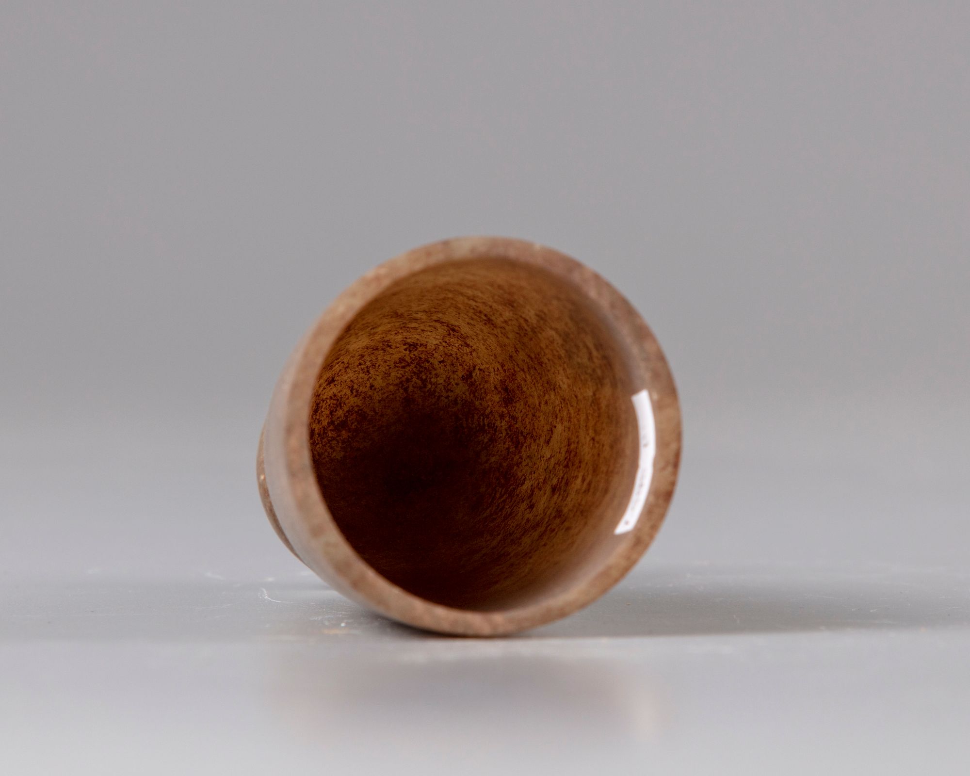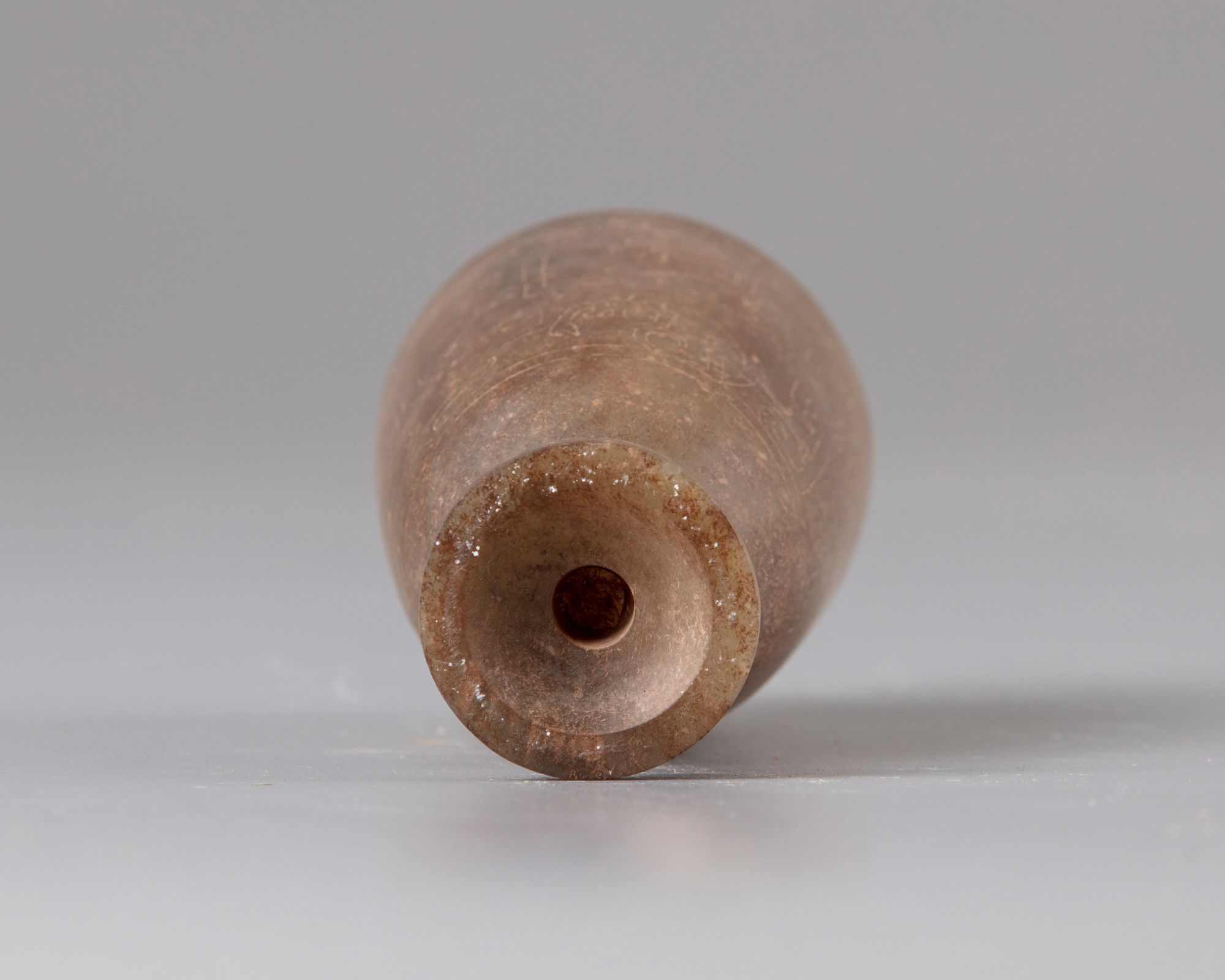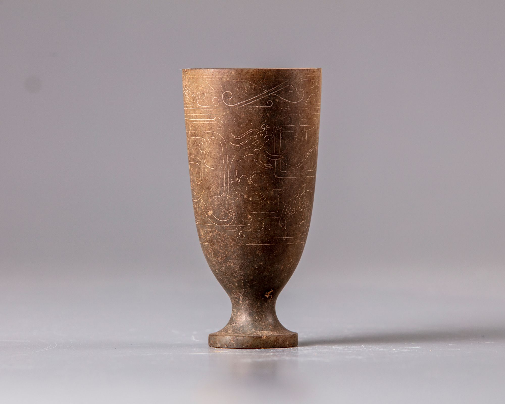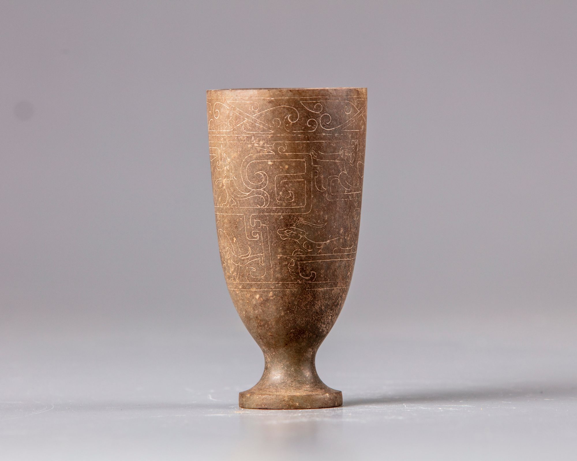Standing on a small foot and incised with dragons and birds within scrolls.