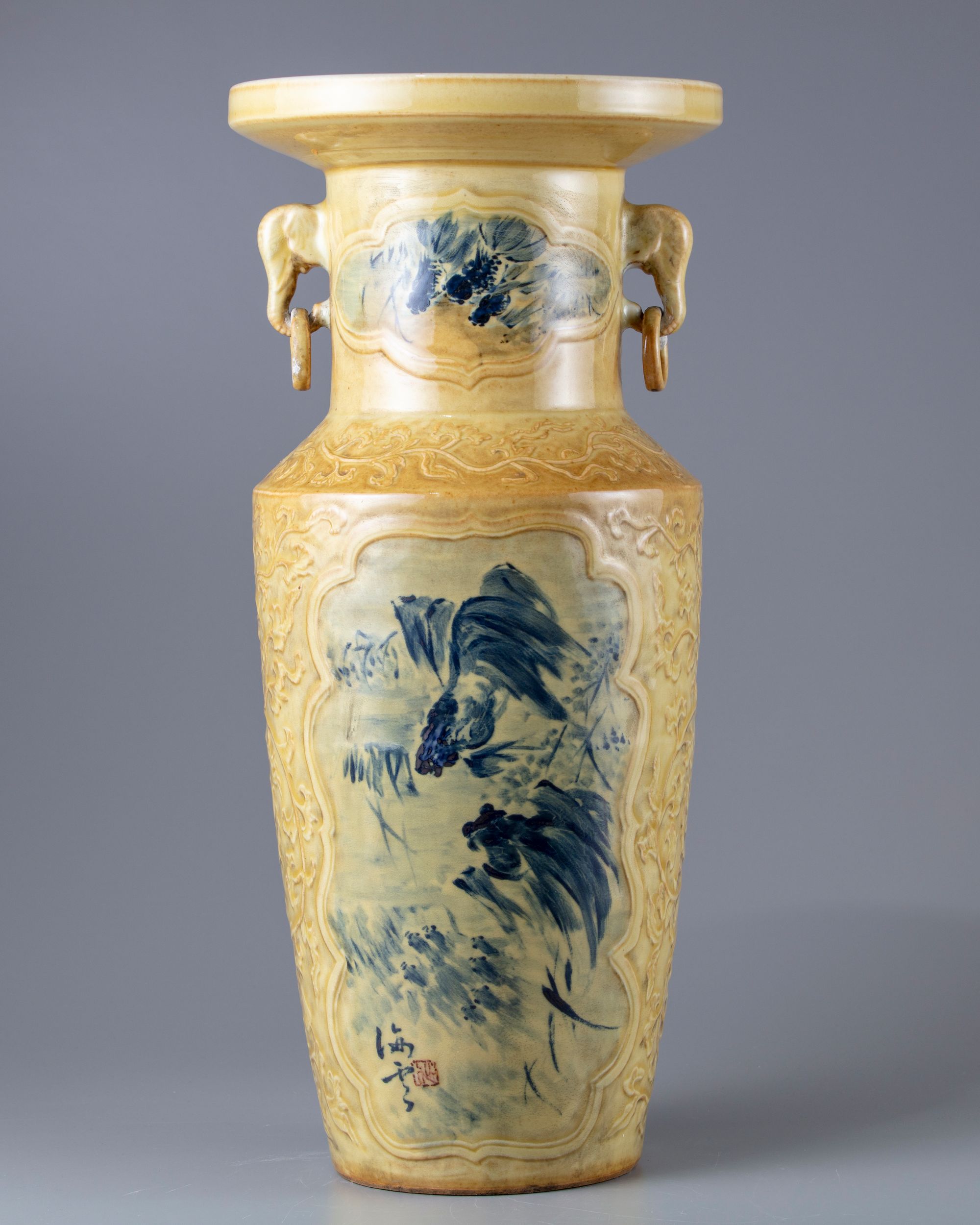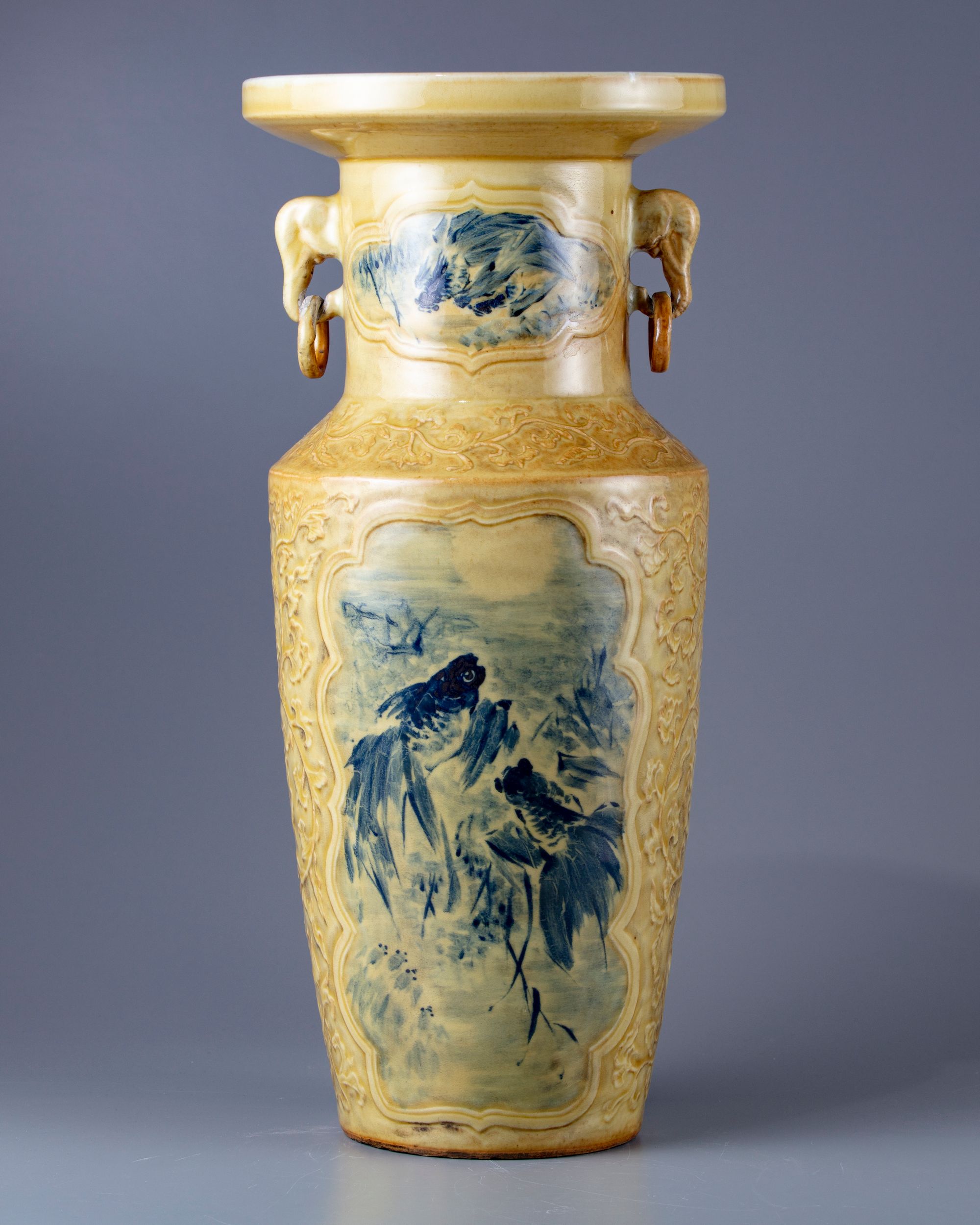 The vase is stylised with two elephant head handles to the neck, the body and the neck are decorated with octofoil panels enclosing two blue fishes on a creme ground.