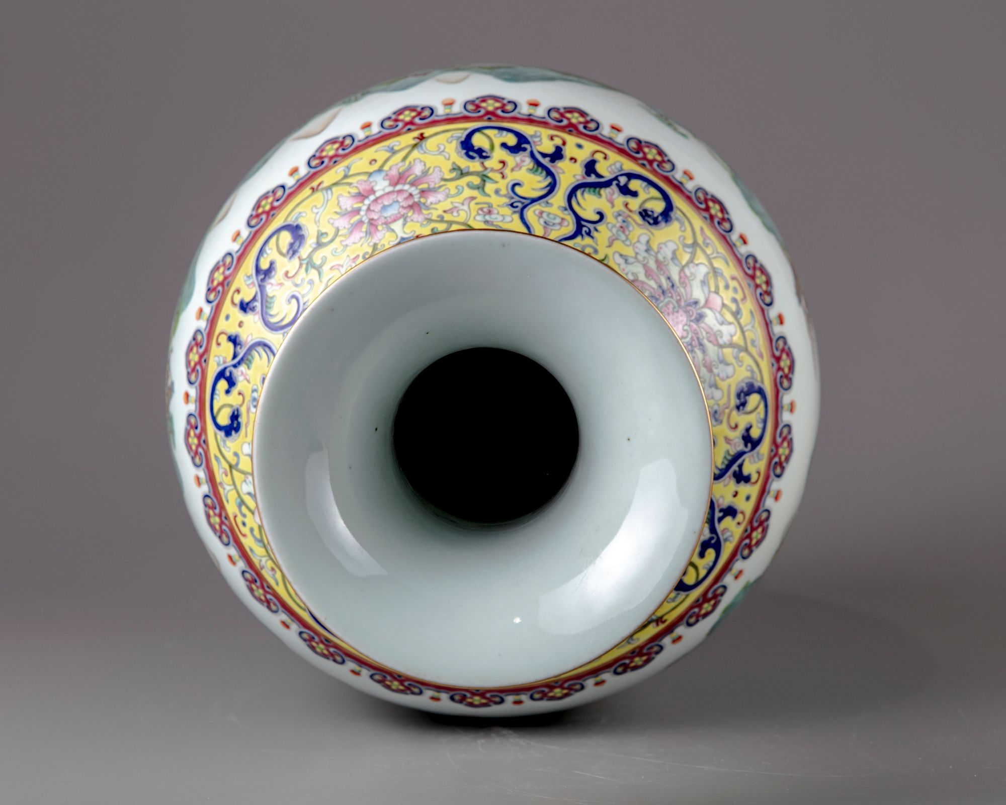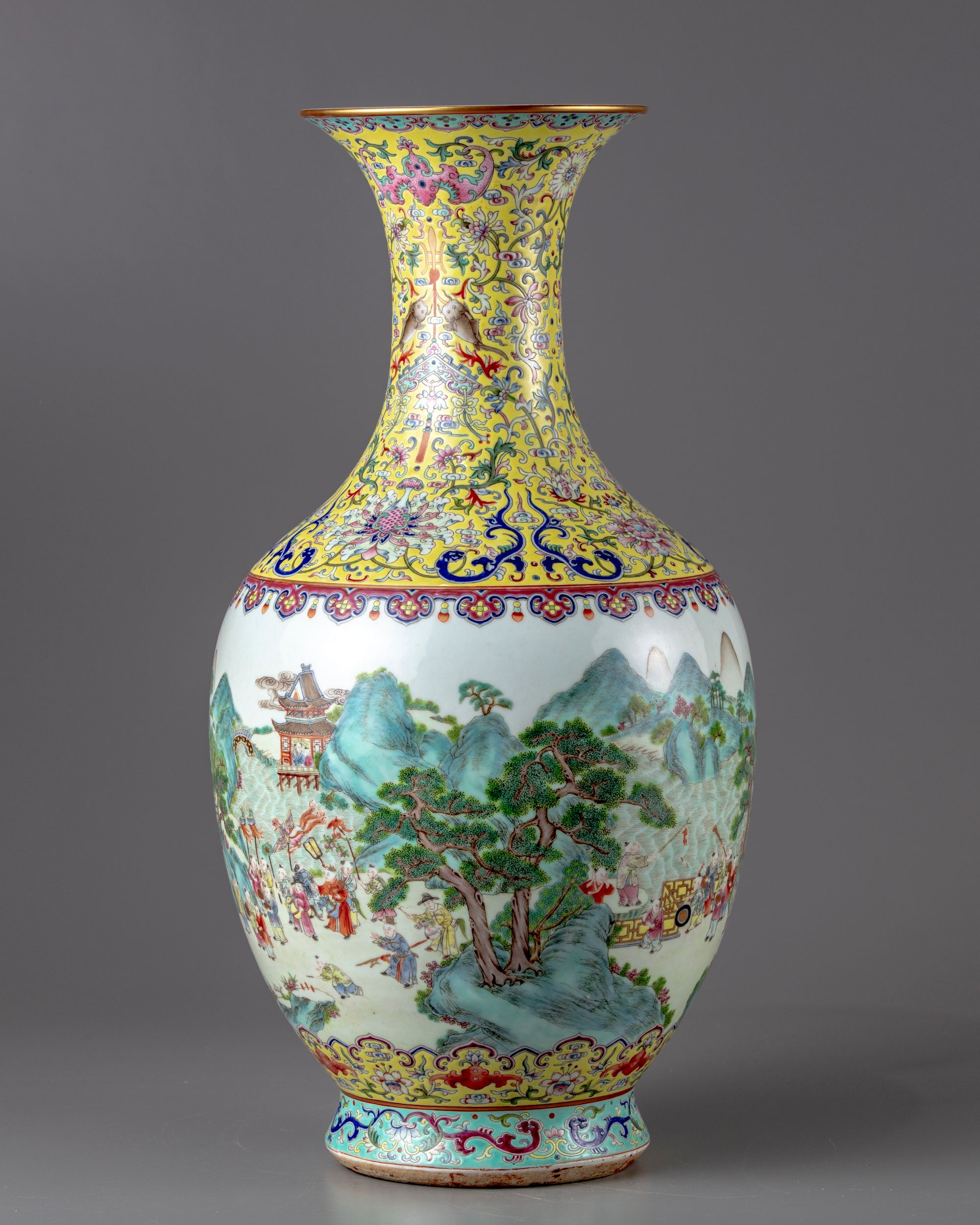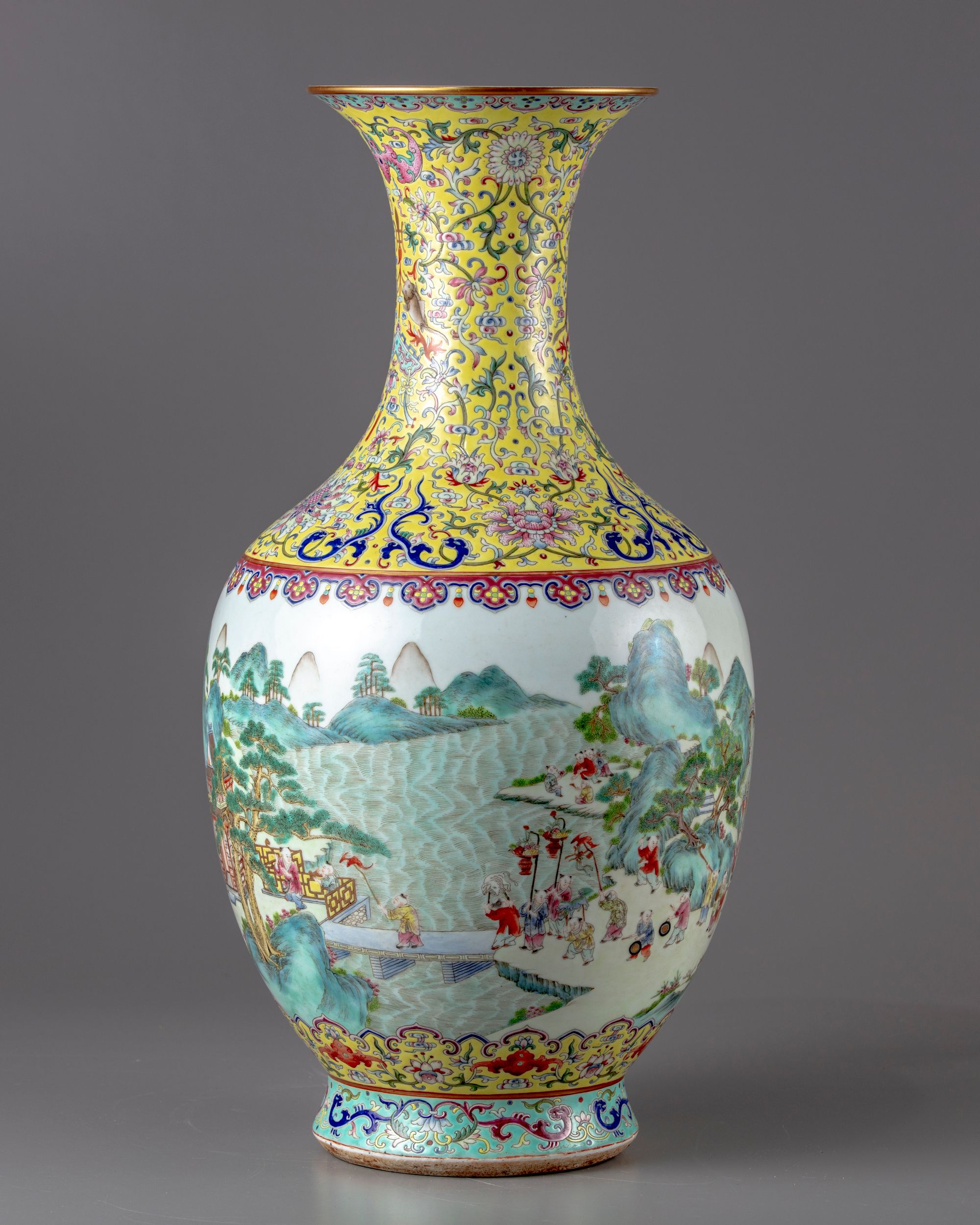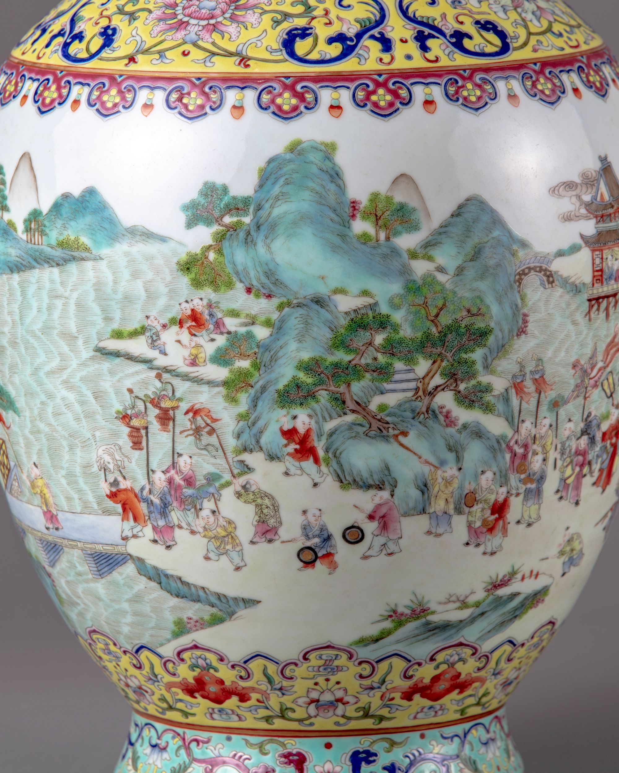 The vase constructed with an ovoid body sweeping up to a waisted neck and flared rim, the neck decorated in the famille-rose palette with large stylised flower heads, including lotus, iris and honeysuckle, all wreathed by feathery foliate scrolls, further painted on both sides with a stylised floral bloom suspending a chime with a double-fish and a tasselled wan symbol attached to it, under two large rose Fu bats. The body decorated with a lively continuous scene of a parade of boys holding a dragon, lanterns, animal puppets, playing instruments, all above an upright elongated ruyi heads enclosing Fu bats.The base with a Jiaqing seal mark.