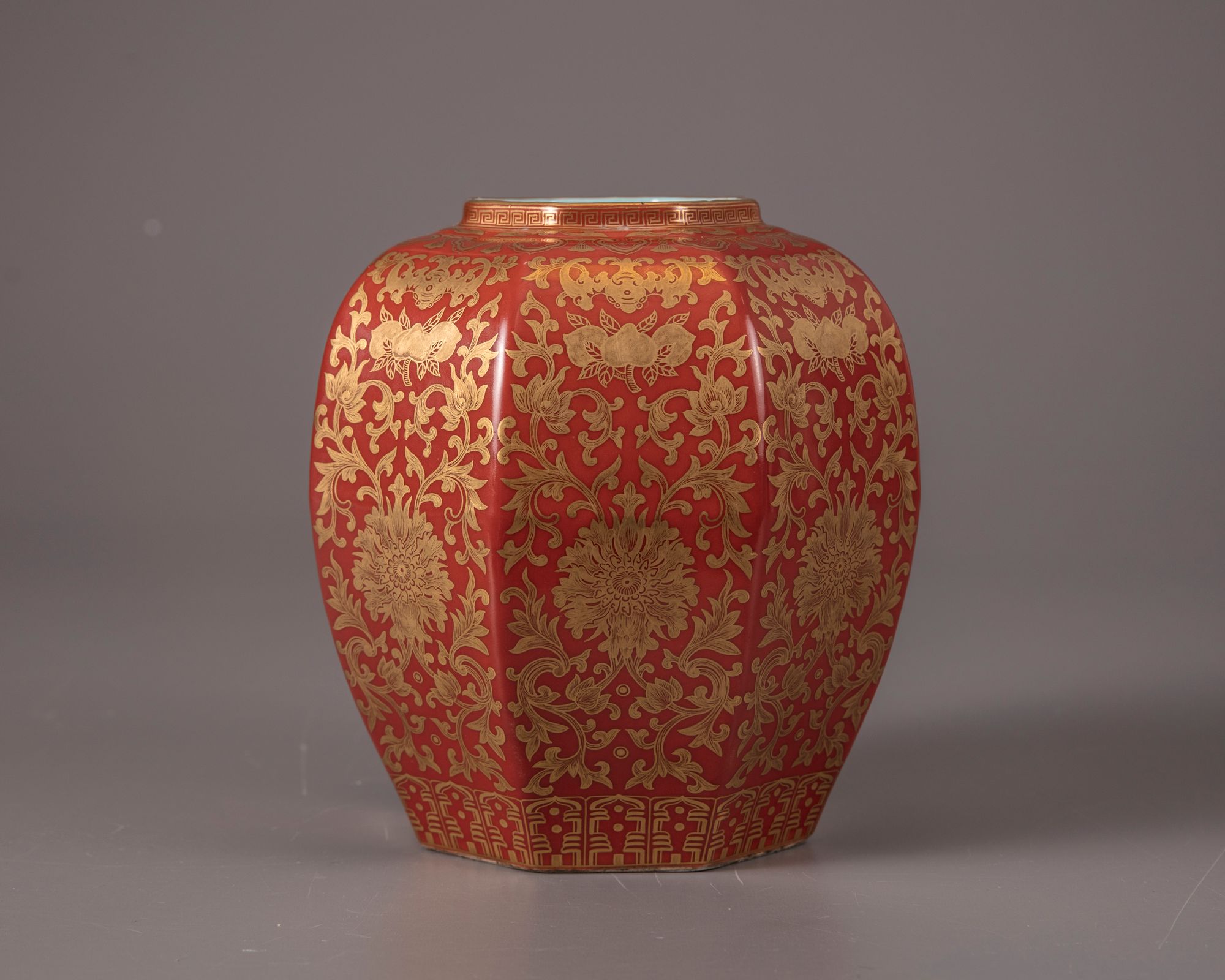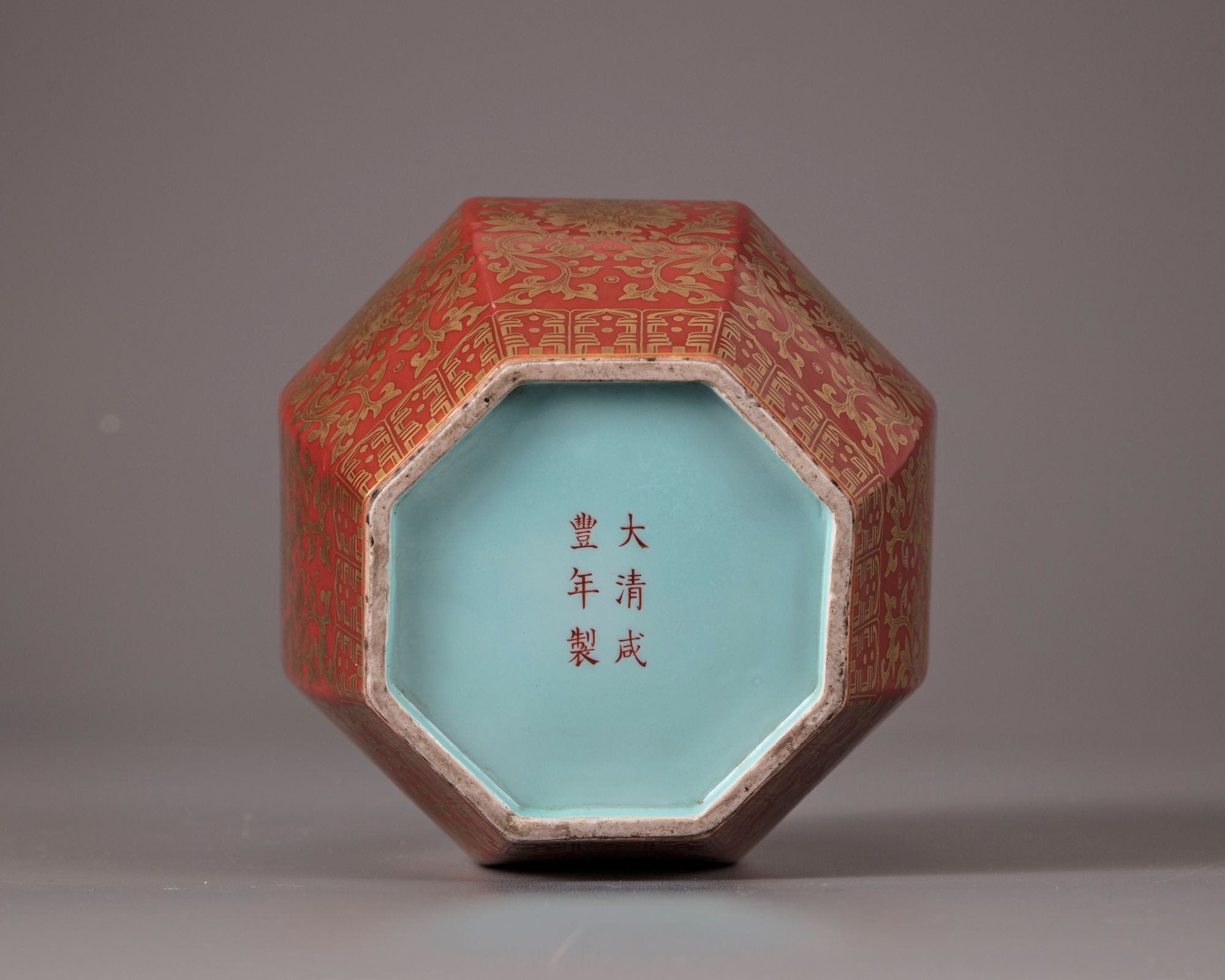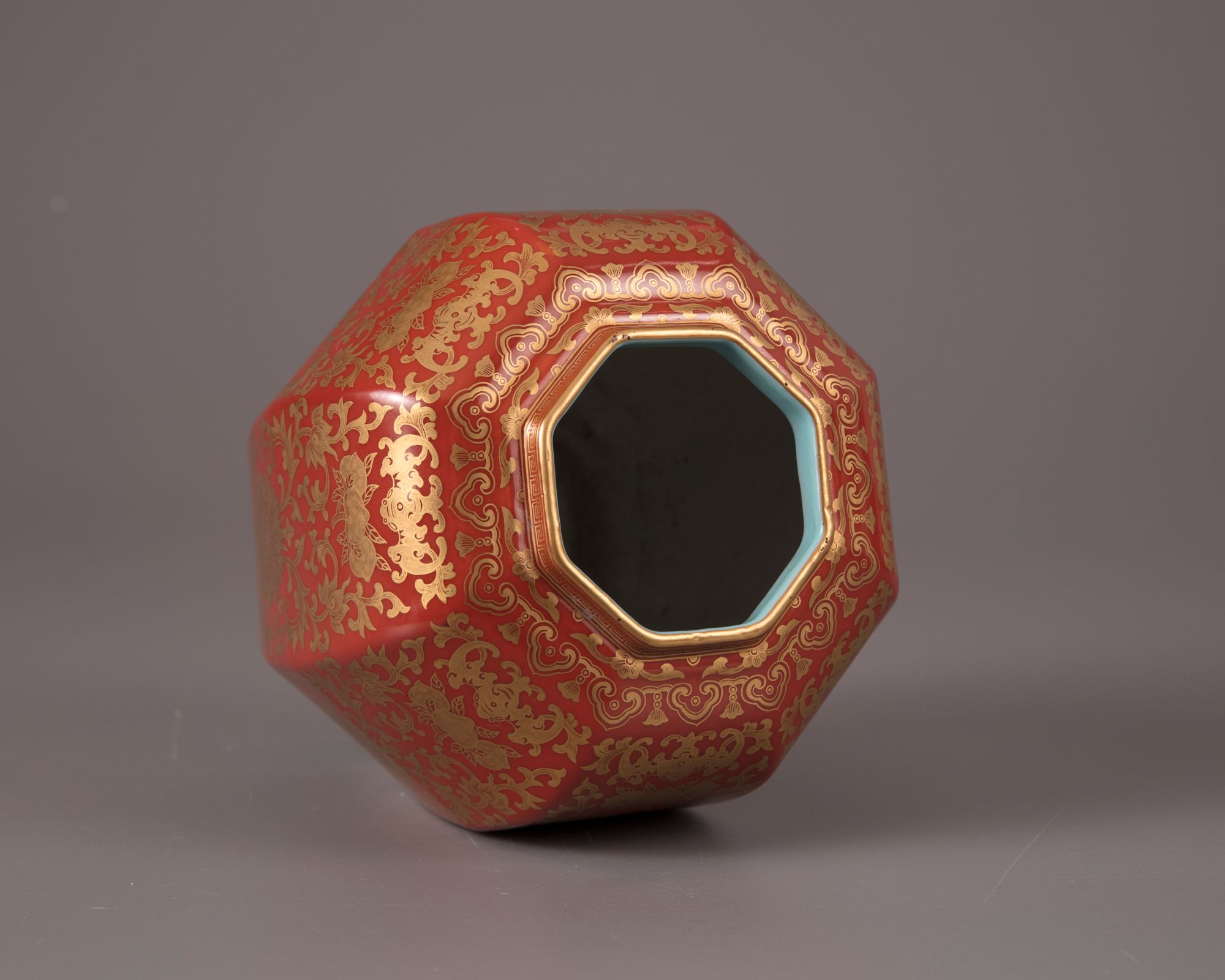 The octagonal vase is decorated with gilt chrysanthemums and foliage scrolls on a coral red ground, with a key fret chain to the rim and a petal lappet border to the base.