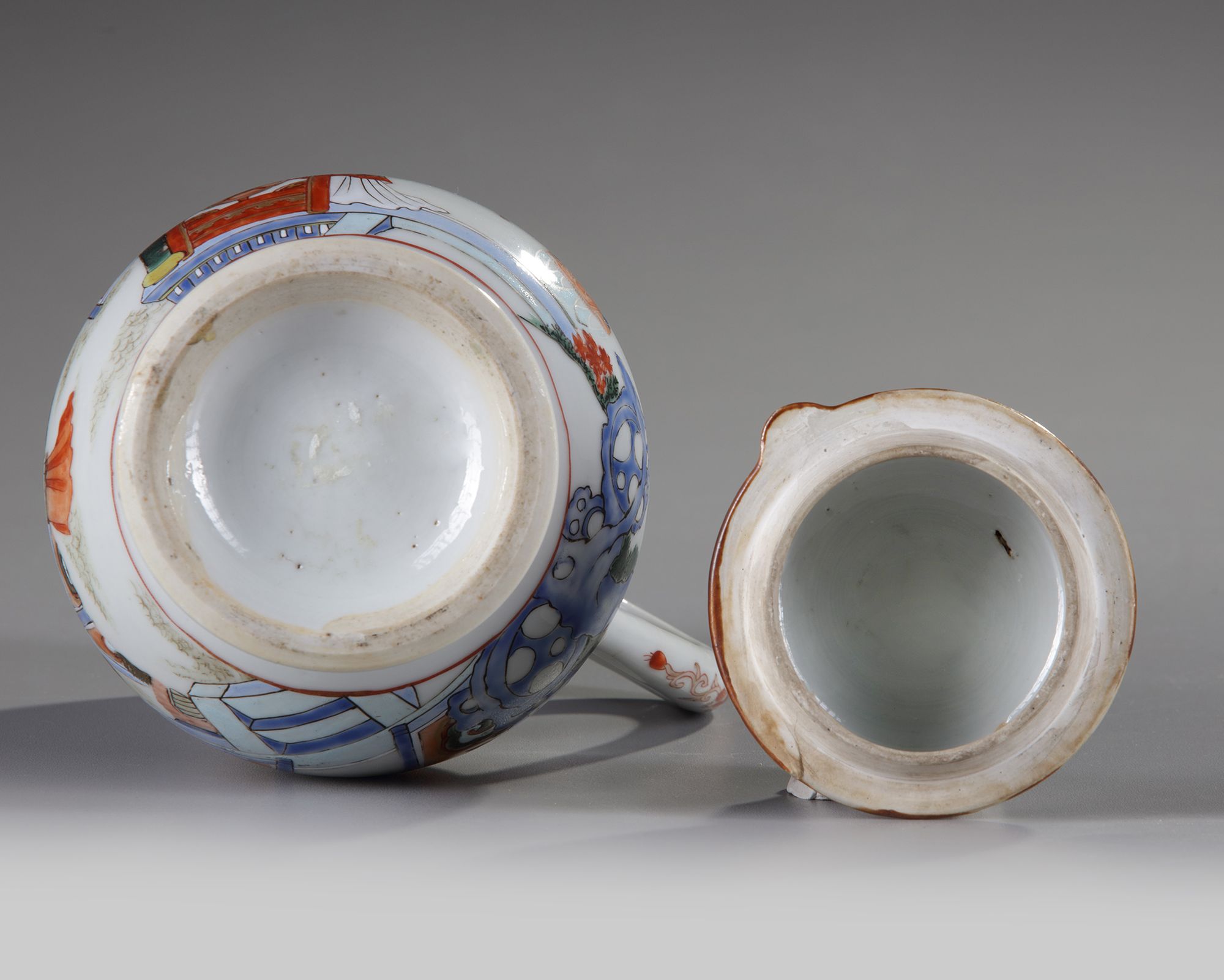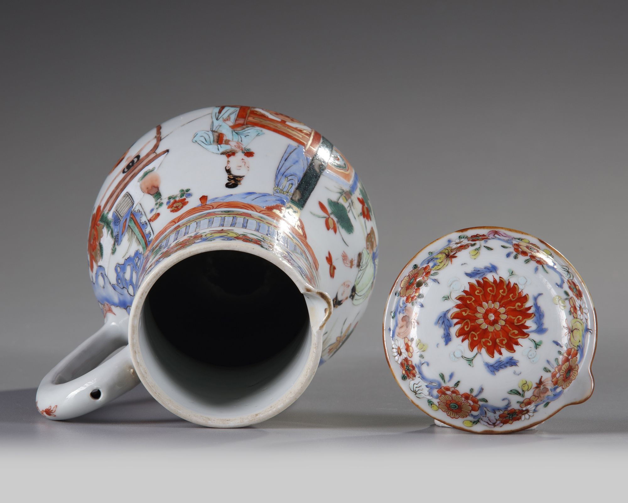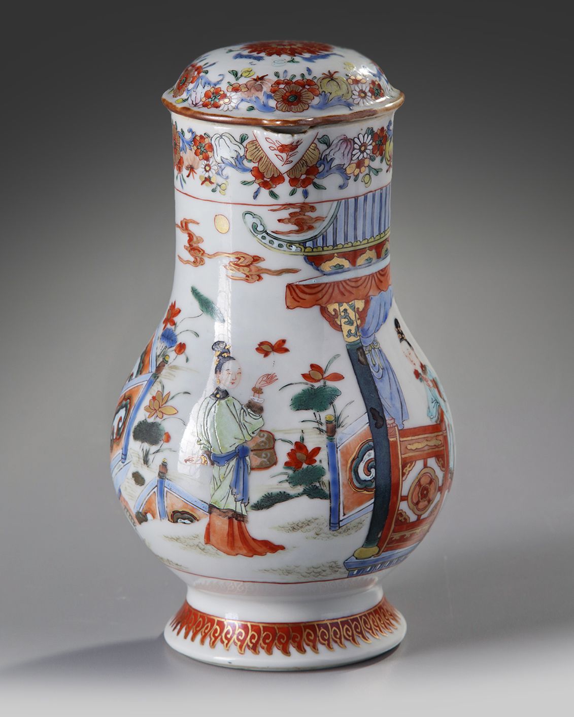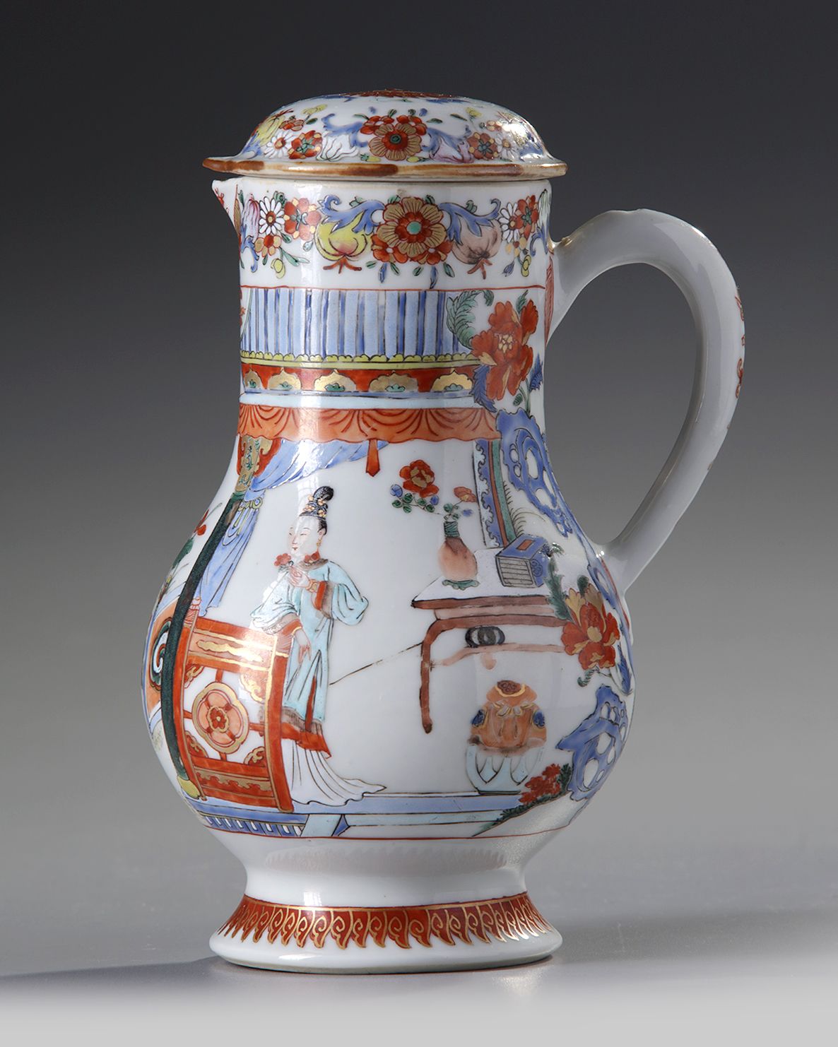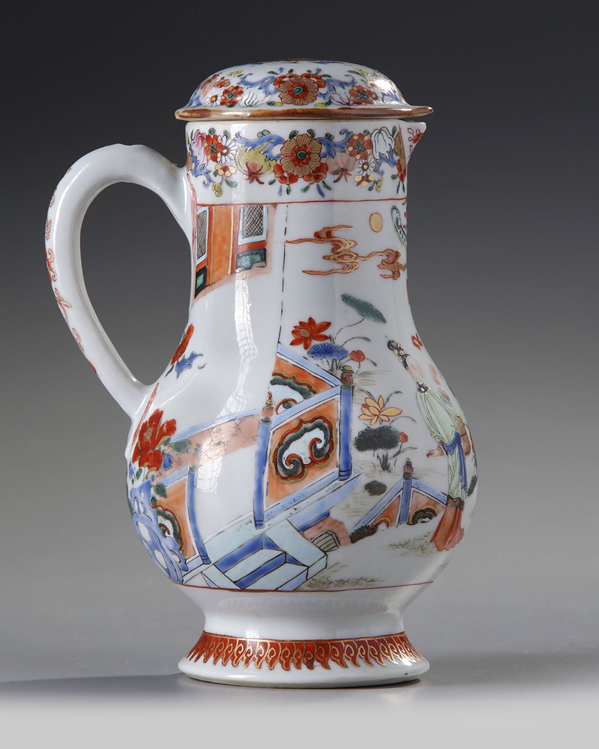 The jug is delicately enamelled to the body with two ladies on a terrace, all below a band of flowers and fruits at the rim. The slightly domed cover is decorated with a flowerhead surrounded by a matching floral band.
