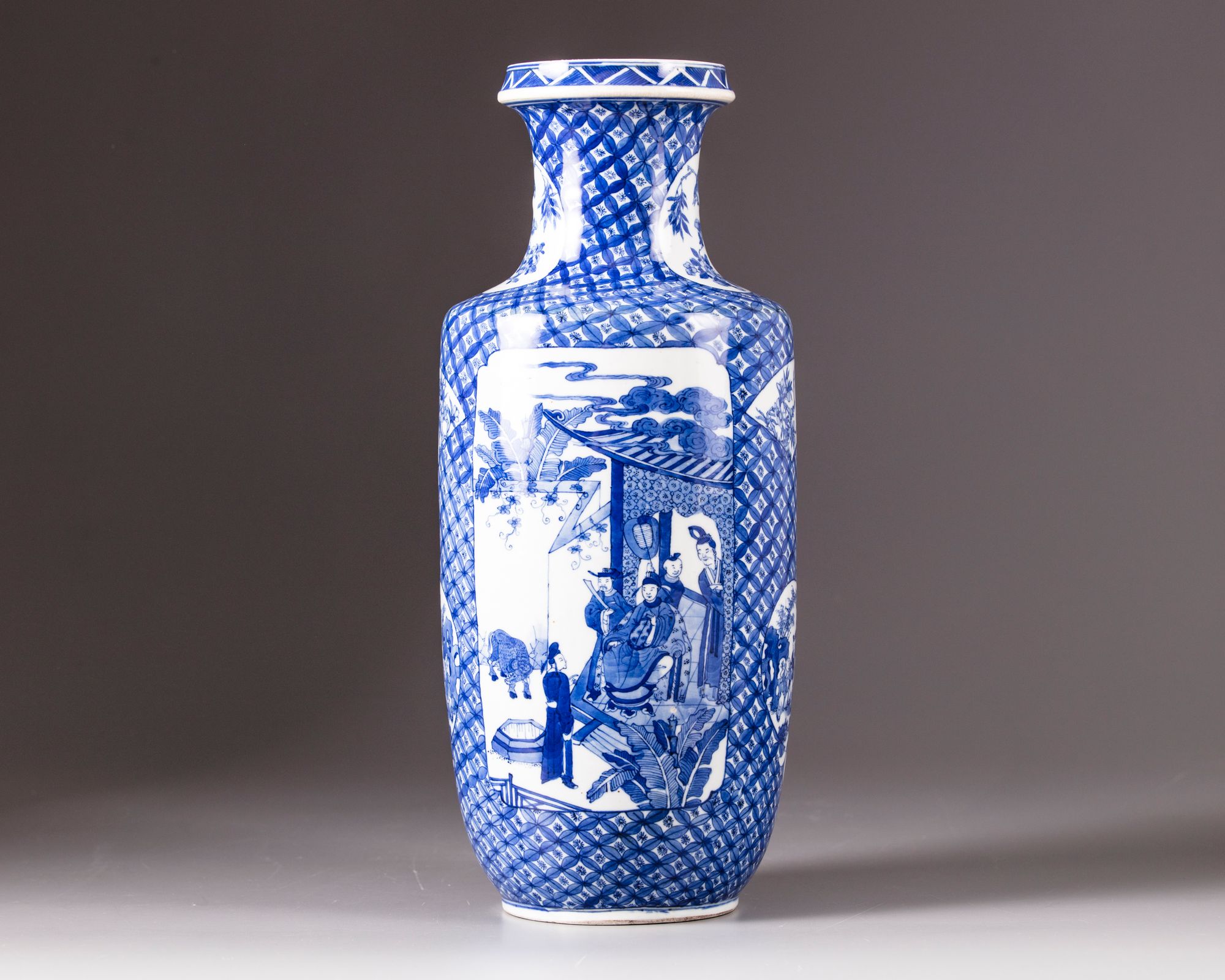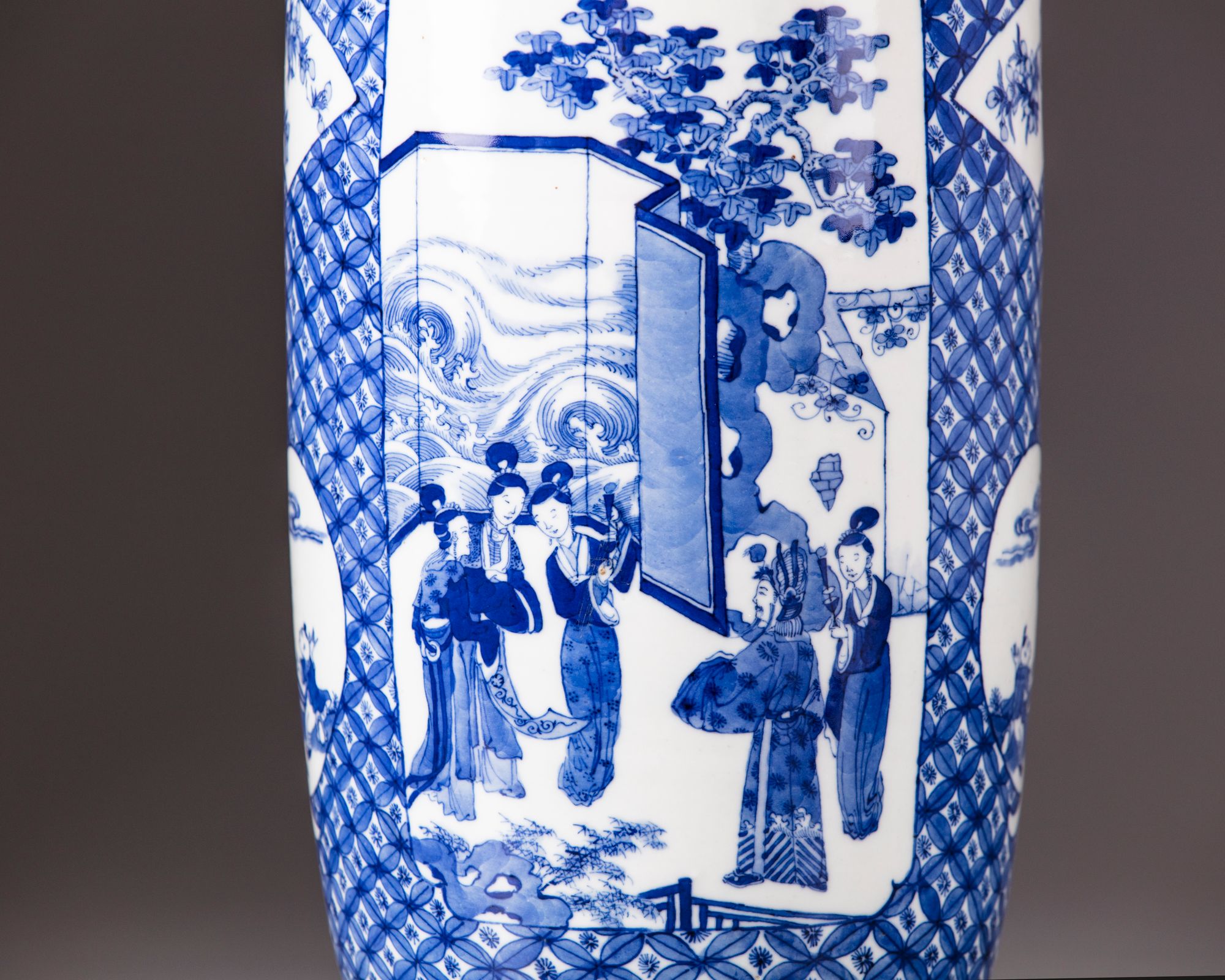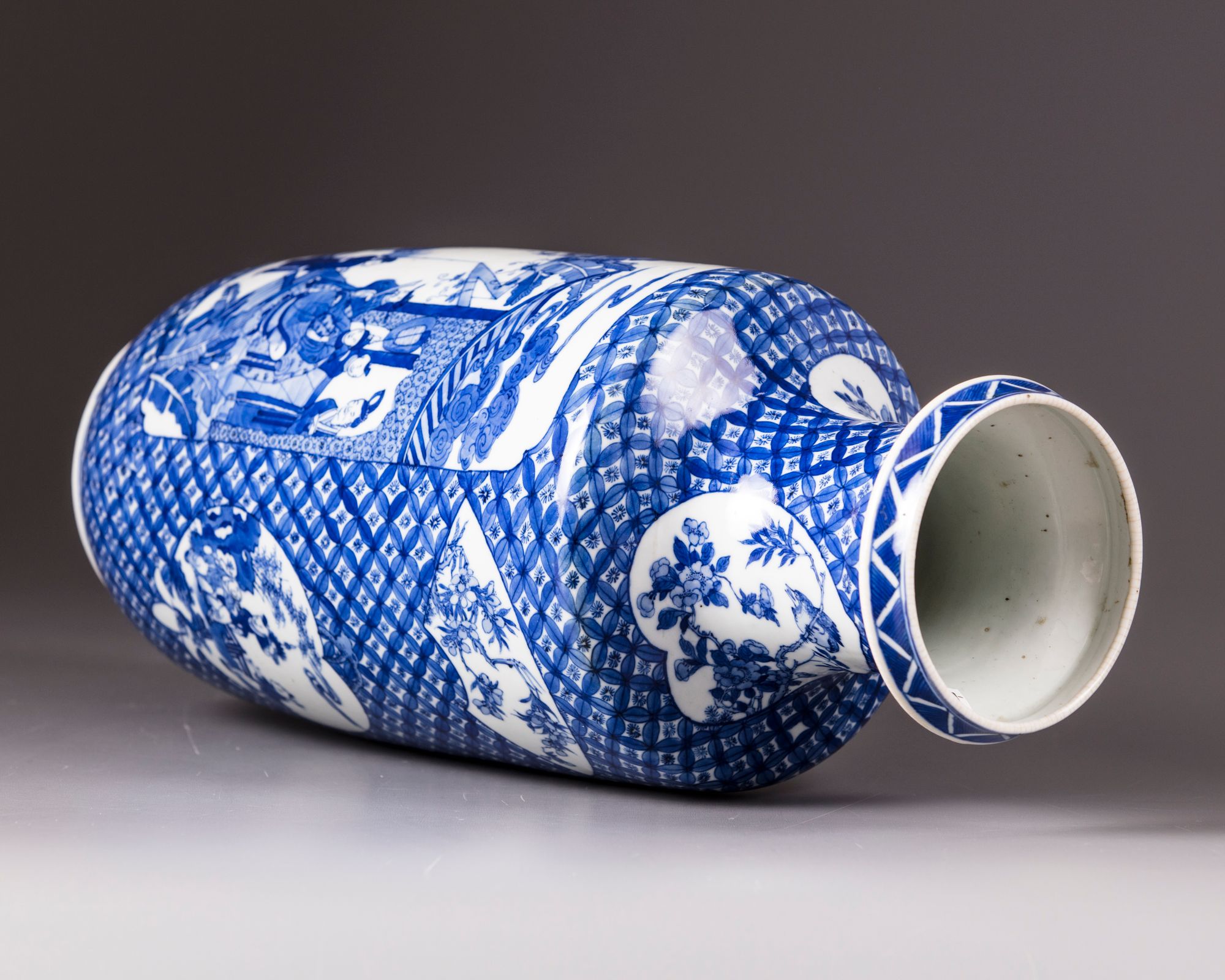 Decorated with two large panels enclosing a dignitary with his servants and ladies with their servant. Further painted with two pomegranate shaped panels with kids at play, two peach shaped panels with a bird perched on a flowering branch and two Fan shaped panels with flowering branches.