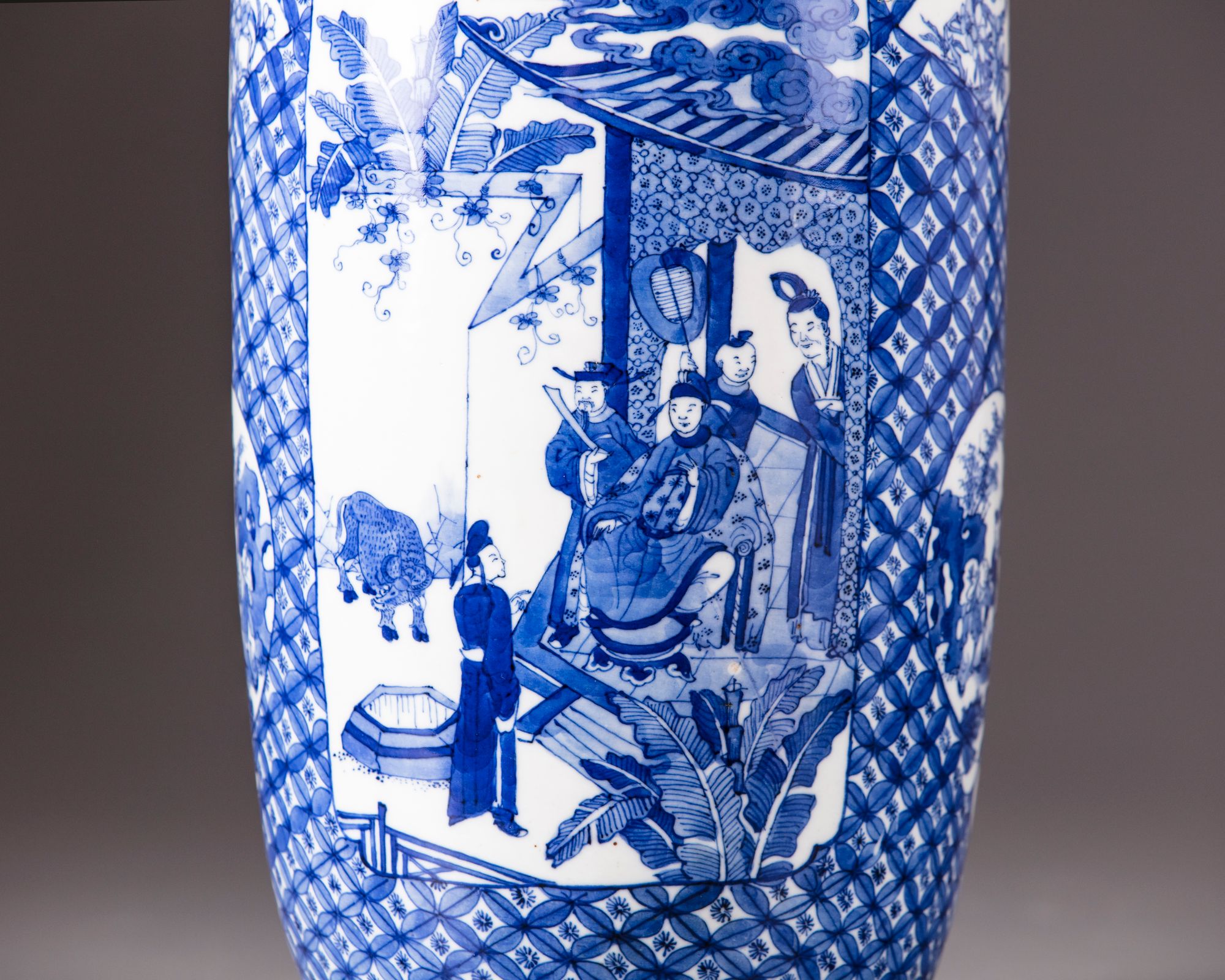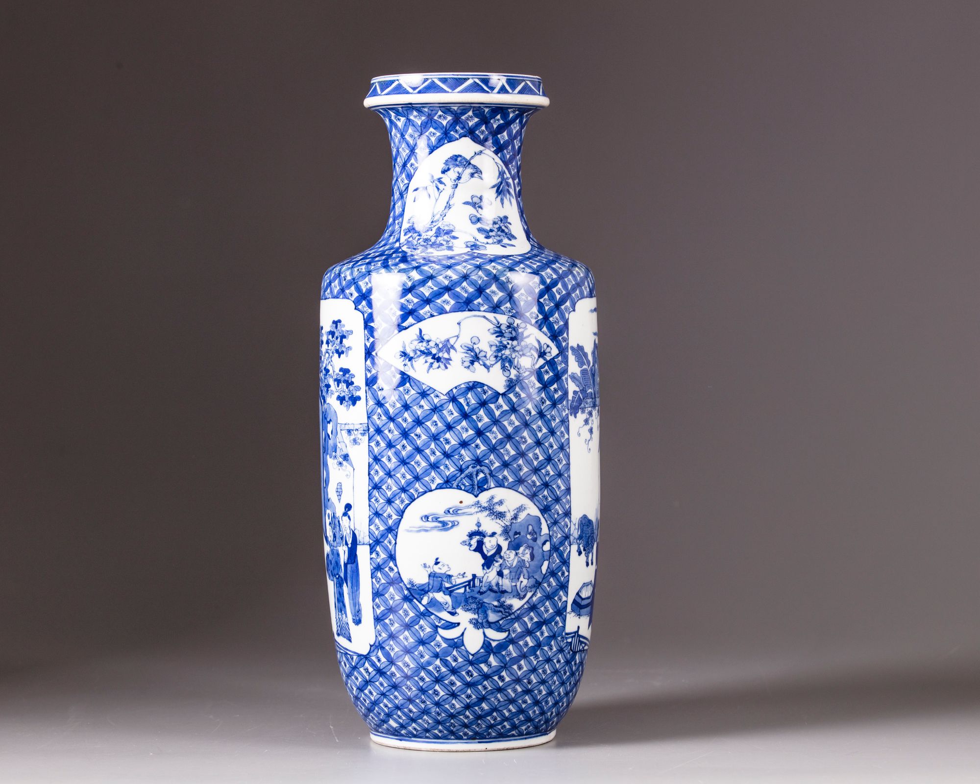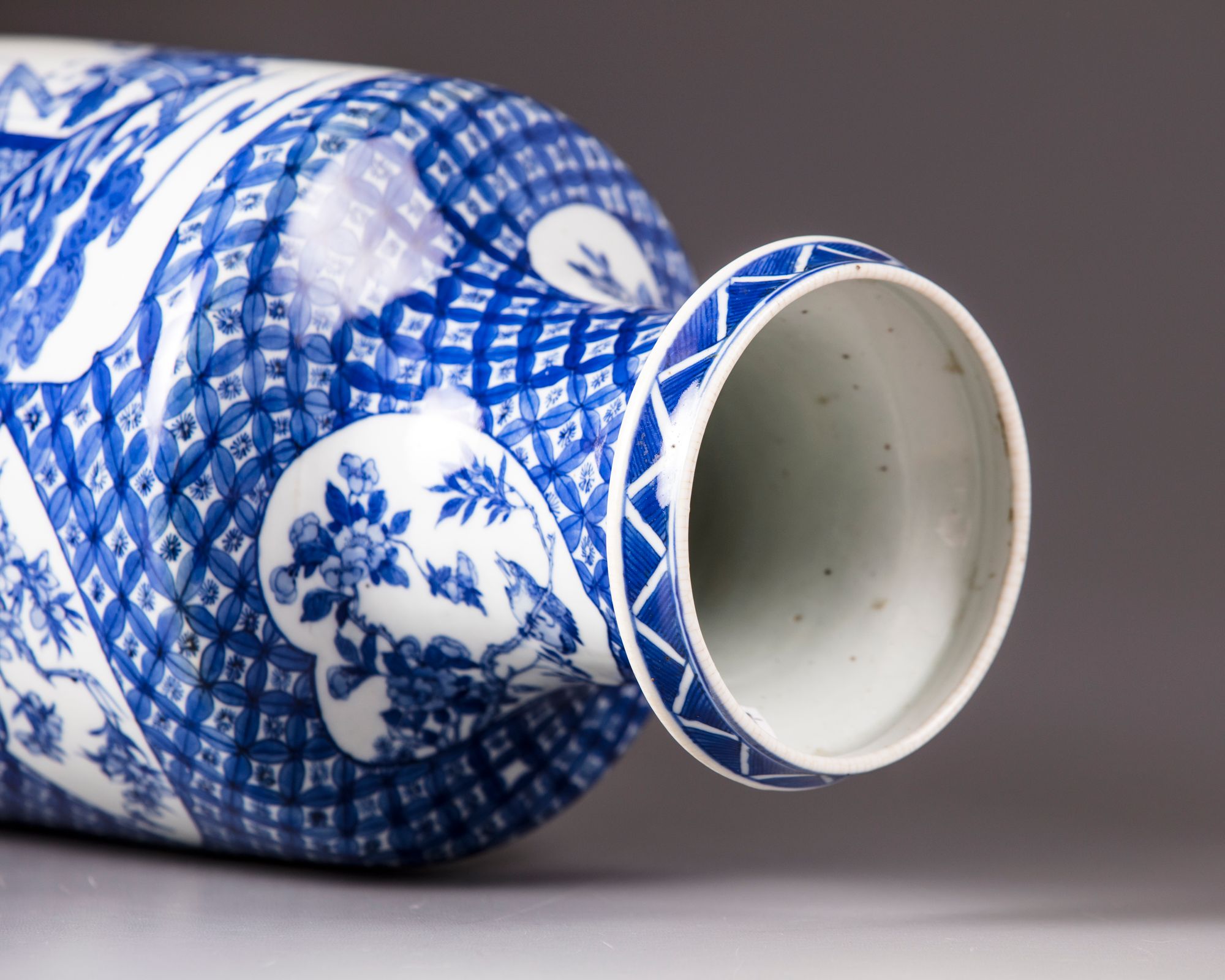 Decorated with two large panels enclosing a dignitary with his servants and ladies with their servant. Further painted with two pomegranate shaped panels with kids at play, two peach shaped panels with a bird perched on a flowering branch and two Fan shaped panels with flowering branches.