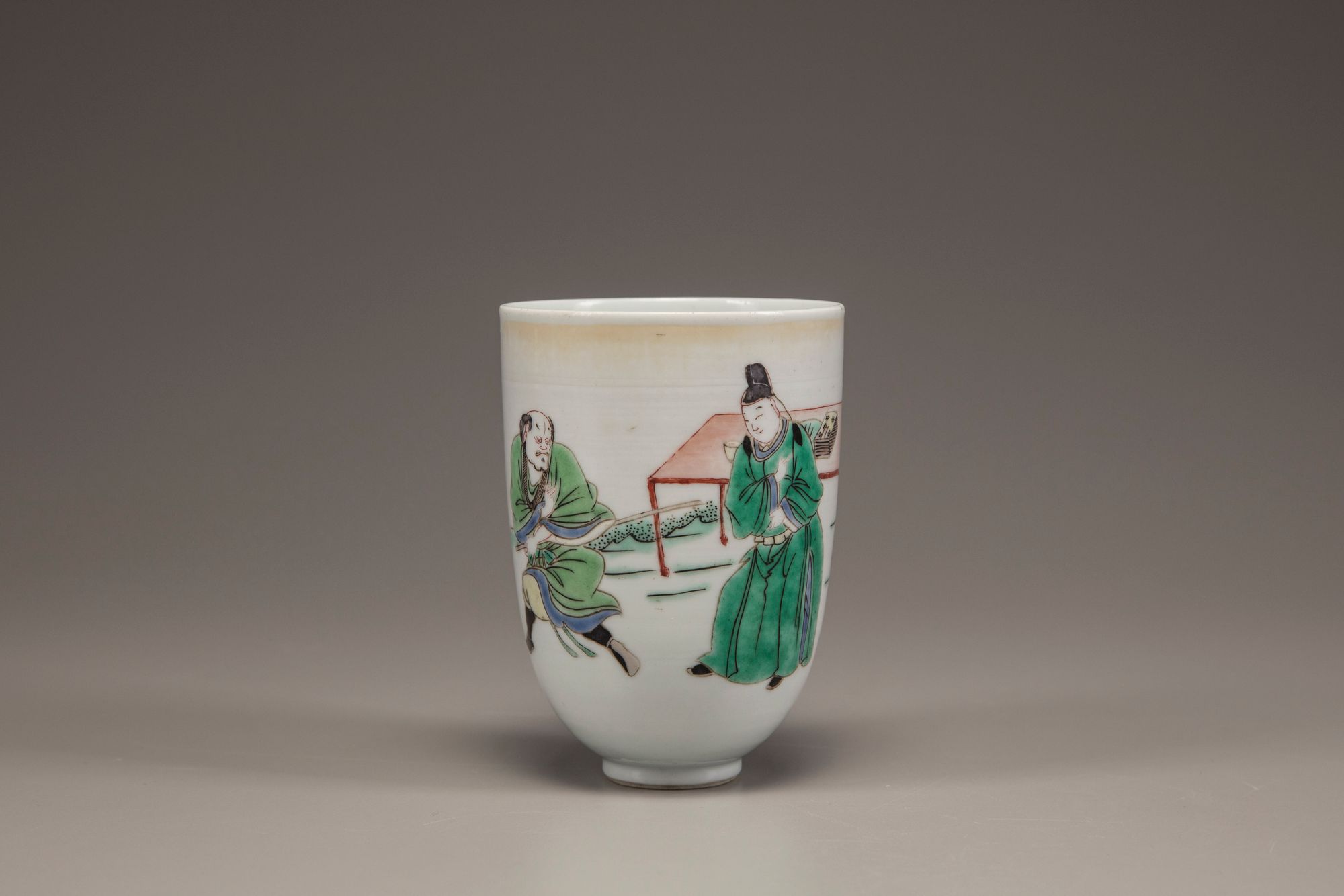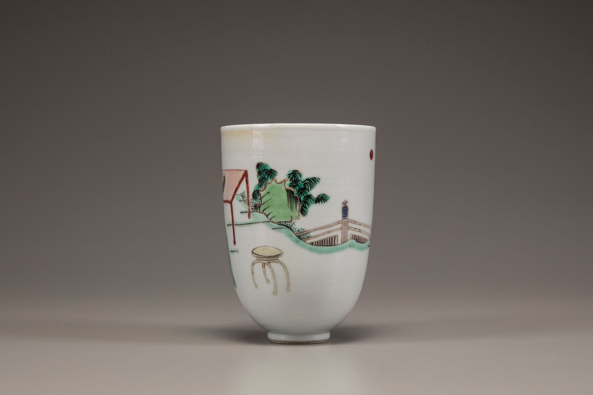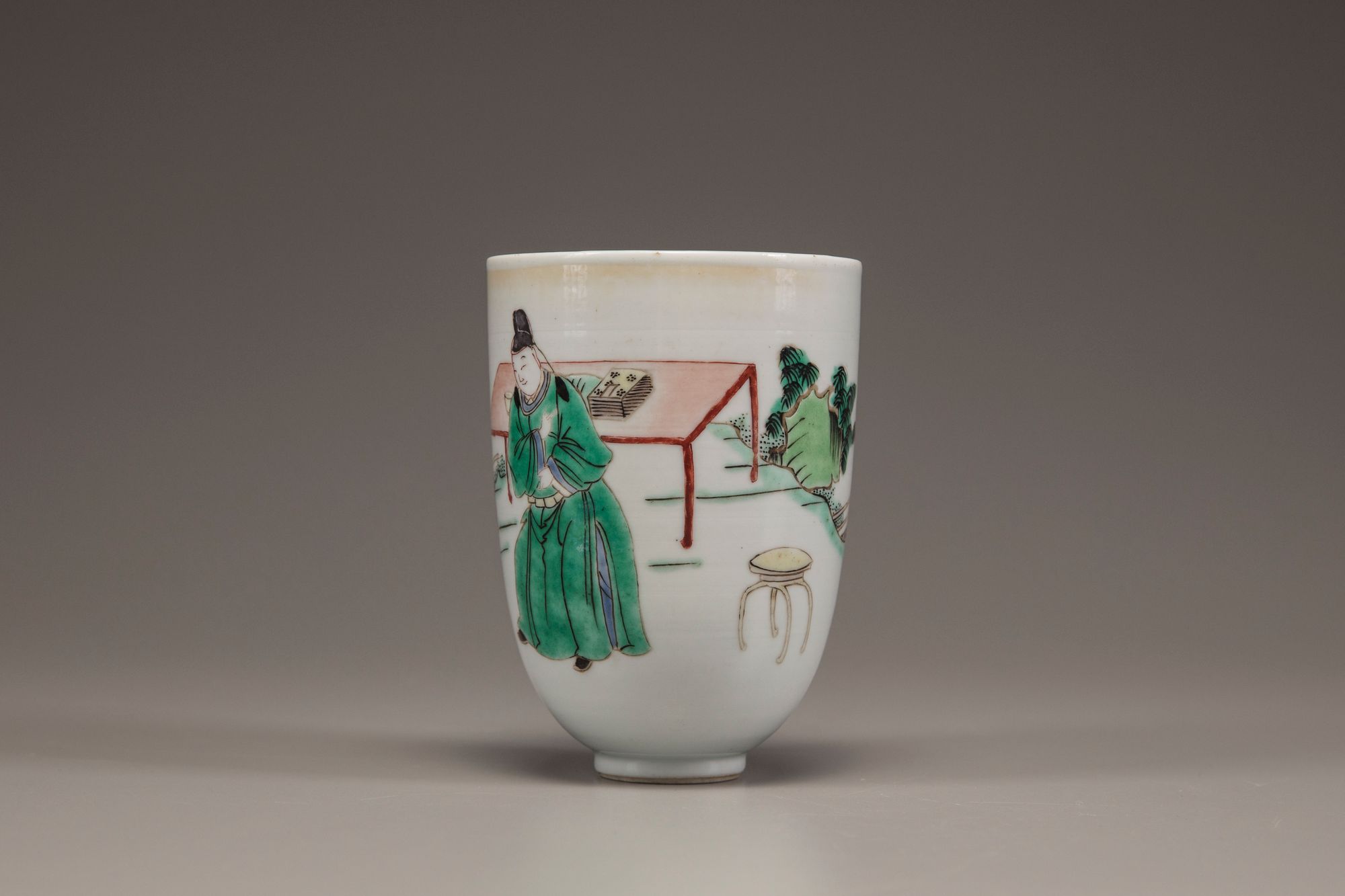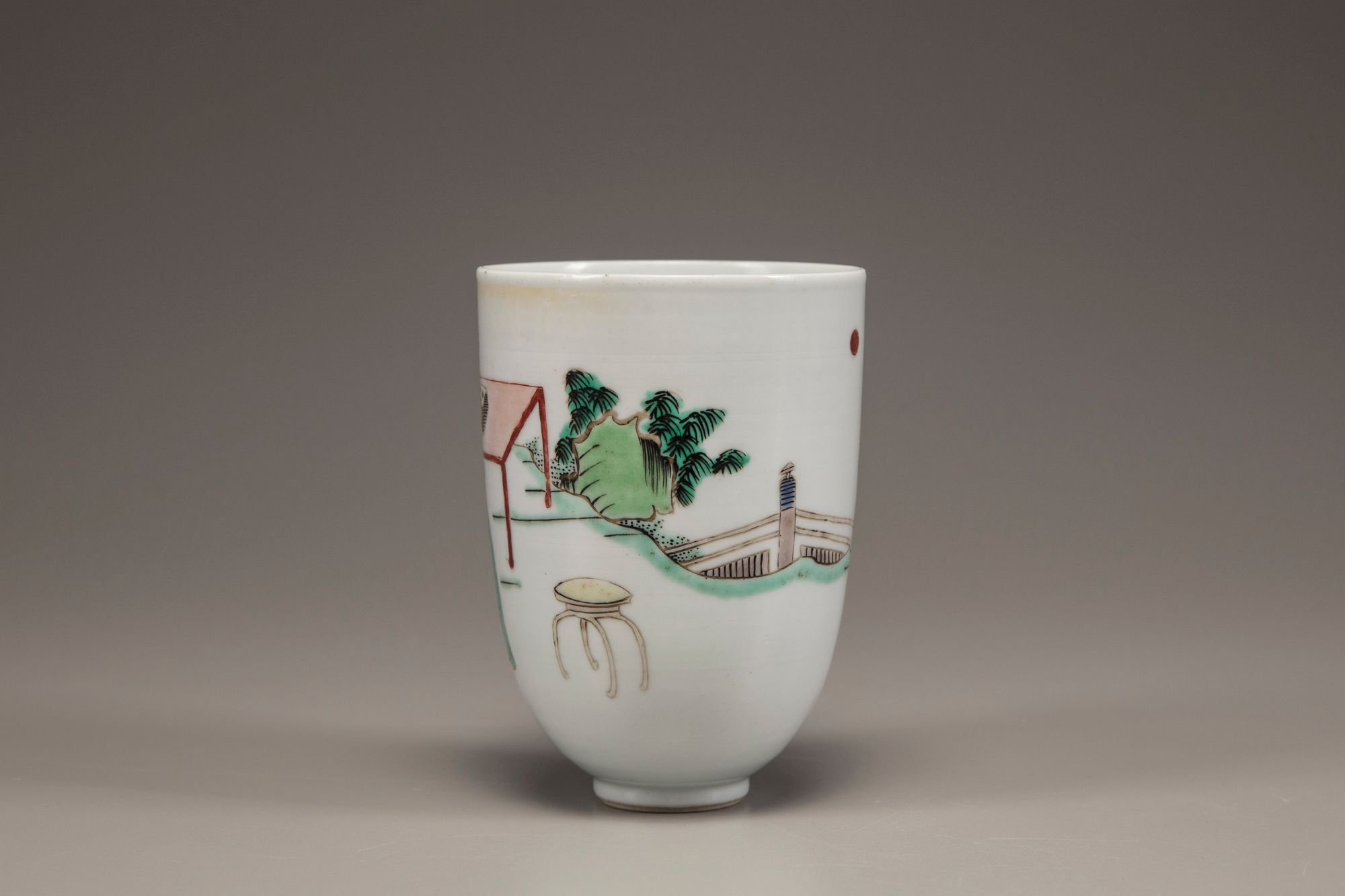 The exterior is decorated with a continuous scene of a seated scholar in front of a table with books and a further man, all in a fenced garden.