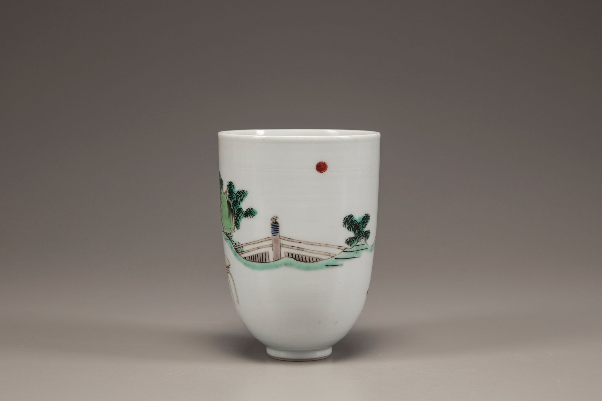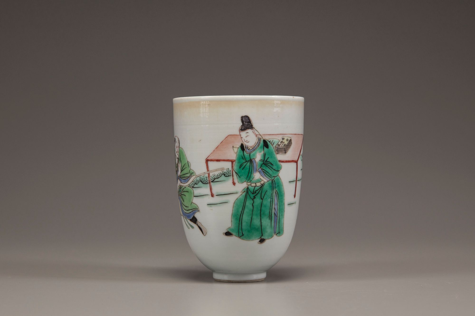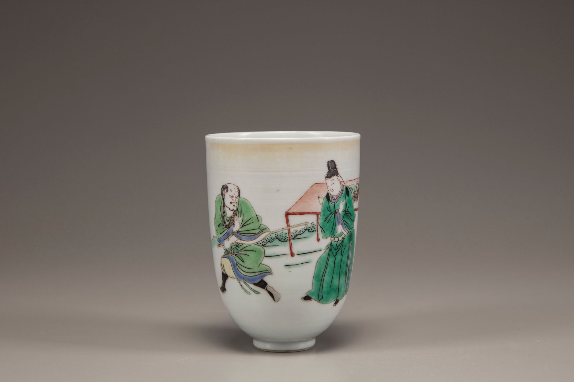 The exterior is decorated with a continuous scene of a seated scholar in front of a table with books and a further man, all in a fenced garden.