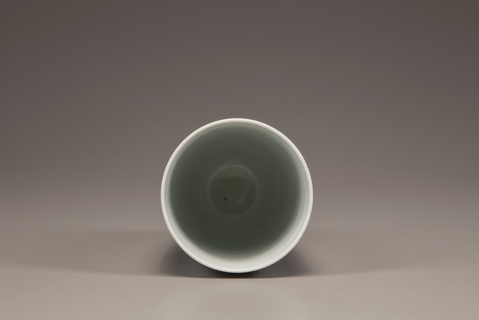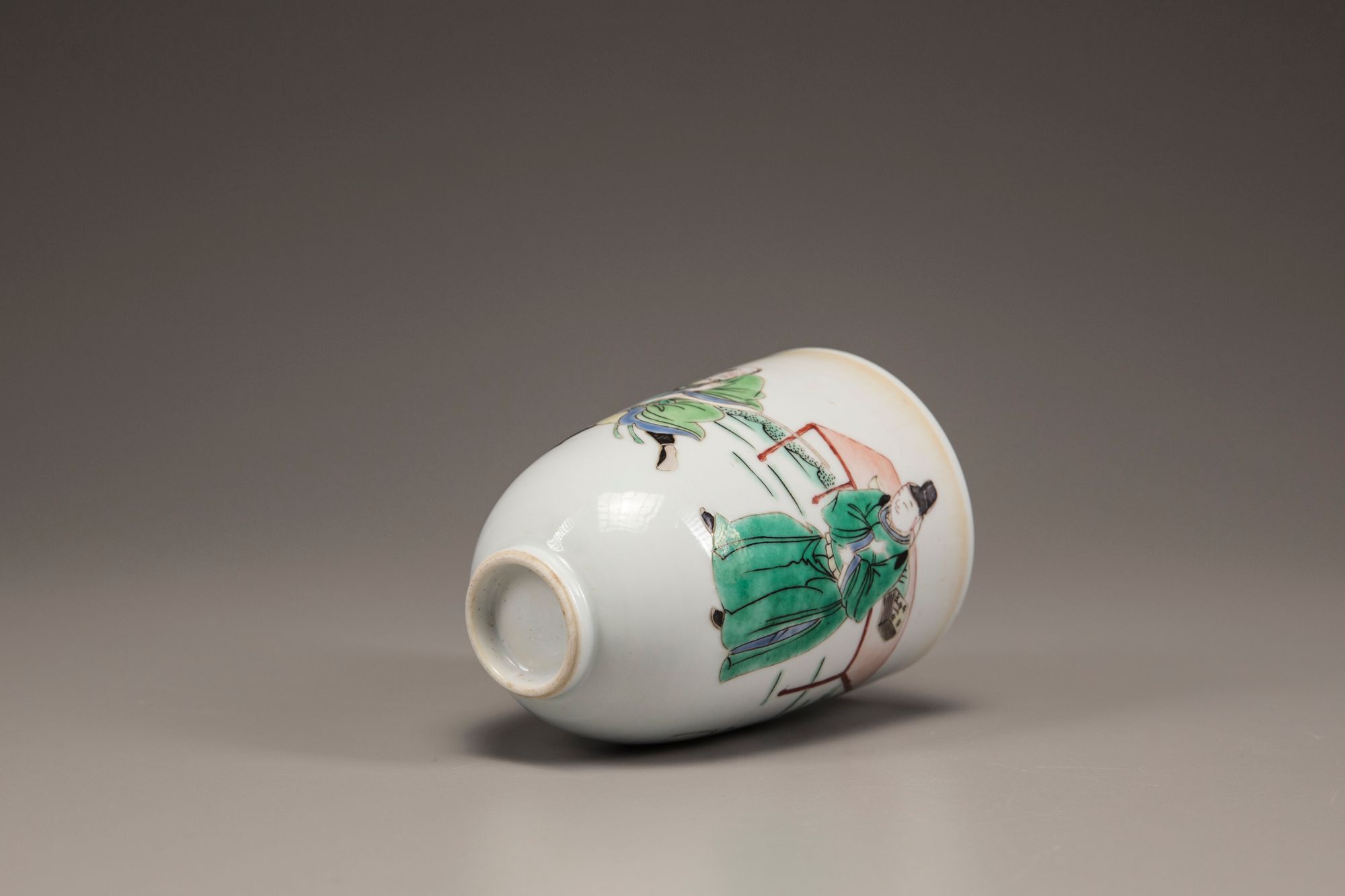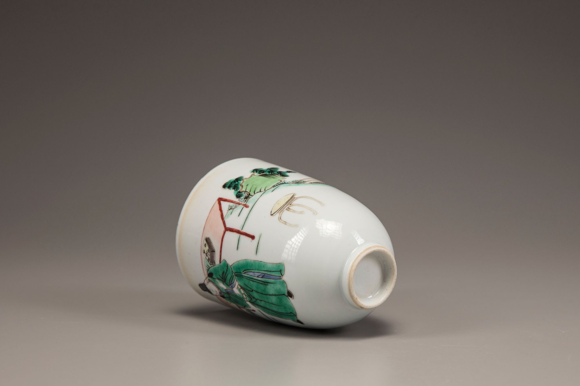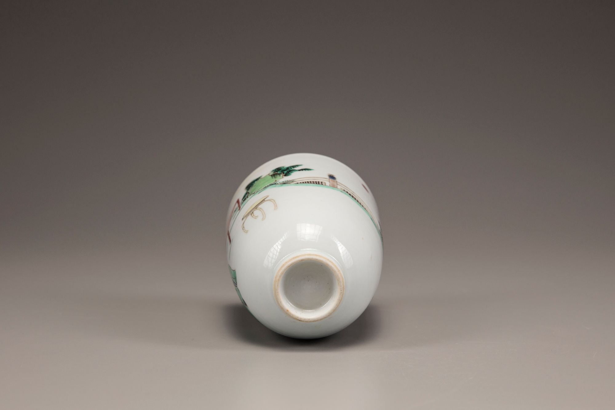 The exterior is decorated with a continuous scene of a seated scholar in front of a table with books and a further man, all in a fenced garden.